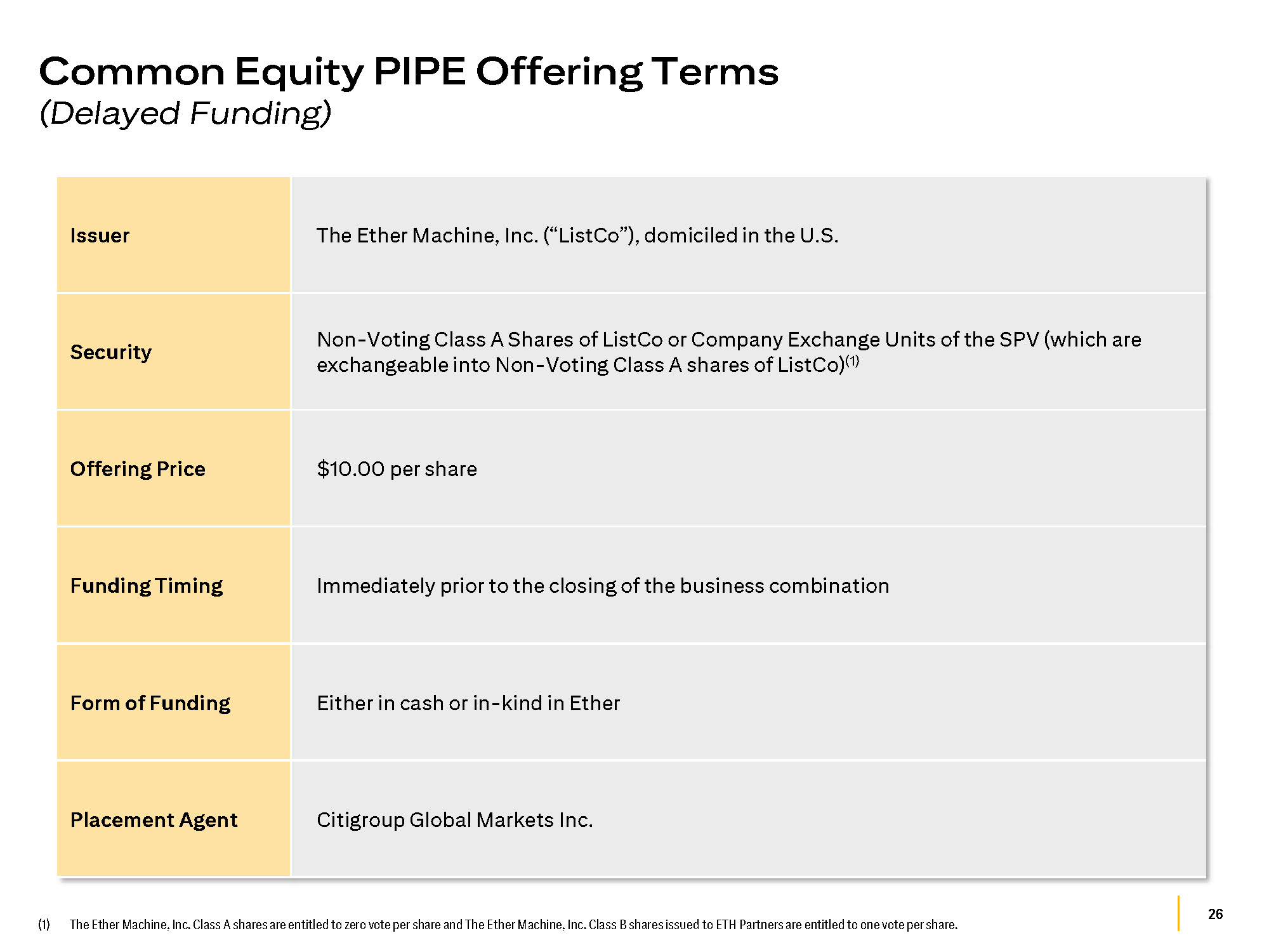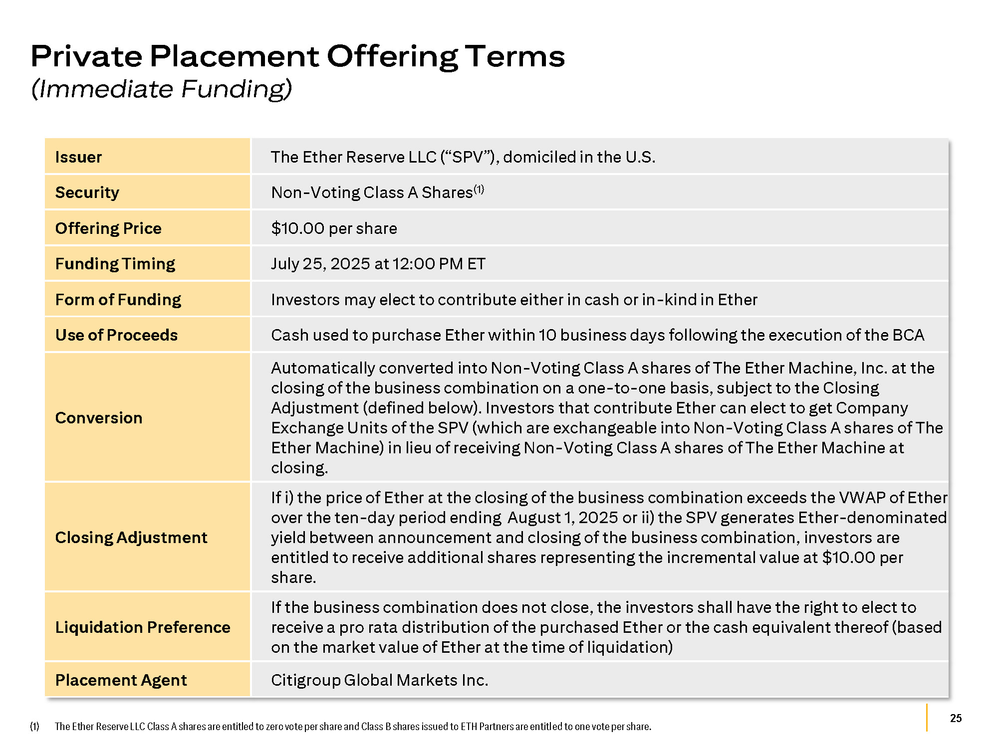 25 (1) The Ether Reserve LLC Class A shares are entitled to zero vote per share and Class B shares issued to ETH Partners are entitled to one vote per share. Private Placement Offering Terms (Immediate Funding) The Ether Reserve LLC (“SPV”), domiciled in the U.S. Issuer Non - Voting Class A Shares (1) Security $10.00 per share Offering Price July 25, 2025 at 12:00 PM ET Funding Timing Investors may elect to contribute either in cash or in - kind in Ether Form of Funding Cash used to purchase Ether within 10 business days following the execution of the BCA Use of Proceeds Automatically converted into Non - Voting Class A shares of The Ether Machine, Inc. at the closing of the business combination on a one - to - one basis, subject to the Closing Adjustment (defined below). Investors that contribute Ether can elect to get Company Exchange Units of the SPV (which are exchangeable into Non - Voting Class A shares of The Ether Machine) in lieu of receiving Non - Voting Class A shares of The Ether Machine at closing. Conversion If i) the price of Ether at the closing of the business combination exceeds the VWAP of Ether over the ten - day period ending August 1, 2025 or ii) the SPV generates Ether - denominated yield between announcement and closing of the business combination, investors are entitled to receive additional shares representing the incremental value at $10.00 per share. Closing Adjustment If the business combination does not close, the investors shall have the right to elect to receive a pro rata distribution of the purchased Ether or the cash equivalent thereof (based on the market value of Ether at the time of liquidation) Liquidation Preference Citigroup Global Markets Inc. Placement Agent