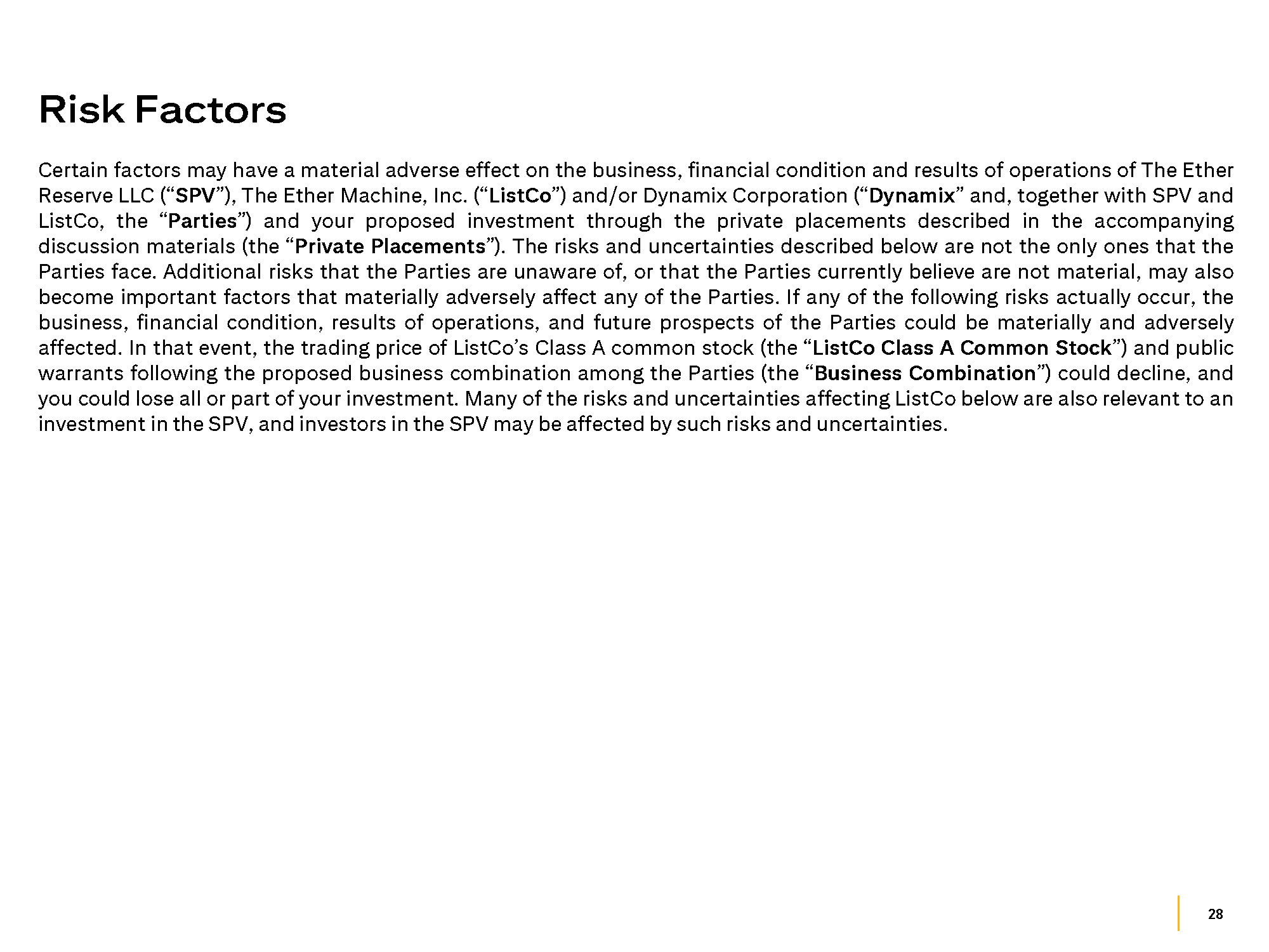 28 Certain factors may have a material adverse effect on the business, financial condition and results of operations of The Ether Reserve LLC (“ SPV ”), The Ether Machine, Inc . (“ ListCo ”) and/or Dynamix Corporation (“ Dynamix ” and, together with SPV and ListCo, the “ Parties ”) and your proposed investment through the private placements described in the accompanying discussion materials (the “ Private Placements ”) . The risks and uncertainties described below are not the only ones that the Parties face . Additional risks that the Parties are unaware of, or that the Parties currently believe are not material, may also become important factors that materially adversely affect any of the Parties . If any of the following risks actually occur, the business, financial condition, results of operations, and future prospects of the Parties could be materially and adversely affected . In that event, the trading price of ListCo’s Class A common stock (the “ ListCo Class A Common Stock ”) and public warrants following the proposed business combination among the Parties (the “ Business Combination ”) could decline, and you could lose all or part of your investment . Many of the risks and uncertainties affecting ListCo below are also relevant to an investment in the SPV, and investors in the SPV may be affected by such risks and uncertainties . Risk Factors