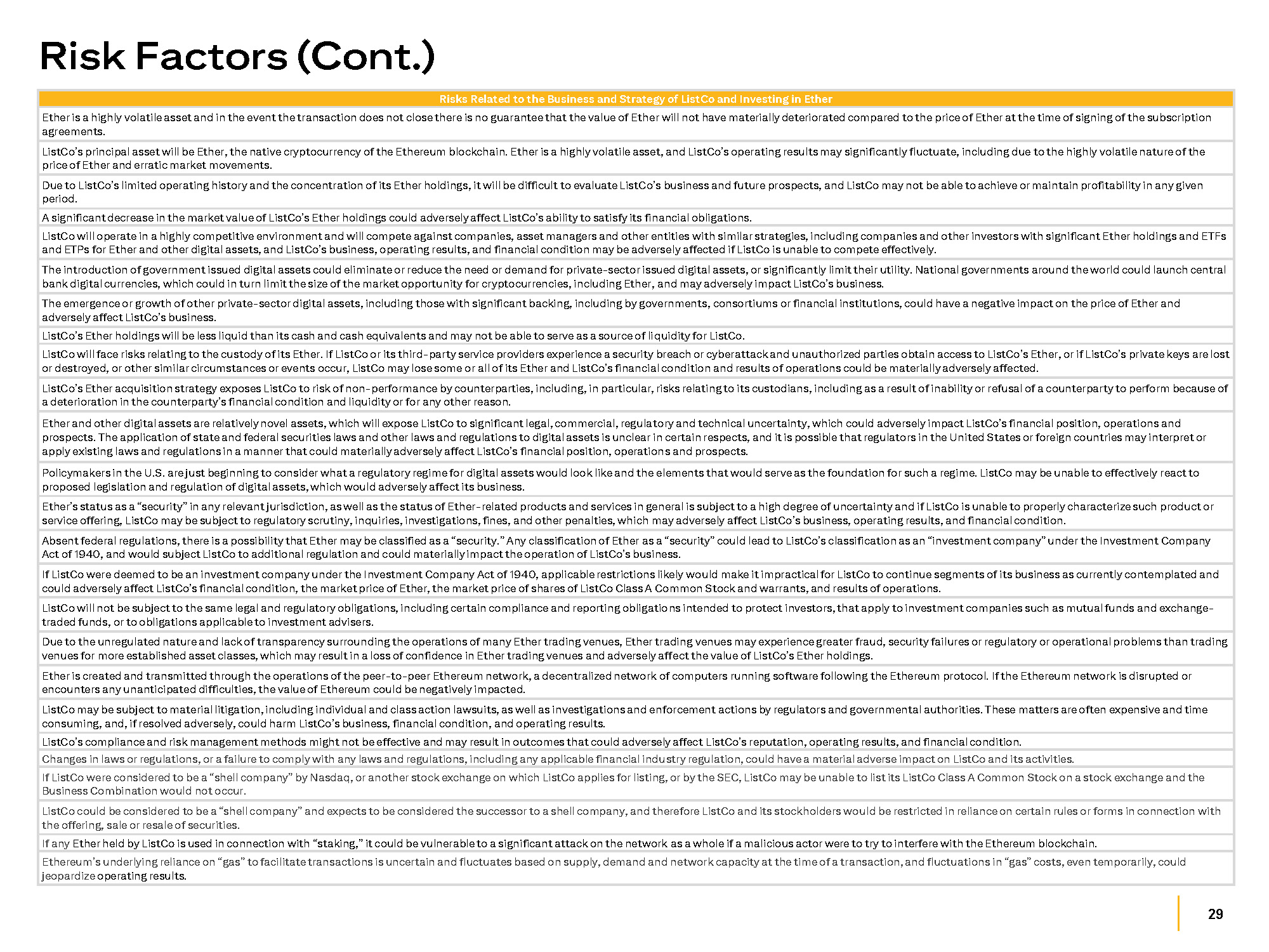 29 Risk Factors (Cont.) Risks Related to the Business and Strategy of ListCo and Investing in Ether Ether is a highly volatile asset and in the event the transaction does not close there is no guarantee that the value of Ether will not have materially deteriorated compared to the price of Ether at the time of signing of the subscription agreements. ListCo’s principal asset will be Ether, the native cryptocurrency of the Ethereum blockchain. Ether is a highly volatile asset, and ListCo’s operating results may significantly fluctuate, including due to the highly volatile nature of the price of Ether and erratic market movements. Due to ListCo’s limited operating history and the concentration of its Ether holdings, it will be difficult to evaluate ListCo’s business and future prospects, and ListCo may not be able to achieve or maintain profitability in any given period. A significant decrease in the market value of ListCo’s Ether holdings could adversely affect ListCo’s ability to satisfy its financial obligations. ListCo will operate in a highly competitive environment and will compete against companies, asset managers and other entities with similar strategies, including companies and other investors with significant Ether holdings and ETFs and ETPs for Ether and other digital assets, and ListCo’s business, operating results, and financial condition may be adversely affected if ListCo is unable to compete effectively. The introduction of government issued digital assets could eliminate or reduce the need or demand for private - sector issued digital assets, or significantly limit their utility. National governments around the world could launch central bank digital currencies, which could in turn limit the size of the market opportunity for cryptocurrencies, including Ether, and may adversely impact ListCo’s business. The emergence or growth of other private - sector digital assets, including those with significant backing, including by governments, consortiums or financial institutions, could have a negative impact on the price of Ether and adversely affect ListCo’s business. ListCo’s Ether holdings will be less liquid than its cash and cash equivalents and may not be able to serve as a source of liquidity for ListCo. ListCo will face risks relating to the custody of its Ether. If ListCo or its third - party service providers experience a security breach or cyberattack and unauthorized parties obtain access to ListCo’s Ether, or if ListCo’s private keys are lost or destroyed, or other similar circumstances or events occur, ListCo may lose some or all of its Ether and ListCo’s financial condition and results of operations could be materially adversely affected. ListCo’s Ether acquisition strategy exposes ListCo to risk of non - performance by counterparties, including, in particular, risks relating to its custodians, including as a result of inability or refusal of a counterparty to perform because of a deterioration in the counterparty’s financial condition and liquidity or for any other reason. Ether and other digital assets are relatively novel assets, which will expose ListCo to significant legal, commercial, regulatory and technical uncertainty, which could adversely impact ListCo’s financial position, operations and prospects. The application of state and federal securities laws and other laws and regulations to digital assets is unclear in certain respects, and it is possible that regulators in the United States or foreign countries may interpret or apply existing laws and regulations in a manner that could materially adversely affect ListCo’s financial position, operations and prospects. Policymakers in the U.S. are just beginning to consider what a regulatory regime for digital assets would look like and the elements that would serve as the foundation for such a regime. ListCo may be unable to effectively react to proposed legislation and regulation of digital assets, which would adversely affect its business. Ether’s status as a “security” in any relevant jurisdiction, as well as the status of Ether - related products and services in general is subject to a high degree of uncertainty and if ListCo is unable to properly characterize such product or service offering, ListCo may be subject to regulatory scrutiny, inquiries, investigations, fines, and other penalties, which may adversely affect ListCo’s business, operating results, and financial condition. Absent federal regulations, there is a possibility that Ether may be classified as a “security.” Any classification of Ether as a “security” could lead to ListCo’s classification as an “investment company” under the Investment Company Act of 1940, and would subject ListCo to additional regulation and could materially impact the operation of ListCo’s business. If ListCo were deemed to be an investment company under the Investment Company Act of 1940, applicable restrictions likely would make it impractical for ListCo to continue segments of its business as currently contemplated and could adversely affect ListCo’s financial condition, the market price of Ether, the market price of shares of ListCo Class A Common Stock and warrants, and results of operations. ListCo will not be subject to the same legal and regulatory obligations, including certain compliance and reporting obligations intended to protect investors, that apply to investment companies such as mutual funds and exchange - traded funds, or to obligations applicable to investment advisers. Due to the unregulated nature and lack of transparency surrounding the operations of many Ether trading venues, Ether trading venues may experience greater fraud, security failures or regulatory or operational problems than trading venues for more established asset classes, which may result in a loss of confidence in Ether trading venues and adversely affect the value of ListCo’s Ether holdings. Ether is created and transmitt