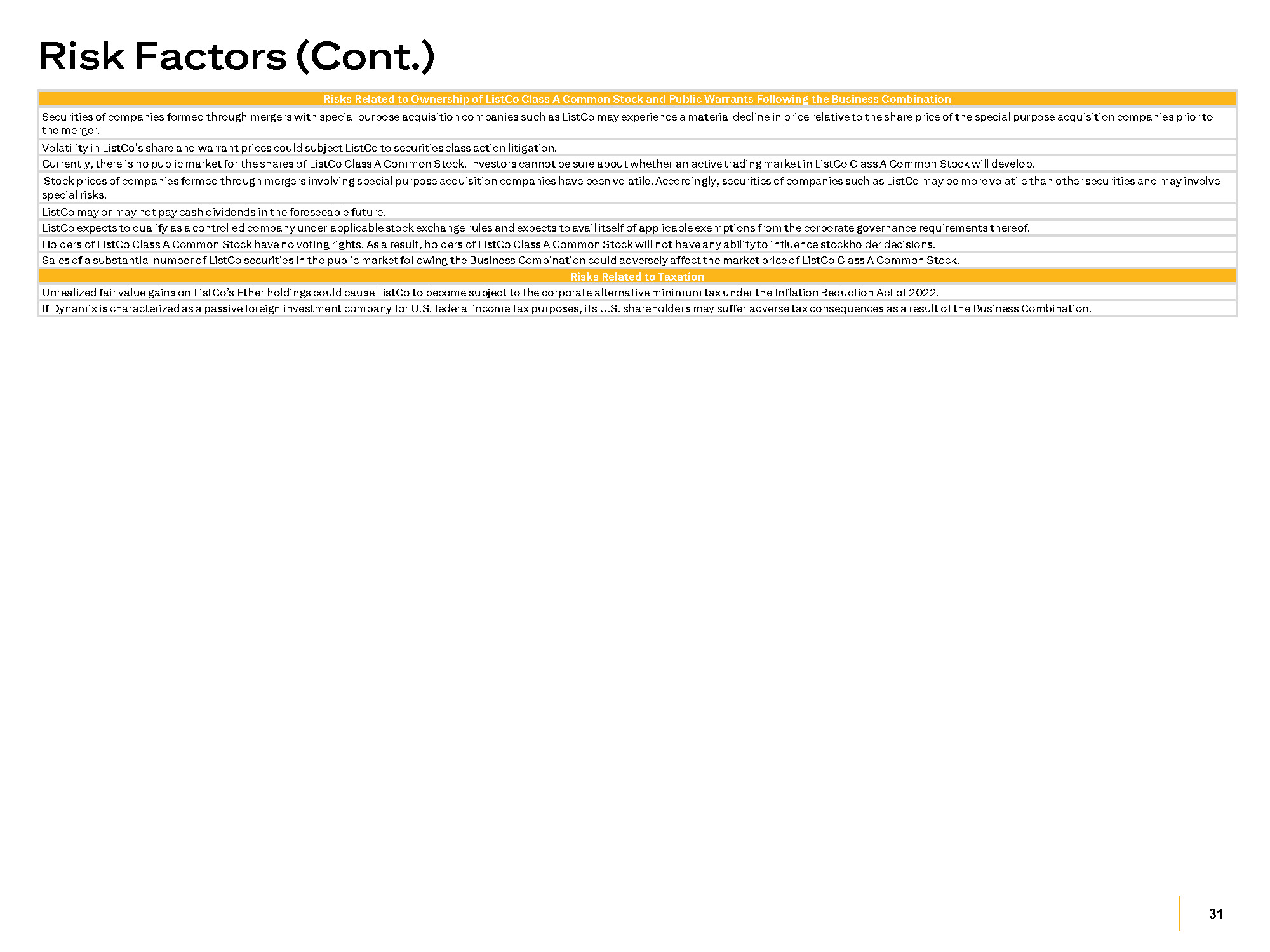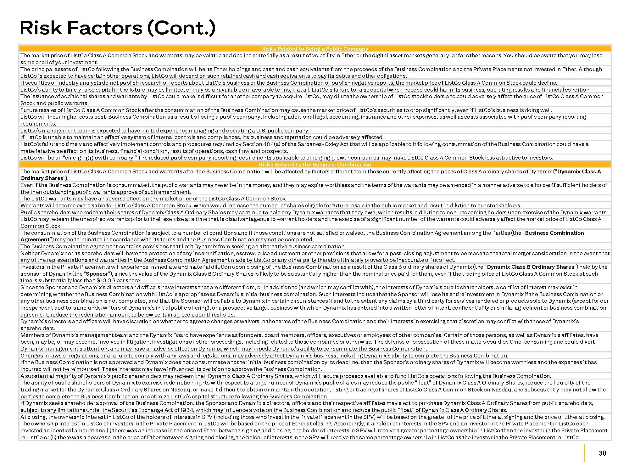 30 Risk Factors (Cont.) Risks Related to Being a Public Company The market price of ListCo Class A Common Stock and warrants may be volatile and decline materially as a result of volatility in Ether or the digital asset markets generally, or for other reasons. You should be aware that you may lose some or all of your investment. The principal assets of ListCo following the Business Combination will be its Ether holdings and cash and cash equivalents from the proceeds of the Business Combination and the Private Placements not invested in Ether. Although ListCo is expected to have certain other operations, ListCo will depend on such retained cash and cash equivalents to pay its debts and other obligations. If securities or industry analysts do not publish research or reports about ListCo’s business or the Business Combination or publish negative reports, the market price of ListCo Class A Common Stock could decline. ListCo’s ability to timely raise capital in the future may be limited, or may be unavailable on favorable terms, if at all. ListCo’s failure to raise capital when needed could harm its business, operating results and financial condition. The issuance of additional shares and warrants by ListCo could make it difficult for another company to acquire ListCo, may dilute the ownership of ListCo stockholders and could adversely affect the price of ListCo Class A Common Stock and public warrants. Future resales of ListCo Class A Common Stock after the consummation of the Business Combination may cause the market price of ListCo’s securities to drop significantly, even if ListCo’s business is doing well. ListCo will incur higher costs post - Business Combination as a result of being a public company, including additional legal, accounting, insurance and other expenses, as well as costs associated with public company reporting requirements. ListCo’s management team is expected to have limited experience managing and operating a U.S. public company. If ListCo is unable to maintain an effective system of internal controls and compliances, its business and reputation could be adversely affected. ListCo’s failure to timely and effectively implement controls and procedures required by Section 404(a) of the Sarbanes - Oxley Act that will be applicable to it following consummation of the Business Combination could have a material adverse effect on its business, financial condition, results of operations, cash flow and prospects. ListCo will be an “emerging growth company.” The reduced public company reporting requirements applicable to emerging growth companies may make ListCo Class A Common Stock less attractive to investors. Risks Related to the Business Combination The market price of ListCo Class A Common Stock and warrants after the Business Combination will be affected by factors different from those currently affecting the prices of Class A ordinary shares of Dynamix (“ Dynamix Class A Ordinary Shares ”). Even if the Business Combination is consummated, the public warrants may never be in the money, and they may expire worthless and the terms of the warrants may be amended in a manner adverse to a holder if sufficient holders of the then outstanding public warrants approve of such amendment. The ListCo warrants may have an adverse effect on the market price of the ListCo Class A Common Stock. Warrants will become exercisable for ListCo Class A Common Stock, which would increase the number of shares eligible for future resale in the public market and result in dilution to our stockholders. Public shareholders who redeem their shares of Dynamix Class A Ordinary Shares may continue to hold any Dynamix warrants that they own, which results in dilution to non - redeeming holders upon exercise of the Dynamix warrants. ListCo may redeem the unexpired warrants prior to their exercise at a time that is disadvantageous to warrant holders and the exercise of a significant number of the warrants could adversely affect the market price of ListCo Class A Common Stock. The consummation of the Business Combination is subject to a number of conditions and if those conditions are not satisfied or waived, the Business Combination Agreement among the Parties (the “ Business Combination Agreement ”) may be terminated in accordance with its terms and the Business Combination may not be completed. The Business Combination Agreement contains provisions that limit Dynamix from seeking an alternative business combination. Neither Dynamix nor its shareholders will have the protection of any indemnification, escrow, price adjustment or other provisions that allow for a post - closing adjustment to be made to the total merger consideration in the event that any of the representations and warranties in the Business Combination Agreement made by ListCo or any other party thereto ultimately proves to be inaccurate or incorrect. Investors in the Private Placements will experience immediate and material dilution upon closing of the Business Combination as a result of the Class B ordinary shares of Dynamix (the “ Dynamix Class B Ordinary Shares ”) held by the sponsor of Dynamix (the “ Sponsor ”), since the value of the Dynamix Class B Ordinary Shares is likely to be substantially higher than the nominal price paid for them, even if the trading price of ListCo Class A Common Stock at such time is substantially less than $10.00 per share. Since the Sponsor and Dynamix’s directors and officers have interests that are different from, or in addition to (and which may conflict with), the interests of Dynamix’s public shareholders, a conflict of interest may exist in determining whether the Business Combination with ListCo is appropriate as Dynamix’s initial business combination. Such interests include that the Sponsor will lose its entire investment in Dynamix if the Business Combination or any other business combination is not completed, and that the Sponsor will be liable to Dynamix in