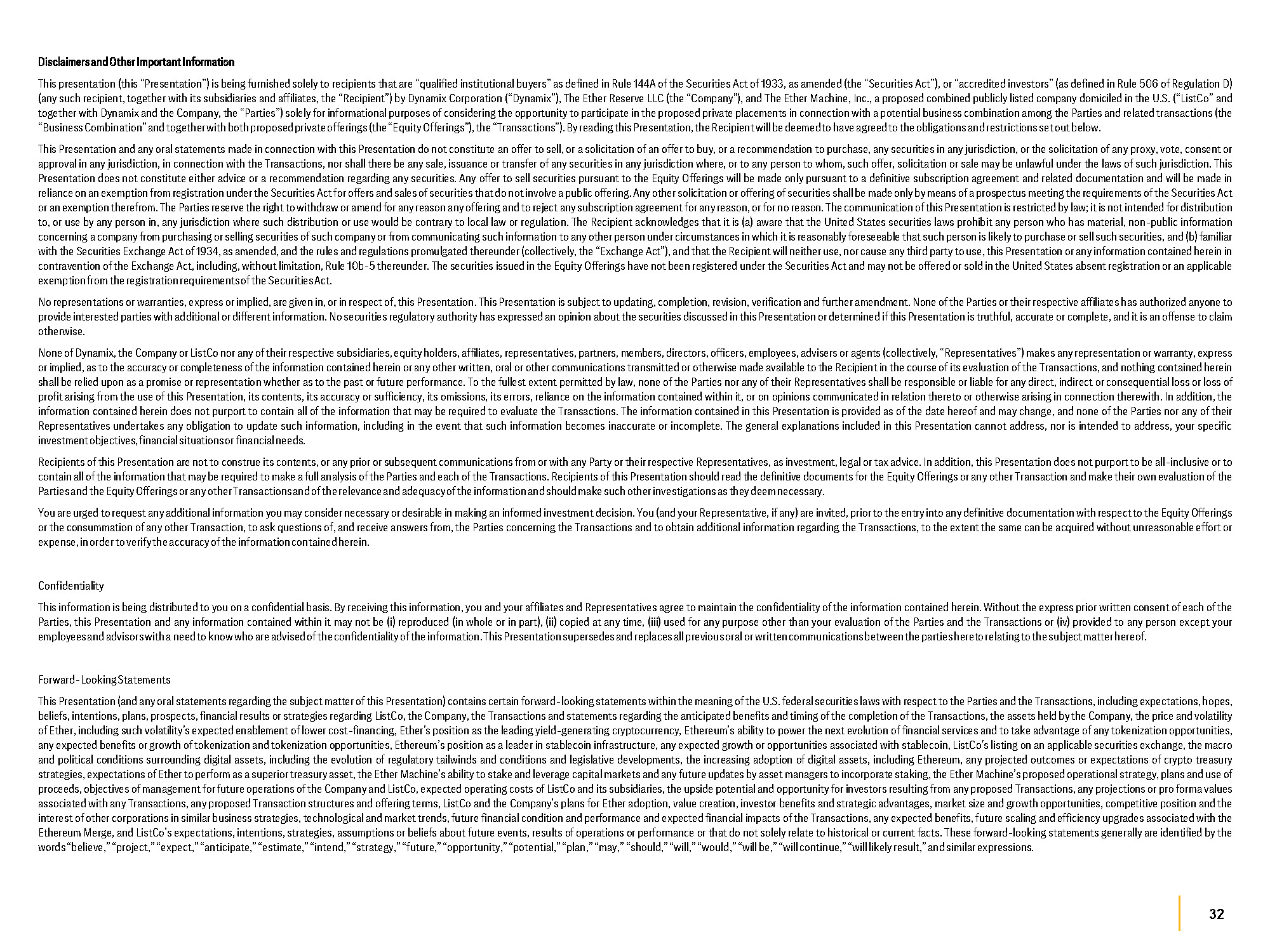 32 Disclaimers and Other Important Information This presentation (this “Presentation”) is being furnished solely to recipients that are “qualified institutional buyers” as defined in Rule 144 A of the Securities Act of 1933 , as amended (the “Securities Act”), or “accredited investors” (as defined in Rule 506 of Regulation D) (any such recipient, together with its subsidiaries and affiliates, the “Recipient”) by Dynamix Corporation (“Dynamix”), The Ether Reserve LLC (the “Company”), and The Ether Machine, Inc . , a proposed combined publicly listed company domiciled in the U . S . (“ListCo” and together with Dynamix and the Company, the “Parties”) solely for informational purposes of considering the opportunity to participate in the proposed private placements in connection with a potential business combination among the Parties and related transactions (the “Business Combination” and together with both proposed private offerings (the “Equity Offerings”), the “Transactions”) . By readingthis Presentation, the Recipient willbedeemedto have agreedto the obligations andrestrictionsset out below . This Presentation and any oral statements made in connection with this Presentation do not constitute an offer to sell, or a solicitation of an offer to buy, or a recommendation to purchase, any securities in any jurisdiction, or the solicitation of any proxy, vote, consent or approval in any jurisdiction, in connection with the Transactions, nor shall there be any sale, issuance or transfer of any securities in any jurisdiction where, or to any person to whom, such offer, solicitation or sale may be unlawful under the laws of such jurisdiction . This Presentation does not constitute either advice or a recommendation regarding any securities . Any offer to sell securities pursuant to the Equity Offerings will be made only pursuant to a definitive subscription agreement and related documentation and will be made in reliance on an exemption from registration under the Securities Act for offers and sales of securities thatdo not involve a public offering . Any other solicitation or offering of securities shall be made only by means of a prospectus meeting the requirements of the Securities Act or an exemption therefrom . The Parties reserve the right to withdraw or amend for any reason any offering and to reject any subscription agreement for any reason, or for no reason . The communication of this Presentation is restricted by law ; it is not intended for distribution to, or use by any person in, any jurisdiction where such distribution or use would be contrary to local law or regulation . The Recipient acknowledges that it is (a) aware that the United States securities laws prohibit any person who has material, non - public information concerning a company from purchasing or selling securities of such company or from communicating such information to any other person under circumstances in which it is reasonably foreseeable that such person is likely to purchase or sell such securities, and (b) familiar with the Securities Exchange Act of 1934 , as amended, and the rules and regulations promulgated thereunder (collectively, the “Exchange Act”), and that the Recipient will neither use, nor cause any third party to use, this Presentation or any information contained herein in contravention of the Exchange Act, including, without limitation, Rule 10 b - 5 thereunder . The securities issued in the Equity Offerings have not been registered under the Securities Act and may not be offered or sold in the United States absent registration or an applicable exemptionfrom the registration requirementsof the SecuritiesAct . No representations or warranties, express or implied, are given in, or in respect of, this Presentation . This Presentation is subject to updating, completion, revision, verification and further amendment . None of the Parties or their respective affiliates has authorized anyone to provide interested parties with additional or different information . No securities regulatory authority has expressed an opinion about the securities discussed in this Presentation or determined if this Presentation is truthful, accurate or complete, and it is an offense to claim otherwise . None of Dynamix, the Company or ListCo nor any of their respective subsidiaries, equity holders, affiliates, representatives, partners, members, directors, officers, employees, advisers or agents (collectively, “Representatives”) makes any representation or warranty, express or implied, as to the accuracy or completeness of the information contained herein or any other written, oral or other communications transmitted or otherwise made available to the Recipient in the course of its evaluation of the Transactions, and nothing contained herein shall be relied upon as a promise or representation whether as to the past or future performance . To the fullest extent permitted by law, none of the Parties nor any of their Representatives shall be responsible or liable for any direct, indirect or consequential loss or loss of profit arising from the use of this Presentation, its contents, its accuracy or sufficiency, its omissions, its errors, reliance on the information contained within it, or on opinions communicated in relation thereto or otherwise arising in connection therewith . In addition, the information contained herein does not purport to contain all of the information that may be required to evaluate the Transactions . The information contained in this Presentation is provided as of the date hereof and may change, and none of the Parties nor any of their Representatives undertakes any obligation to update such information, including in the event that such information becomes inaccurate or incomplete . The general explanations included in this Presentation cannot address, nor is intended to address, your specific investment objectives, financial situationsor financial 
