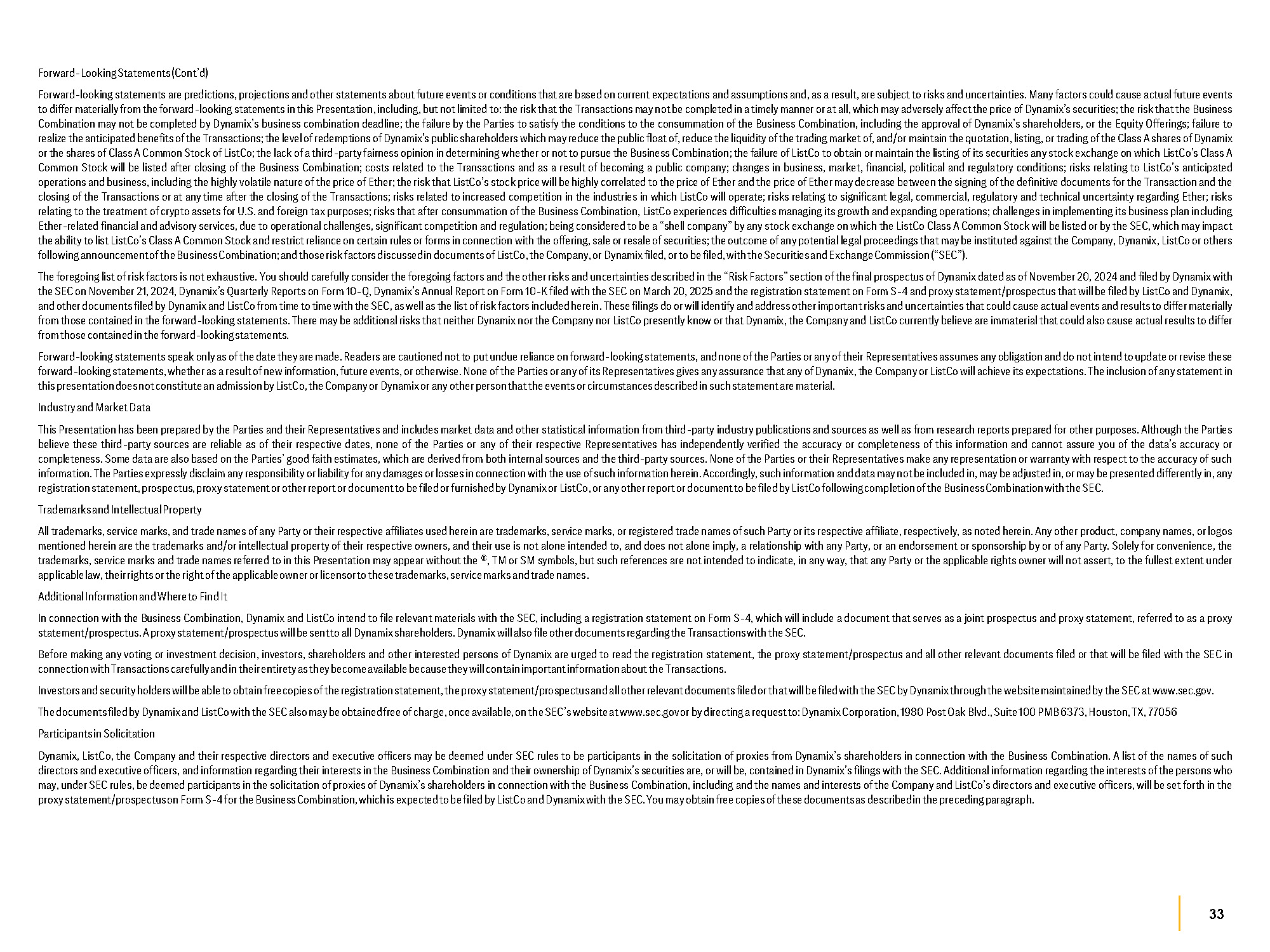 33 Forward - LookingStatements(Cont’d) Forward - looking statements are predictions, projections and other statements about future events or conditions that are based on current expectations and assumptions and, as a result, are subject to risks and uncertainties . Many factors could cause actual future events to differ materially from the forward - looking statements in this Presentation, including, but not limited to : the risk that the Transactions may not be completed in a timely manner or at all, which may adversely affect the price of Dynamix’s securities ; the risk that the Business Combination may not be completed by Dynamix’s business combination deadline ; the failure by the Parties to satisfy the conditions to the consummation of the Business Combination, including the approval of Dynamix’s shareholders, or the Equity Offerings ; failure to realize the anticipated benefits of the Transactions ; the level of redemptions of Dynamix’s public shareholders which may reduce the public float of, reduce the liquidity of the trading market of, and/or maintain the quotation, listing, or trading of the Class A shares of Dynamix or the shares of Class A Common Stock of ListCo ; the lack of a third - party fairness opinion in determining whether or not to pursue the Business Combination ; the failure of ListCo to obtain or maintain the listing of its securities any stock exchange on which ListCo's Class A Common Stock will be listed after closing of the Business Combination ; costs related to the Transactions and as a result of becoming a public company ; changes in business, market, financial, political and regulatory conditions ; risks relating to ListCo’s anticipated operations and business, including the highly volatile nature of the price of Ether ; the risk that ListCo’s stock price will be highly correlated to the price of Ether and the price of Ether may decrease between the signing of the definitive documents for the Transaction and the closing of the Transactions or at any time after the closing of the Transactions ; risks related to increased competition in the industries in which ListCo will operate ; risks relating to significant legal, commercial, regulatory and technical uncertainty regarding Ether ; risks relating to the treatment of crypto assets for U . S . and foreign tax purposes ; risks that after consummation of the Business Combination, ListCo experiences difficulties managing its growth and expanding operations ; challenges in implementing its business plan including Ether - related financial and advisory services, due to operational challenges, significant competition and regulation ; being considered to be a “shell company” by any stock exchange on which the ListCo Class A Common Stock will be listed or by the SEC, which may impact the ability to list ListCo's Class A Common Stock and restrict reliance on certain rules or forms in connection with the offering, sale or resale of securities ; the outcome of any potential legal proceedings that may be instituted against the Company, Dynamix, ListCo or others followingannouncement of the BusinessCombination ; and those risk factors discussedin documents of ListCo, the Company, or Dynamix filed, or to be filed, with the Securitiesand ExchangeCommission (“SEC”) . The foregoing list of risk factors is not exhaustive . You should carefully consider the foregoing factors and the other risks and uncertainties described in the “Risk Factors” section of the final prospectus of Dynamix dated as of November 20 , 2024 and filed by Dynamix with the SEC on November 21 , 2024 , Dynamix’s Quarterly Reports on Form 10 - Q, Dynamix’s Annual Report on Form 10 - K filed with the SEC on March 20 , 2025 and the registration statement on Form S - 4 and proxy statement/prospectus that will be filed by ListCo and Dynamix, and other documents filed by Dynamix and ListCo from time to time with the SEC, as well as the list of risk factors included herein . These filings do or will identify and address other important risks and uncertainties that could cause actual events and results to differ materially from those contained in the forward - looking statements . There may be additional risks that neither Dynamix nor the Company nor ListCo presently know or that Dynamix, the Company and ListCo currently believe are immaterial that could also cause actual results to differ from those containedin the forward - lookingstatements . Forward - looking statements speak only as of the date they are made . Readers are cautioned not to put undue reliance on forward - looking statements, andnone of the Parties or any of their Representatives assumes any obligation anddo not intend to update or revise these forward - looking statements, whether as a result of new information, future events, or otherwise . None of the Parties or any of its Representatives gives any assurance that any of Dynamix, the Company or ListCo will achieve its expectations . The inclusion of anystatement in this presentation does not constitutean admission by ListCo, the Company or Dynamix or any other person that the events or circumstancesdescribedin suchstatement are material . Industryand Market Data This Presentation has been prepared by the Parties and their Representatives and includes market data and other statistical information from third - party industry publications and sources as well as from research reports prepared for other purposes . Although the Parties believe these third - party sources are reliable as of their respective dates, none of the Parties or any of their respective Representatives has independently verified the accuracy or completeness of this information and cannot assure you of the data’s accuracy or completeness . Some data are also based on the Parties’ good faith estimates, which are derived from both internal sources and the third - party sources . None of the Parties or their Representatives make any representation