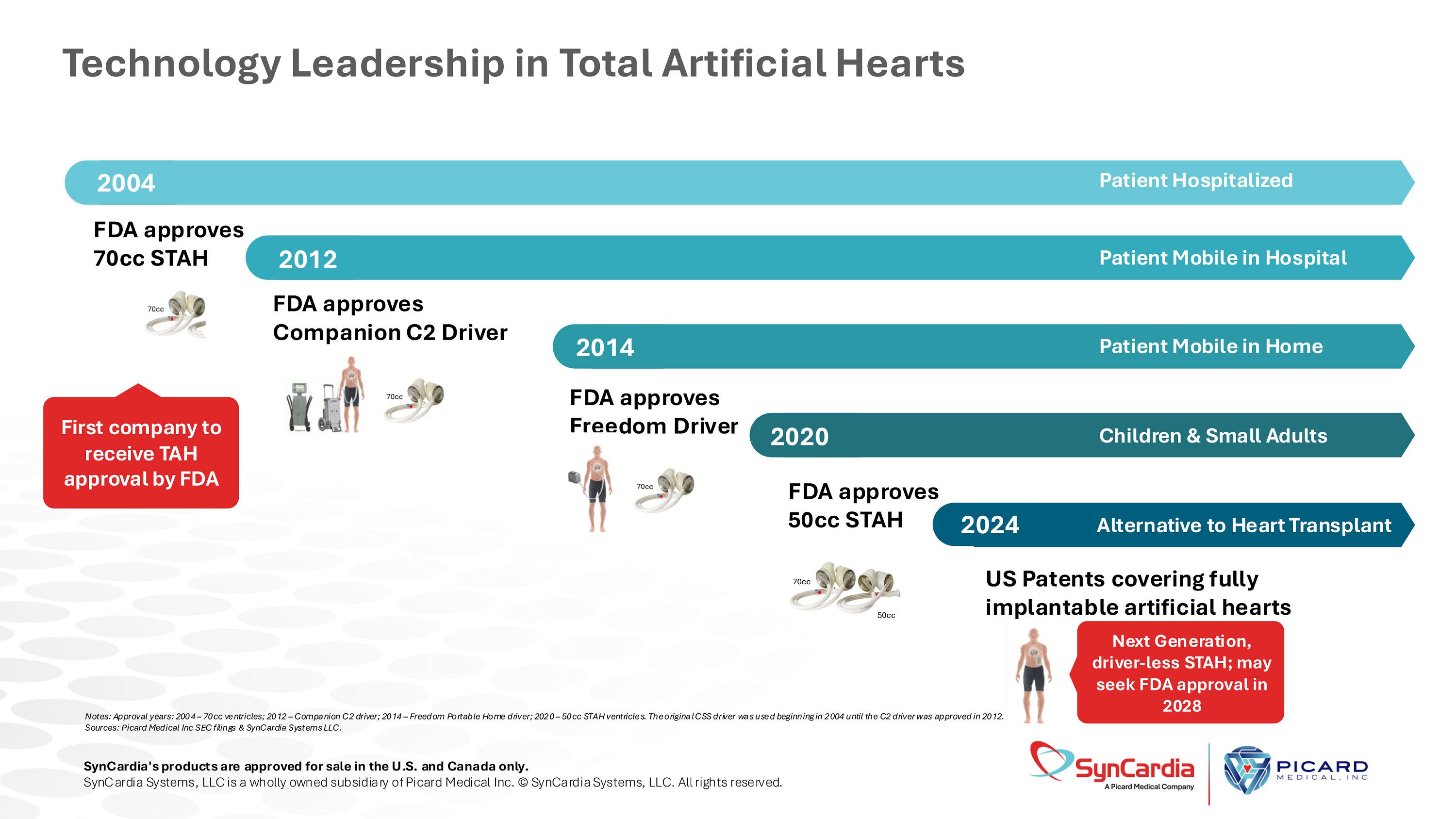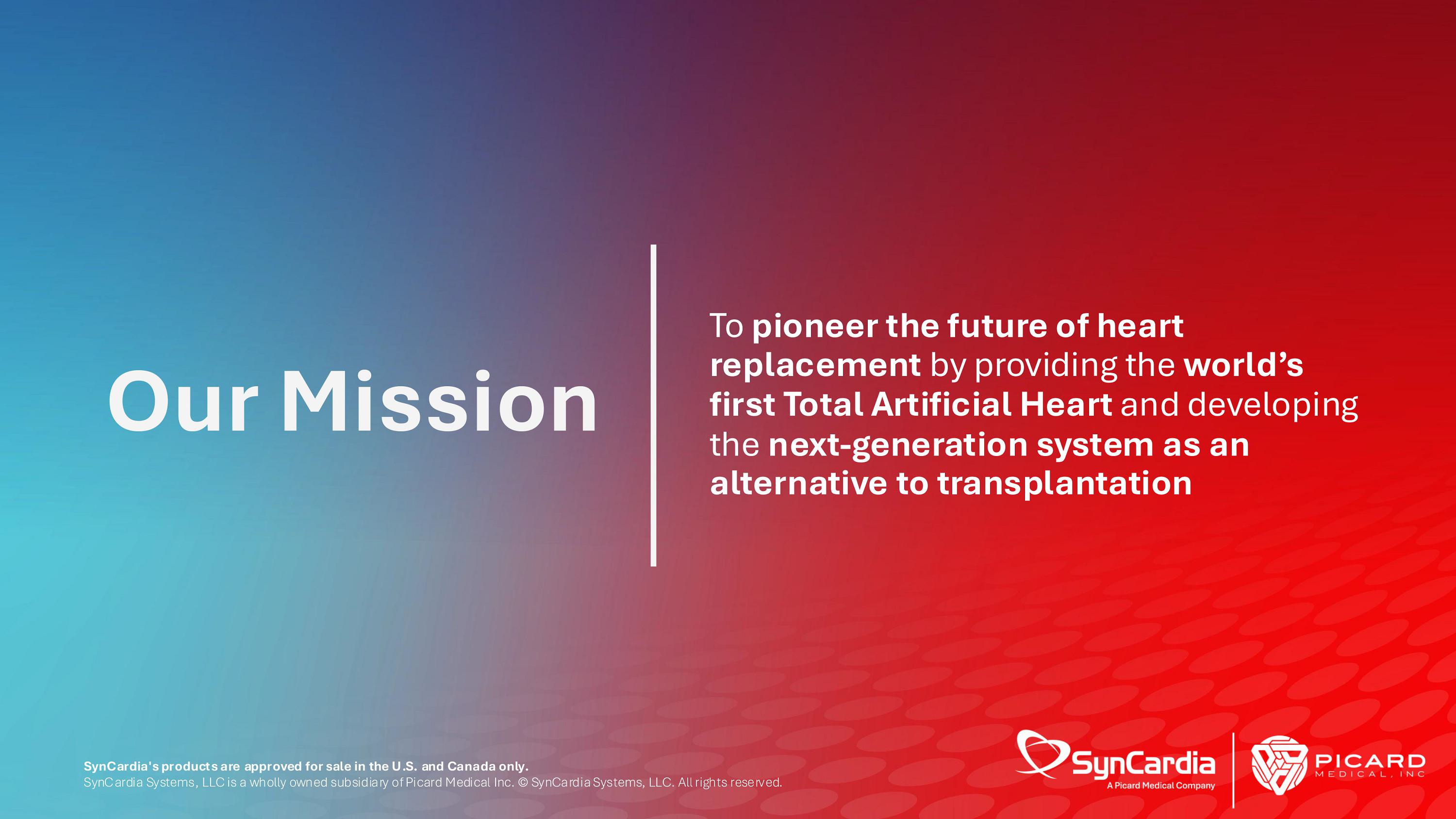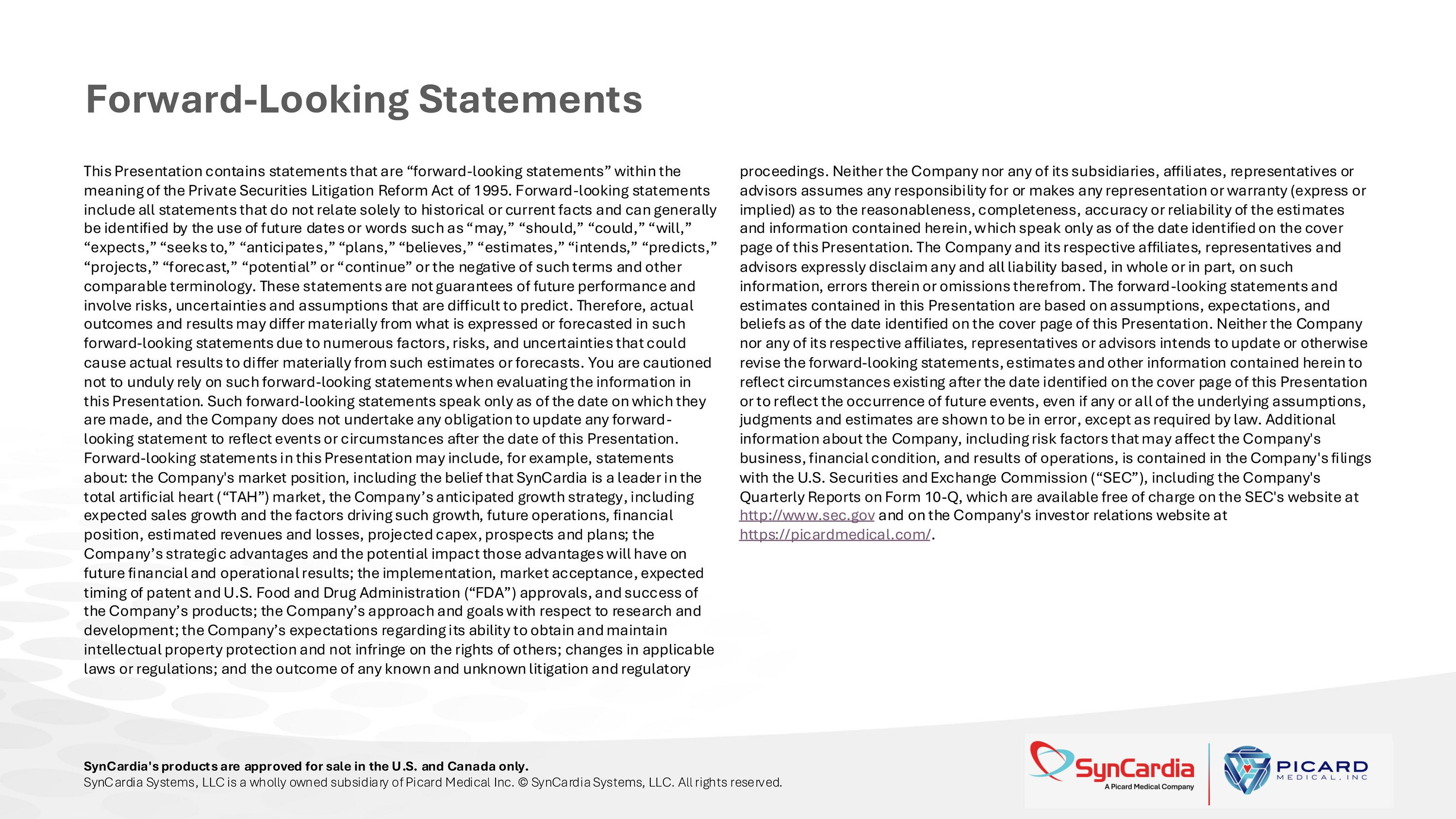 This Presentation contains statements that are “forward - looking statements” within the meaning of the Private Securities Litigation Reform Act of 1995. Forward - looking statements include all statements that do not relate solely to historical or current facts and can generally be identified by the use of future dates or words such as “may,” “should,” “could,” “will,” “expects,” “seeks to,” “anticipates,” “plans,” “believes,” “estimates,” “intends,” “predicts,” “projects,” “forecast,” “potential” or “continue” or the negative of such terms and other comparable terminology. These statements are not guarantees of future performance and involve risks, uncertainties and assumptions that are difficult to predict. Therefore, actual outcomes and results may differ materially from what is expressed or forecasted in such forward - looking statements due to numerous factors, risks, and uncertainties that could cause actual results to differ materially from such estimates or forecasts. You are cautioned not to unduly rely on such forward - looking statements when evaluating the information in this Presentation. Such forward - looking statements speak only as of the date on which they are made, and the Company does not undertake any obligation to update any forward - looking statement to reflect events or circumstances after the date of this Presentation. Forward - looking statements in this Presentation may include, for example, statements about: the Company's market position, including the belief that SynCardia is a leader in the total artificial heart (“TAH”) market, the Company’s anticipated growth strategy, including expected sales growth and the factors driving such growth, future operations, financial position, estimated revenues and losses, projected capex, prospects and plans; the Company’s strategic advantages and the potential impact those advantages will have on future financial and operational results; the implementation, market acceptance, expected timing of patent and U.S. Food and Drug Administration (“FDA”) approvals, and success of the Company’s products; the Company’s approach and goals with respect to research and development; the Company’s expectations regarding its ability to obtain and maintain intellectual property protection and not infringe on the rights of others; changes in applicable laws or regulations; and the outcome of any known and unknown litigation and regulatory proceedings. Neither the Company nor any of its subsidiaries, affiliates, representatives or advisors assumes any responsibility for or makes any representation or warranty (express or implied) as to the reasonableness, completeness, accuracy or reliability of the estimates and information contained herein, which speak only as of the date identified on the cover page of this Presentation. The Company and its respective affiliates, representatives and advisors expressly disclaim any and all liability based, in whole or in part, on such information, errors therein or omissions therefrom. The forward - looking statements and estimates contained in this Presentation are based on assumptions, expectations, and beliefs as of the date identified on the cover page of this Presentation. Neither the Company nor any of its respective affiliates, representatives or advisors intends to update or otherwise revise the forward - looking statements, estimates and other information contained herein to reflect circumstances existing after the date identified on the cover page of this Presentation or to reflect the occurrence of future events, even if any or all of the underlying assumptions, judgments and estimates are shown to be in error, except as required by law. Additional information about the Company, including risk factors that may affect the Company's business, financial condition, and results of operations, is contained in the Company's filings with the U.S. Securities and Exchange Commission (“SEC”), including the Company's Quarterly Reports on Form 10 - Q, which are available free of charge on the SEC's website at http://www.sec.gov and on the Company's investor relations website at https://picardmedical.com/ . SynCardia's products are approved for sale in the U.S. and Canada only. SynCardia Systems, LLC is a wholly owned subsidiary of Picard Medical Inc. © SynCardia Systems, LLC. All rights reserved. Forward - Looking Statements