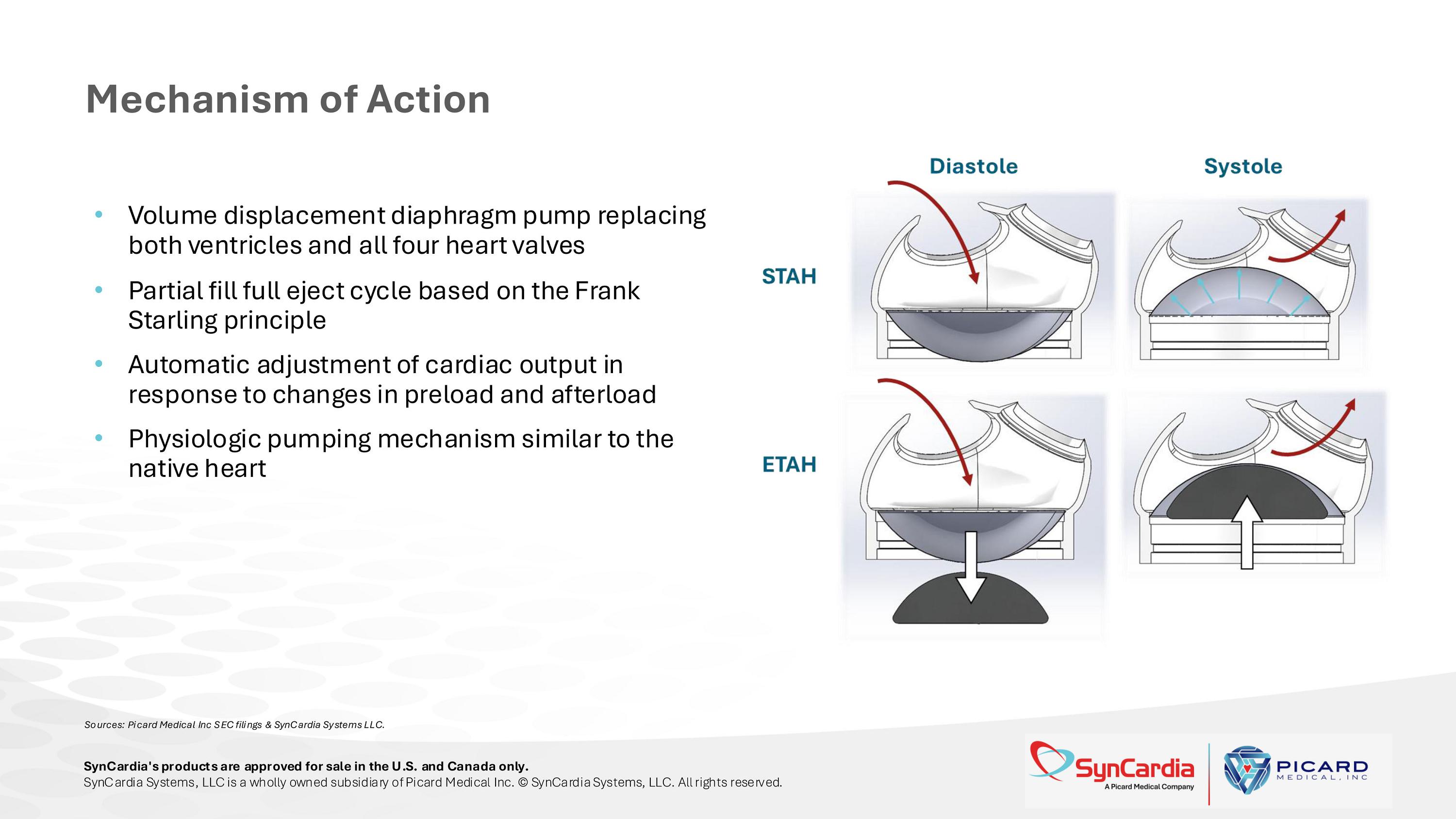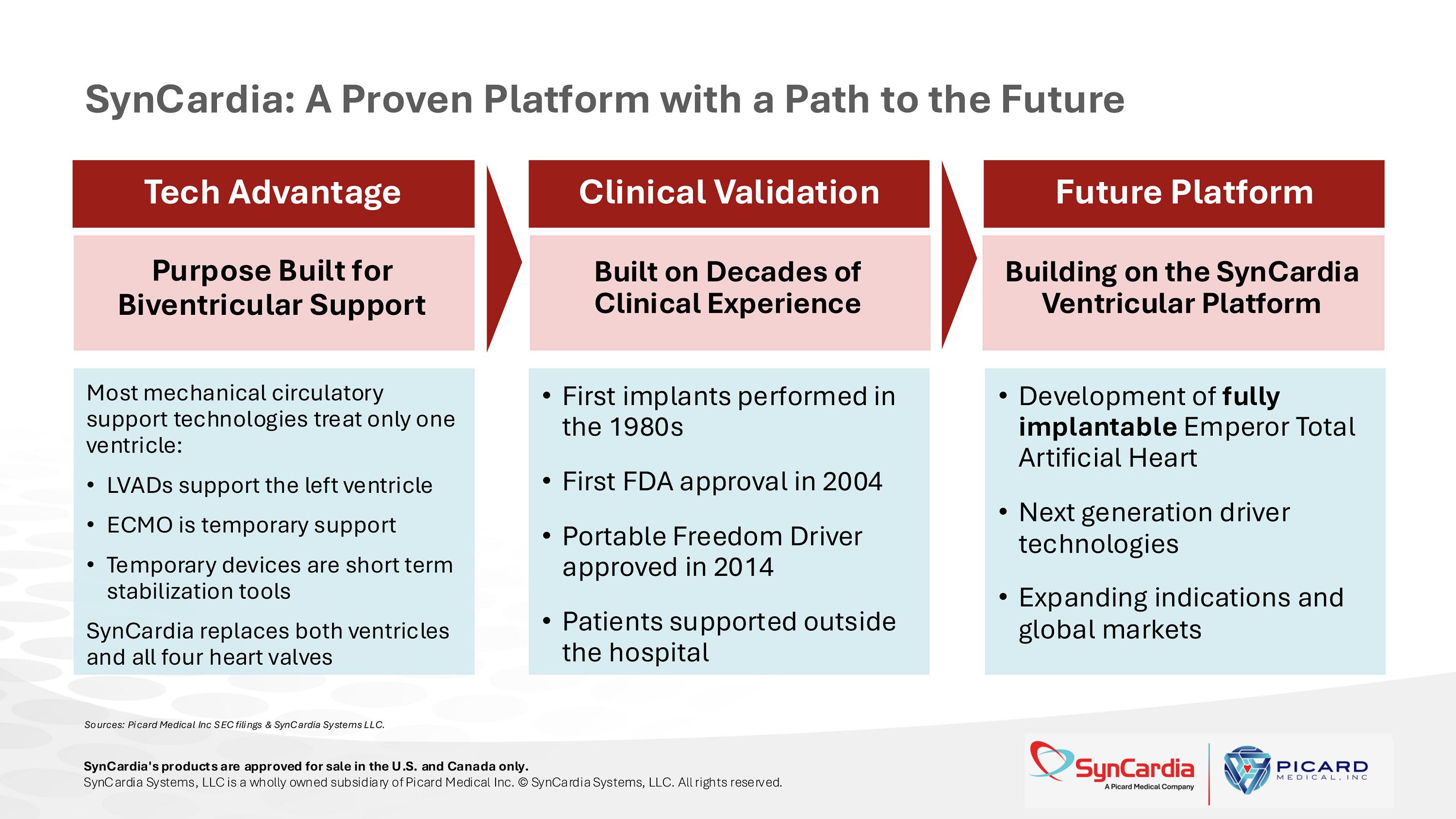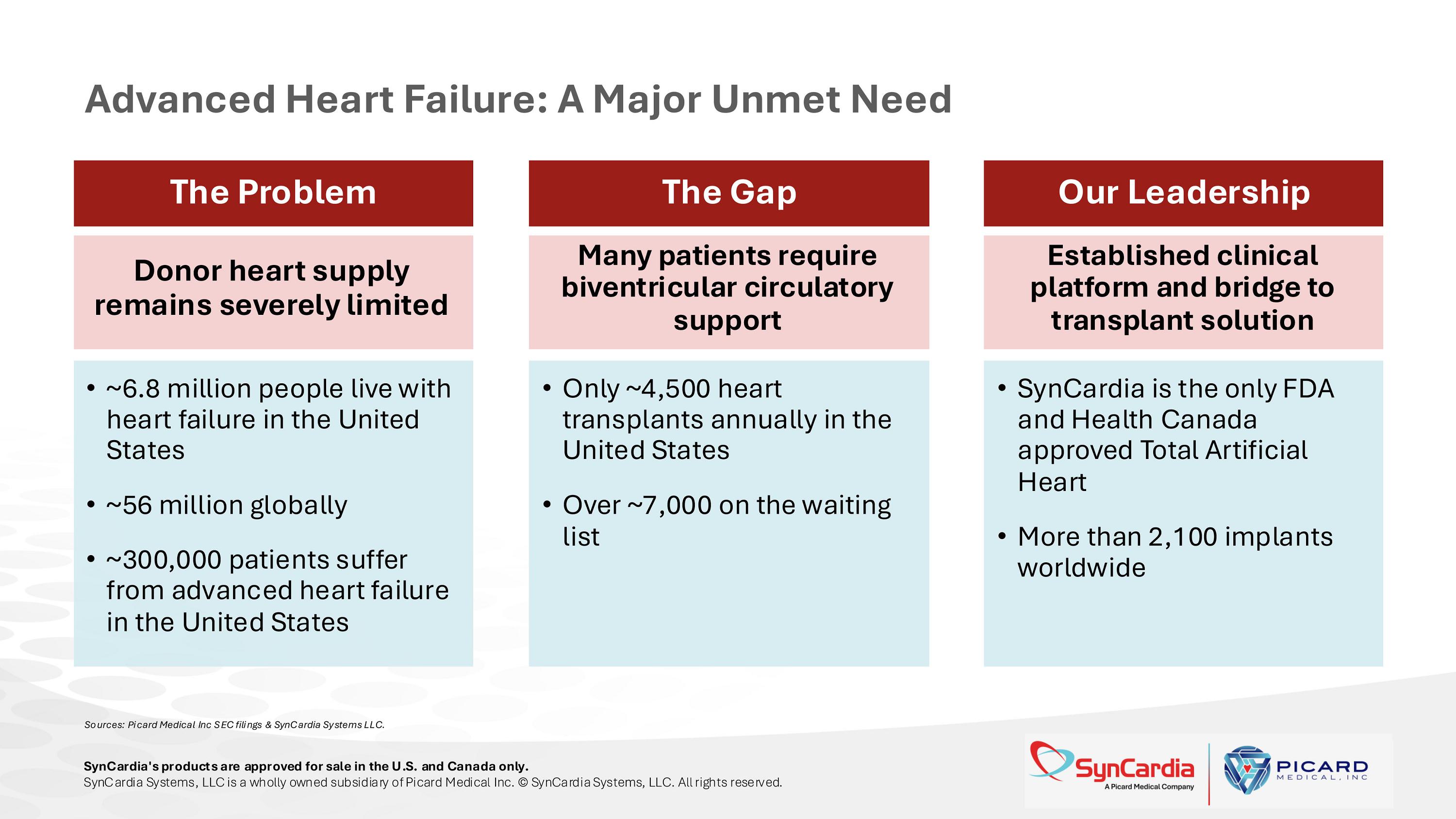 This Presentation contains statements that are “forward - looking statements” within the meaning of the Private Securities Litigation Reform Act of 1995. Forward - looking statements include all statements that do not relate solely to historical or current facts and can generally be identified by the use of future dates or words such as “may,” “should,” “could,” “will,” “expects,” “seeks to,” “anticipates,” “plans,” “believes,” “estimates,” “intends,” “predicts,” “projects,” “forecast,” “potential” or “continue” or the negative of such terms and other comparable terminology. These statements are not guarantees of future performance and involve risks, uncertainties and assumptions that are difficult to predict. Therefore, actual outcomes and results may differ materially from what is expressed or forecasted in such forward - looking statements due to numerous factors, risks, and uncertainties that could cause actual results to differ materially from such estimates or forecasts. You are cautioned not to unduly rely on such forward - looking statements when evaluating the information in this Presentation. Such forward - looking statements speak only as of the date on which they are made, and the Company does not undertake any obligation to update any forward - looking statement to reflect events or circumstances after the date of this Presentation. Forward - looking statements in this Presentation may include, for example, statements about: the Company's market position, including the belief that SynCardia is a leader in the total artificial heart (“TAH”) market, the Company’s anticipated growth strategy, including expected sales growth and the factors driving such growth, future operations, financial position, estimated revenues and losses, projected capex, prospects and plans; the Company’s strategic advantages and the potential impact those advantages will have on future financial and operational results; the implementation, market acceptance, expected timing of patent and U.S. Food and Drug Administration (“FDA”) approvals, and success of the Company’s products; the Company’s approach and goals with respect to research and development; the Company’s expectations regarding its ability to obtain and maintain intellectual property protection and not infringe on the rights of others; changes in applicable laws or regulations; and the outcome of any known and unknown litigation and regulatory proceedings. Neither the Company nor any of its subsidiaries, affiliates, representatives or advisors assumes any responsibility for or makes any representation or warranty (express or implied) as to the reasonableness, completeness, accuracy or reliability of the estimates and information contained herein, which speak only as of the date identified on the cover page of this Presentation. The Company and its respective affiliates, representatives and advisors expressly disclaim any and all liability based, in whole or in part, on such information, errors therein or omissions therefrom. The forward - looking statements and estimates contained in this Presentation are based on assumptions, expectations, and beliefs as of the date identified on the cover page of this Presentation. Neither the Company nor any of its respective affiliates, representatives or advisors intends to update or otherwise revise the forward - looking statements, estimates and other information contained herein to reflect circumstances existing after the date identified on the cover page of this Presentation or to reflect the occurrence of future events, even if any or all of the underlying assumptions, judgments and estimates are shown to be in error, except as required by law. Additional information about the Company, including risk factors that may affect the Company's business, financial condition, and results of operations, is contained in the Company's filings with the U.S. Securities and Exchange Commission (“SEC”), including the Company's Quarterly Reports on Form 10 - Q, which are available free of charge on the SEC's website at http://www.sec.gov and on the Company's investor relations website at https://picardmedical.com/ . SynCardia's products are approved for sale in the U.S. and Canada only. SynCardia Systems, LLC is a wholly owned subsidiary of Picard Medical Inc. © SynCardia Systems, LLC. All rights reserved. Forward - Looking Statements