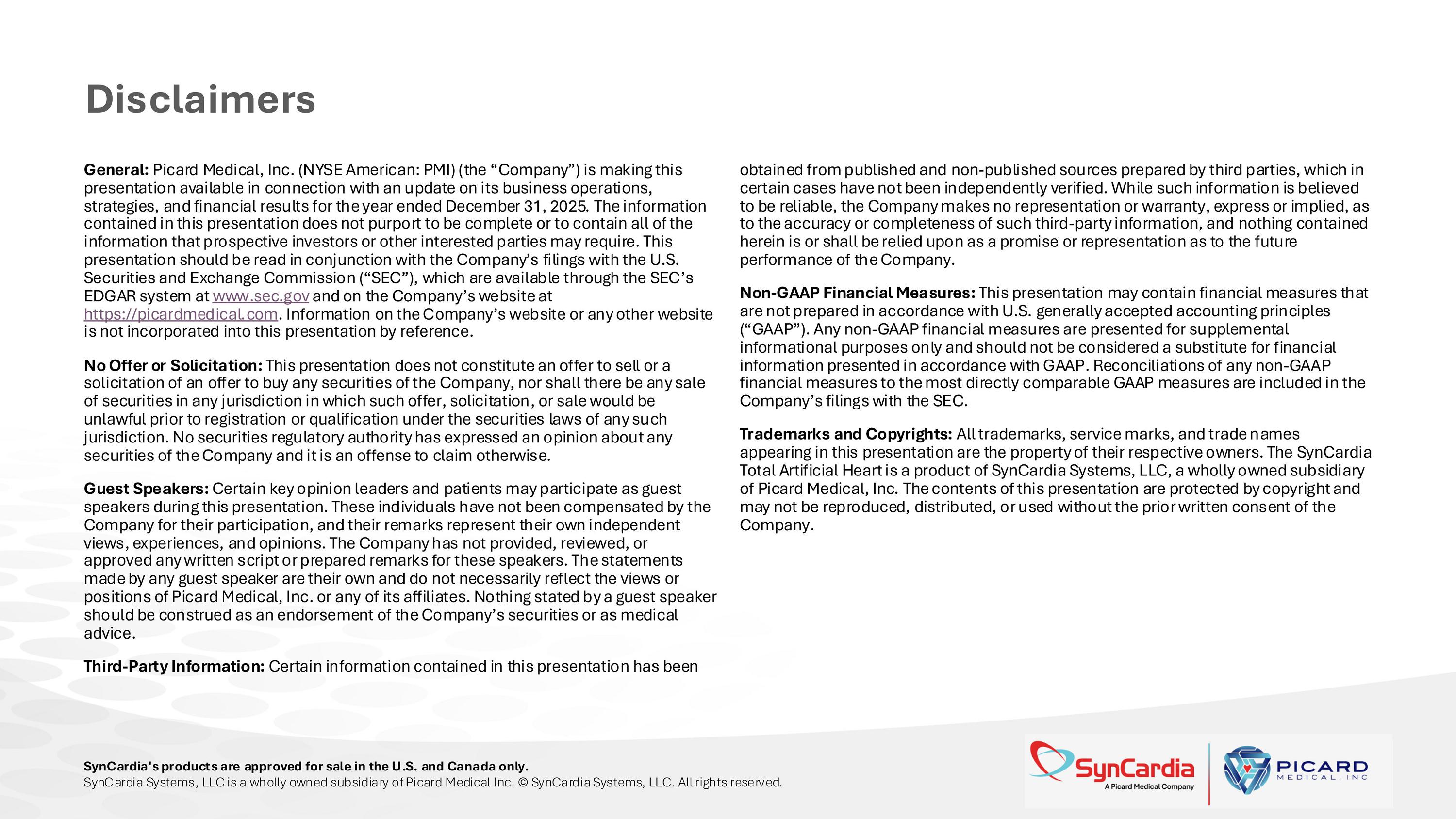 General: Picard Medical, Inc. (NYSE American: PMI) (the “Company”) is making this presentation available in connection with an update on its business operations, strategies, and financial results for the year ended December 31, 2025. The information contained in this presentation does not purport to be complete or to contain all of the information that prospective investors or other interested parties may require. This presentation should be read in conjunction with the Company’s filings with the U.S. Securities and Exchange Commission (“SEC”), which are available through the SEC’s EDGAR system at www.sec.gov and on the Company’s website at https://picardmedical.com . Information on the Company’s website or any other website is not incorporated into this presentation by reference. No Offer or Solicitation: This presentation does not constitute an offer to sell or a solicitation of an offer to buy any securities of the Company, nor shall there be any sale of securities in any jurisdiction in which such offer, solicitation, or sale would be unlawful prior to registration or qualification under the securities laws of any such jurisdiction. No securities regulatory authority has expressed an opinion about any securities of the Company and it is an offense to claim otherwise. Guest Speakers: Certain key opinion leaders and patients may participate as guest speakers during this presentation. These individuals have not been compensated by the Company for their participation, and their remarks represent their own independent views, experiences, and opinions. The Company has not provided, reviewed, or approved any written script or prepared remarks for these speakers. The statements made by any guest speaker are their own and do not necessarily reflect the views or positions of Picard Medical, Inc. or any of its affiliates. Nothing stated by a guest speaker should be construed as an endorsement of the Company’s securities or as medical advice. Third - Party Information: Certain information contained in this presentation has been obtained from published and non - published sources prepared by third parties, which in certain cases have not been independently verified. While such information is believed to be reliable, the Company makes no representation or warranty, express or implied, as to the accuracy or completeness of such third - party information, and nothing contained herein is or shall be relied upon as a promise or representation as to the future performance of the Company. Non - GAAP Financial Measures: This presentation may contain financial measures that are not prepared in accordance with U.S. generally accepted accounting principles (“GAAP”). Any non - GAAP financial measures are presented for supplemental informational purposes only and should not be considered a substitute for financial information presented in accordance with GAAP. Reconciliations of any non - GAAP financial measures to the most directly comparable GAAP measures are included in the Company’s filings with the SEC. Trademarks and Copyrights: All trademarks, service marks, and trade names appearing in this presentation are the property of their respective owners. The SynCardia Total Artificial Heart is a product of SynCardia Systems, LLC, a wholly owned subsidiary of Picard Medical, Inc. The contents of this presentation are protected by copyright and may not be reproduced, distributed, or used without the prior written consent of the Company. SynCardia's products are approved for sale in the U.S. and Canada only. SynCardia Systems, LLC is a wholly owned subsidiary of Picard Medical Inc. © SynCardia Systems, LLC. All rights reserved. Disclaimers