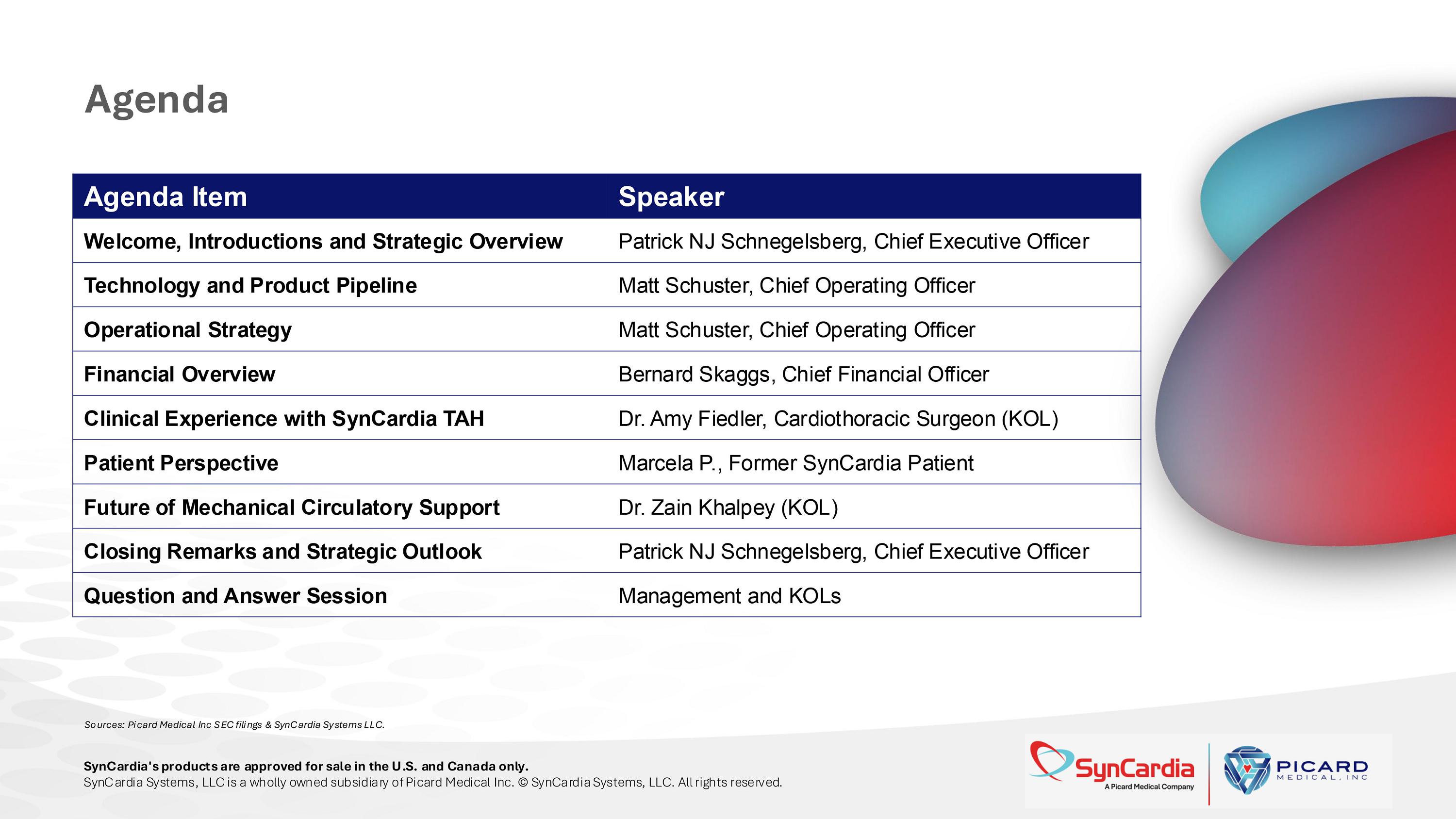 Speaker Agenda Item Patrick NJ Schnegelsberg, Chief Executive Officer Welcome, Introductions and Strategic Overview Matt Schuster, Chief Operating Officer Technology and Product Pipeline Matt Schuster, Chief Operating Officer Operational Strategy Bernard Skaggs, Chief Financial Officer Financial Overview Dr. Amy Fiedler, Cardiothoracic Surgeon (KOL) Clinical Experience with SynCardia TAH Marcela P., Former SynCardia Patient Patient Perspective Dr. Zain Khalpey (KOL) Future of Mechanical Circulatory Support Patrick NJ Schnegelsberg, Chief Executive Officer Closing Remarks and Strategic Outlook Management and KOLs Question and Answer Session SynCardia's products are approved for sale in the U.S. and Canada only. SynCardia Systems, LLC is a wholly owned subsidiary of Picard Medical Inc. © SynCardia Systems, LLC. All rights reserved. Agenda Sources: Picard Medical Inc SEC filings & SynCardia Systems LLC.