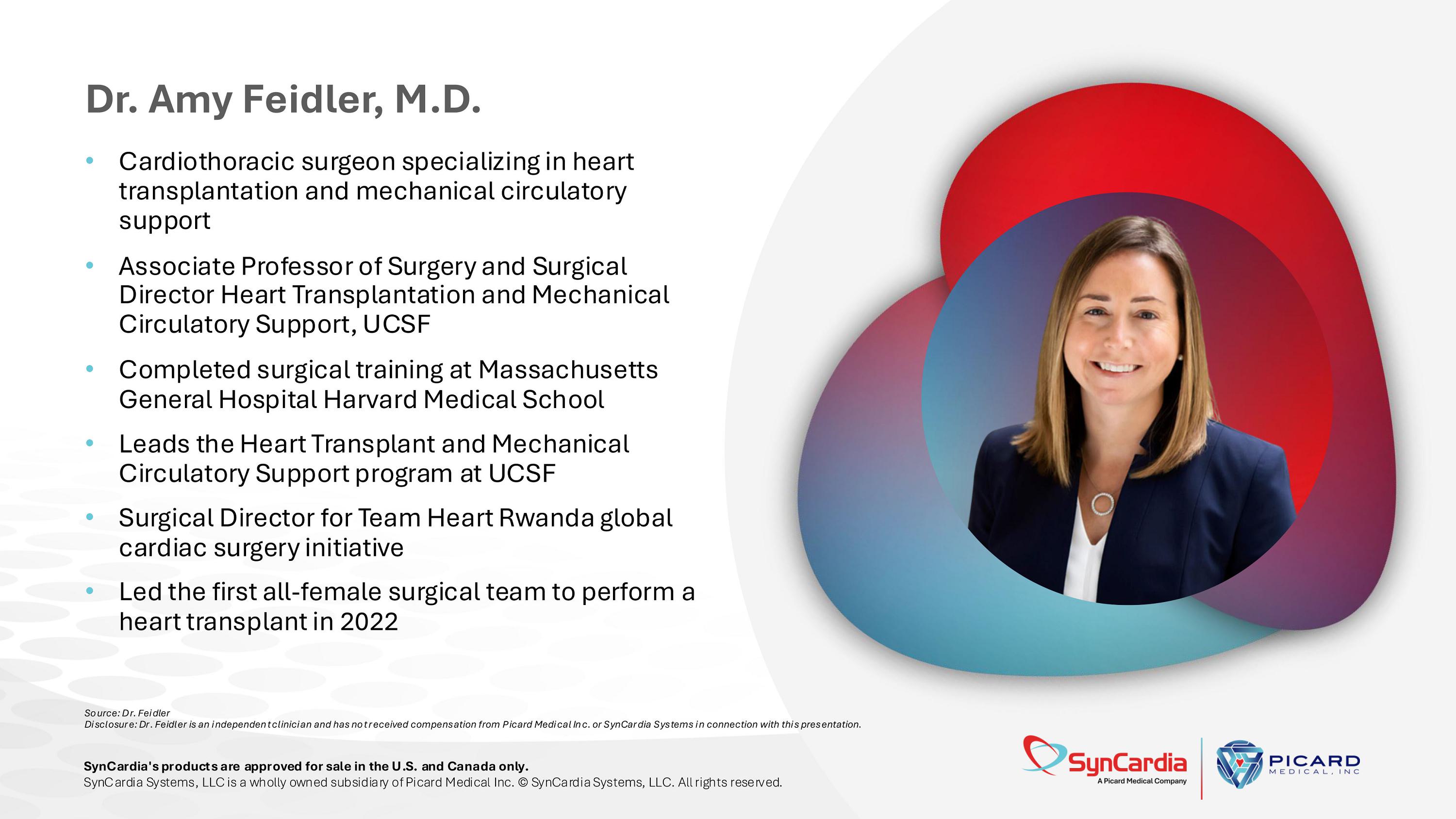 SynCardia's products are approved for sale in the U.S. and Canada only. SynCardia Systems, LLC is a wholly owned subsidiary of Picard Medical Inc. © SynCardia Systems, LLC. All rights reserved. • Cardiothoracic surgeon specializing in heart transplantation and mechanical circulatory support • Associate Professor of Surgery and Surgical Director Heart Transplantation and Mechanical Circulatory Support, UCSF • Completed surgical training at Massachusetts General Hospital Harvard Medical School • Leads the Heart Transplant and Mechanical Circulatory Support program at UCSF • Surgical Director for Team Heart Rwanda global cardiac surgery initiative • Led the first all - female surgical team to perform a heart transplant in 2022 Dr. Amy Feidler, M.D. Source: Dr. Feidler Disclosure: Dr. Feidler is an independent clinician and has not received compensation from Picard Medical Inc. or SynCardia S yst ems in connection with this presentation.