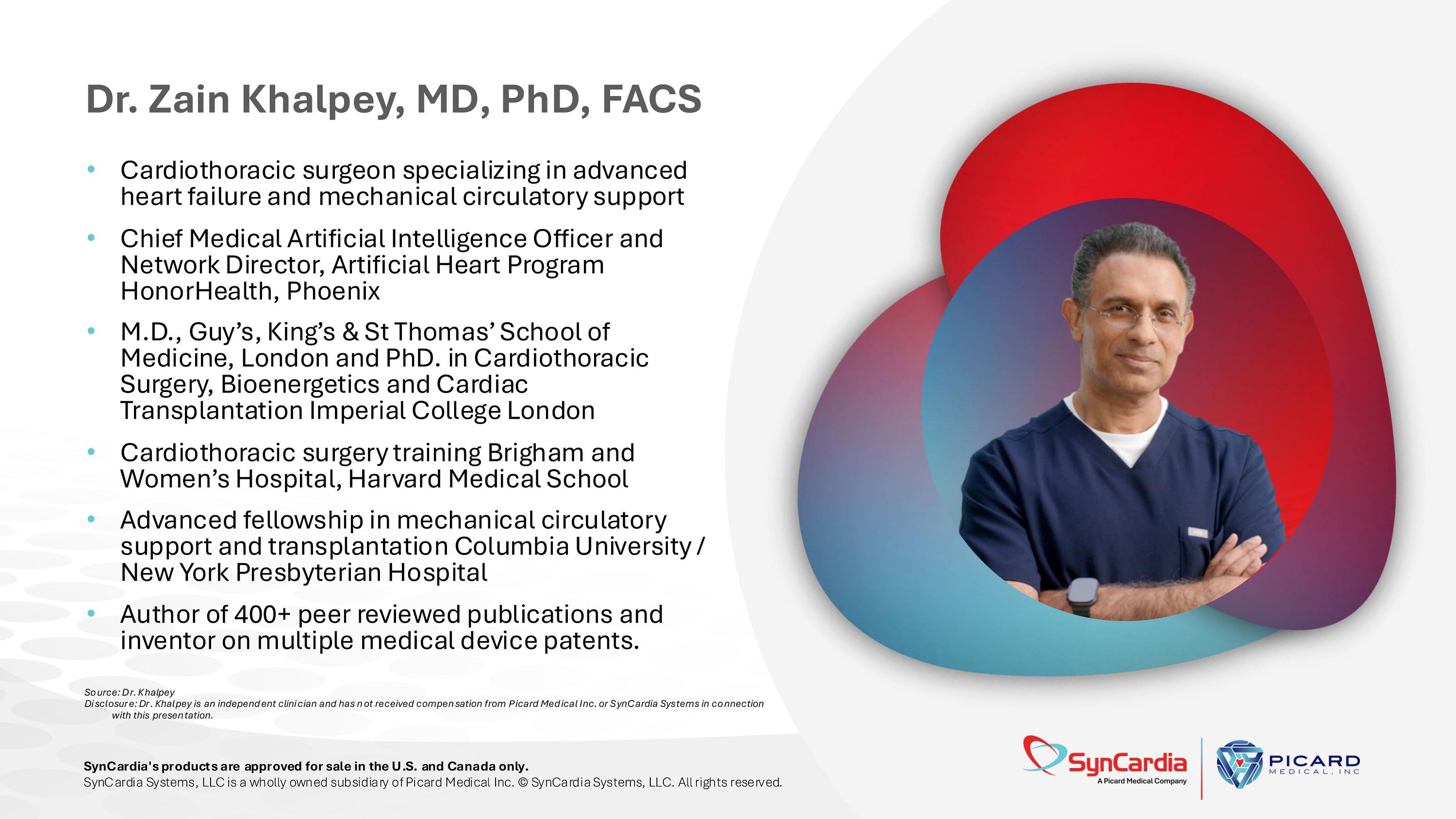 SynCardia's products are approved for sale in the U.S. and Canada only. SynCardia Systems, LLC is a wholly owned subsidiary of Picard Medical Inc. © SynCardia Systems, LLC. All rights reserved. • Cardiothoracic surgeon specializing in advanced heart failure and mechanical circulatory support • Chief Medical Artificial Intelligence Officer and Network Director, Artificial Heart Program HonorHealth, Phoenix • M.D., Guy’s, King’s & St Thomas’ School of Medicine, London and PhD. in Cardiothoracic Surgery, Bioenergetics and Cardiac Transplantation Imperial College London • Cardiothoracic surgery training Brigham and Women’s Hospital, Harvard Medical School • Advanced fellowship in mechanical circulatory support and transplantation Columbia University / New York Presbyterian Hospital • Author of 400+ peer reviewed publications and inventor on multiple medical device patents. Dr. Zain Khalpey, MD, PhD, FACS Source: Dr. Khalpey Disclosure: Dr. Khalpey is an independent clinician and has not received compensation from Picard Medical Inc. or SynCardia Systems in connection with this presentation.