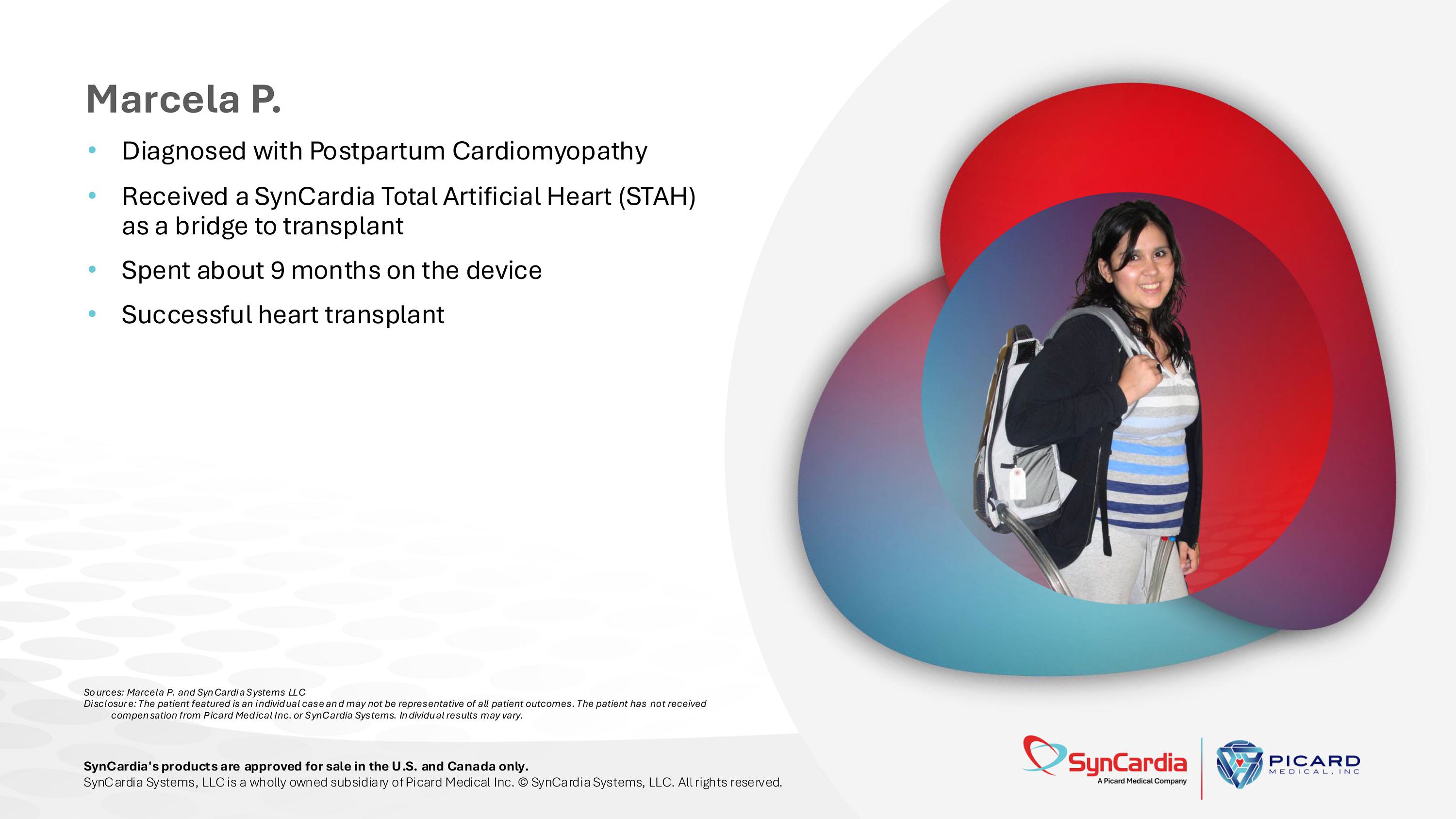 SynCardia's products are approved for sale in the U.S. and Canada only. SynCardia Systems, LLC is a wholly owned subsidiary of Picard Medical Inc. © SynCardia Systems, LLC. All rights reserved. • Diagnosed with Postpartum Cardiomyopathy • Received a SynCardia Total Artificial Heart (STAH) as a bridge to transplant • Spent about 9 months on the device • Successful heart transplant Marcela P. Sources: Marcela P. and SynCardia Systems LLC Disclosure: The patient featured is an individual case and may not be representative of all patient outcomes. The patient has no t received compensation from Picard Medical Inc. or SynCardia Systems. Individual results may vary.