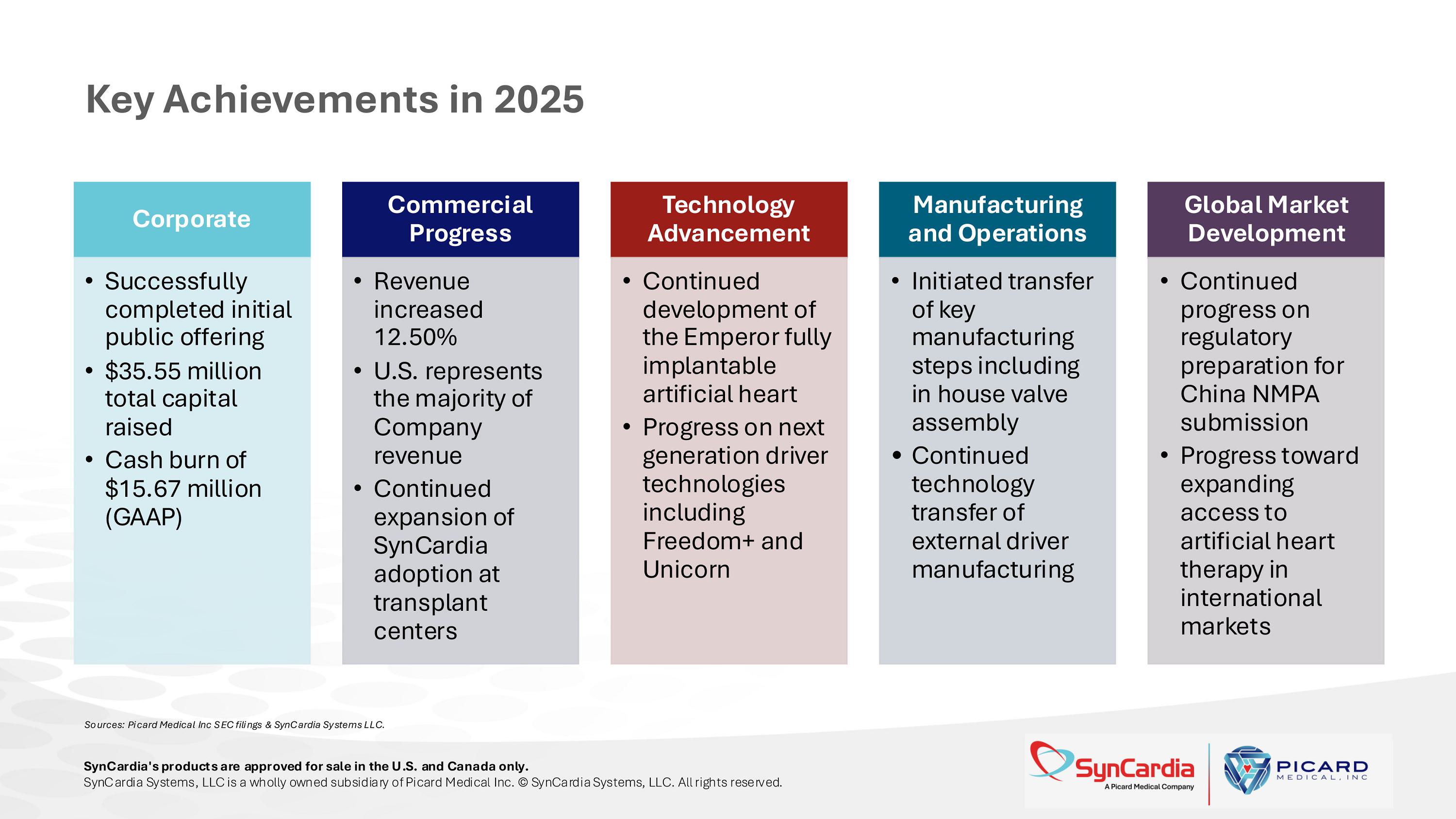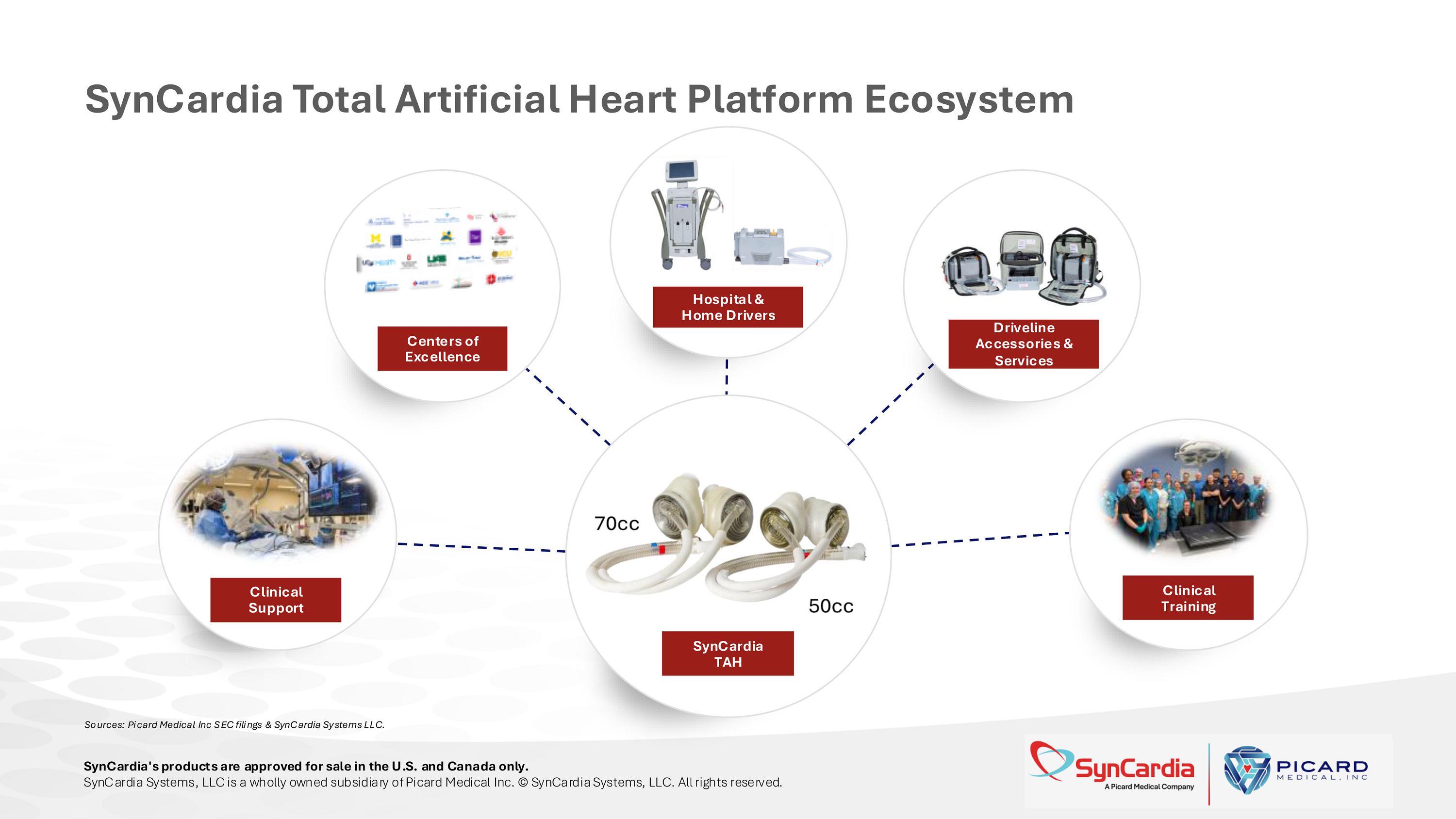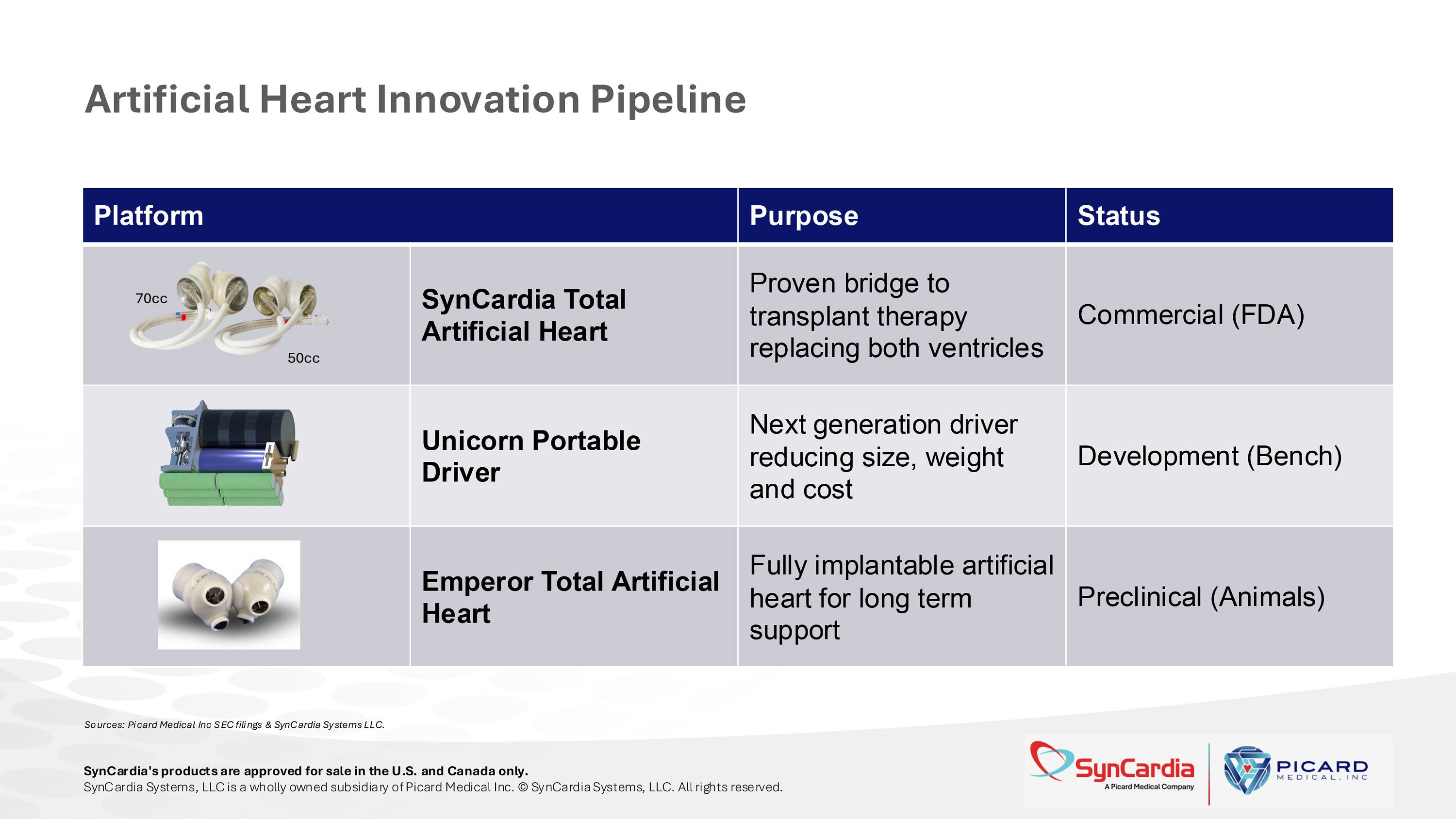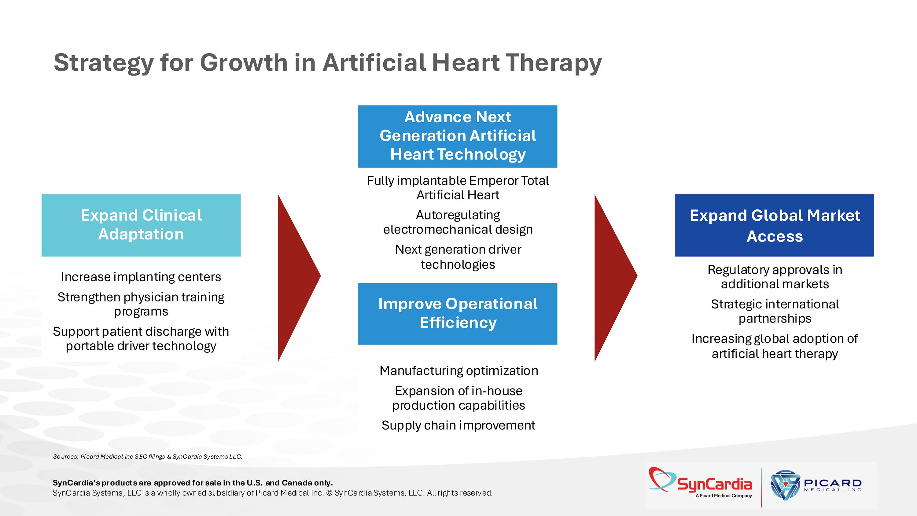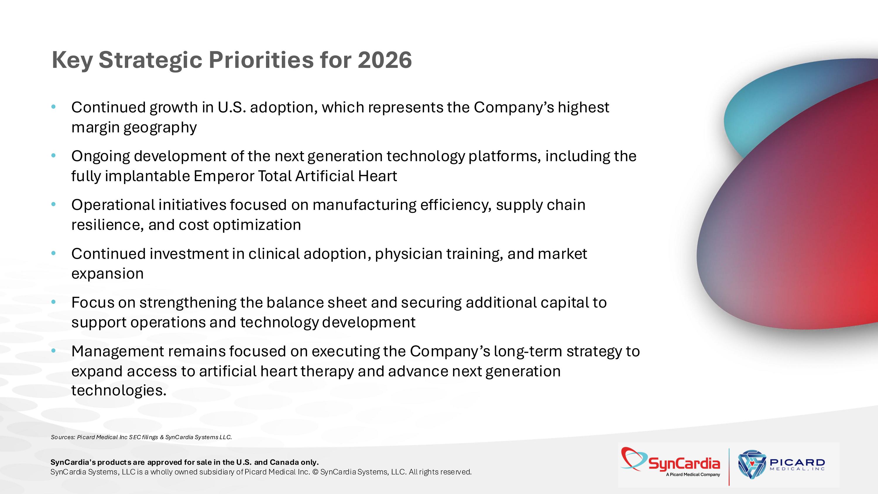 • Continued growth in U.S. adoption, which represents the Company’s highest margin geography • Ongoing development of the next generation technology platforms, including the fully implantable Emperor Total Artificial Heart • Operational initiatives focused on manufacturing efficiency, supply chain resilience, and cost optimization • Continued investment in clinical adoption, physician training, and market expansion • Focus on strengthening the balance sheet and securing additional capital to support operations and technology development • Management remains focused on executing the Company’s long - term strategy to expand access to artificial heart therapy and advance next generation technologies. SynCardia's products are approved for sale in the U.S. and Canada only. SynCardia Systems, LLC is a wholly owned subsidiary of Picard Medical Inc. © SynCardia Systems, LLC. All rights reserved. Key Strategic Priorities for 2026 Sources: Picard Medical Inc SEC filings & SynCardia Systems LLC.