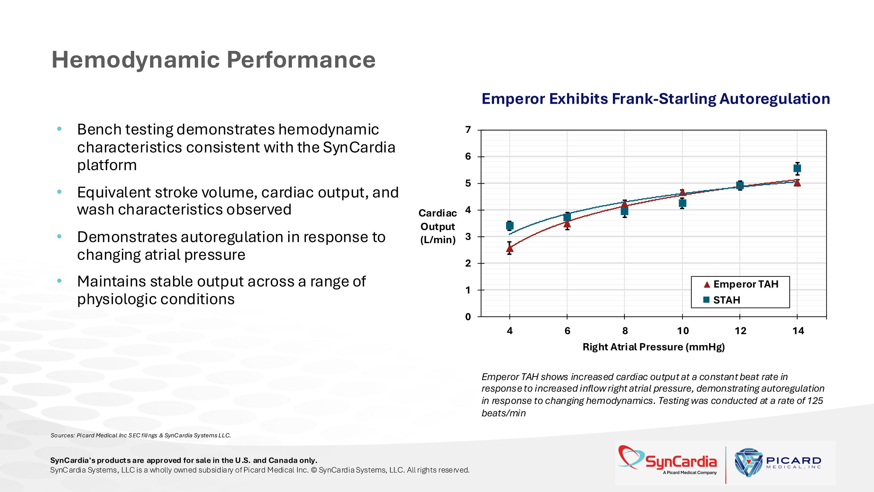• Bench testing demonstrates hemodynamic characteristics consistent with the SynCardia platform • Equivalent stroke volume, cardiac output, and wash characteristics observed • Demonstrates autoregulation in response to changing atrial pressure • Maintains stable output across a range of physiologic conditions Hemodynamic Performance 0 1 2 3 4 5 6 7 4 6 8 10 12 14 Cardiac Output (L/min) Right Atrial Pressure (mmHg) Emperor TAH STAH Emperor Exhibits Frank - Starling Autoregulation Emperor TAH shows increased cardiac output at a constant beat rate in response to increased inflow right atrial pressure, demonstrating autoregulation in response to changing hemodynamics. Testing was conducted at a rate of 125 beats/min SynCardia's products are approved for sale in the U.S. and Canada only. SynCardia Systems, LLC is a wholly owned subsidiary of Picard Medical Inc. © SynCardia Systems, LLC. All rights reserved. Sources: Picard Medical Inc SEC filings & SynCardia Systems LLC.