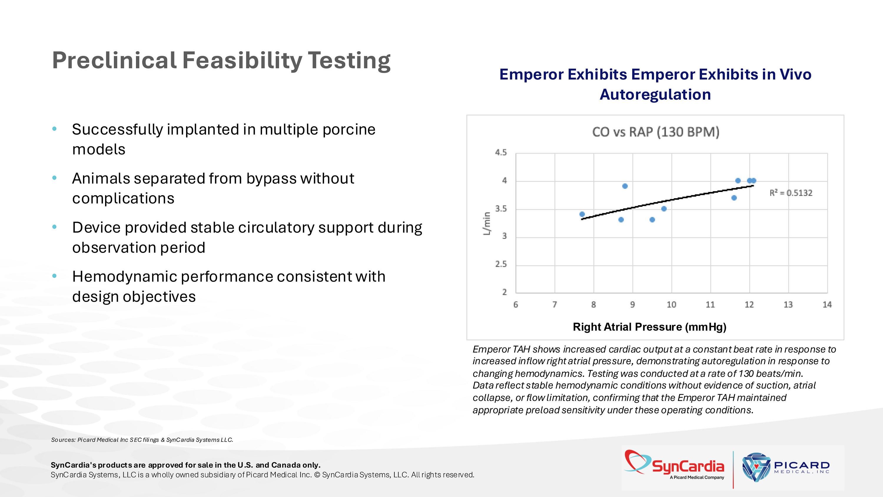• Successfully implanted in multiple porcine models • Animals separated from bypass without complications • Device provided stable circulatory support during observation period • Hemodynamic performance consistent with design objectives Preclinical Feasibility Testing SynCardia's products are approved for sale in the U.S. and Canada only. SynCardia Systems, LLC is a wholly owned subsidiary of Picard Medical Inc. © SynCardia Systems, LLC. All rights reserved. Emperor Exhibits Emperor Exhibits in Vivo Autoregulation Emperor TAH shows increased cardiac output at a constant beat rate in response to increased inflow right atrial pressure, demonstrating autoregulation in response to changing hemodynamics. Testing was conducted at a rate of 130 beats/min. Data reflect stable hemodynamic conditions without evidence of suction, atrial collapse, or flow limitation, confirming that the Emperor TAH maintained appropriate preload sensitivity under these operating conditions. Right Atrial Pressure (mmHg) Sources: Picard Medical Inc SEC filings & SynCardia Systems LLC.