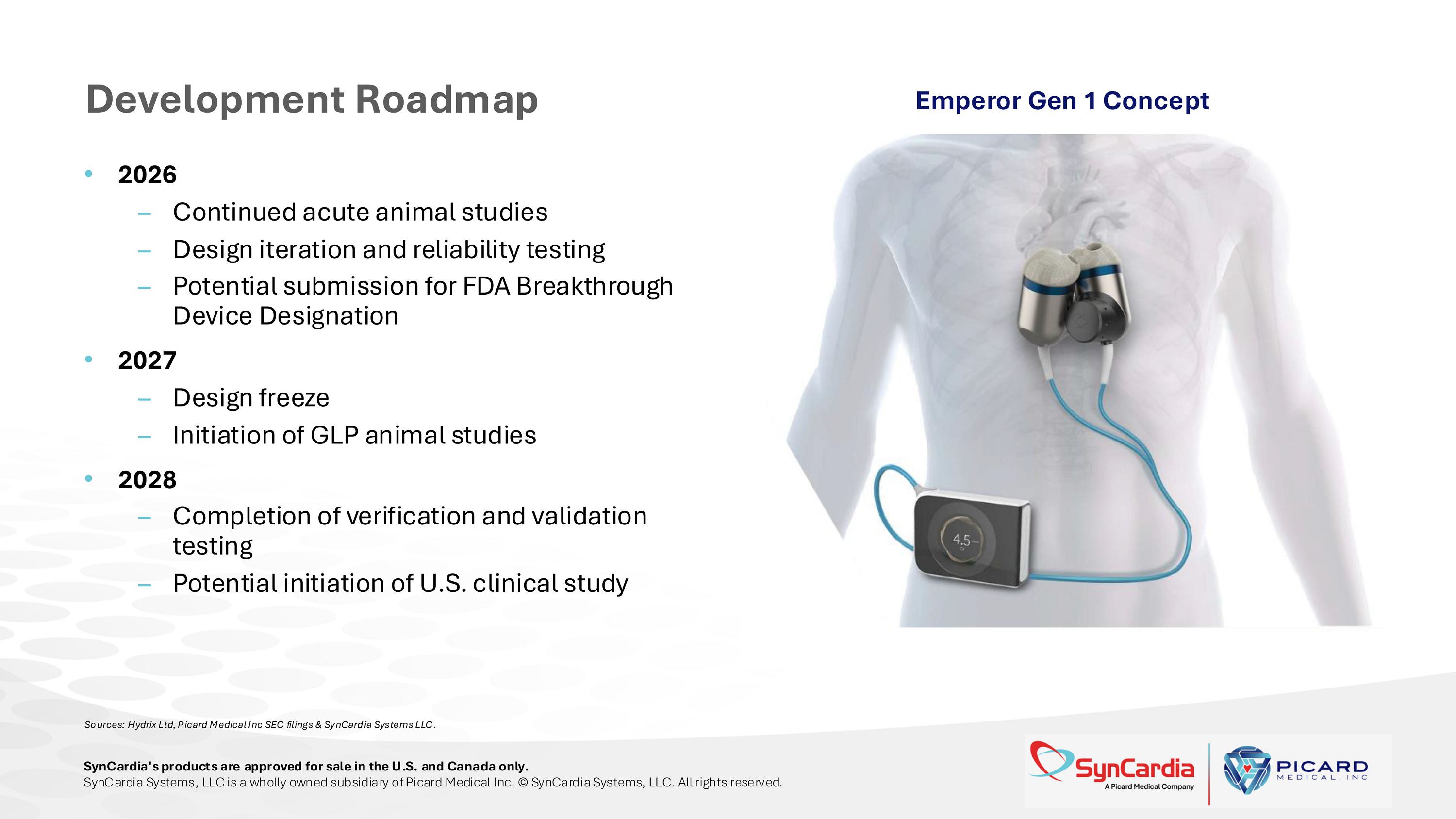 • 2026 – Continued acute animal studies – Design iteration and reliability testing – Potential submission for FDA Breakthrough Device Designation • 2027 – Design freeze – Initiation of GLP animal studies • 2028 – Completion of verification and validation testing – Potential initiation of U.S. clinical study Development Roadmap Emperor Gen 1 Concept SynCardia's products are approved for sale in the U.S. and Canada only. SynCardia Systems, LLC is a wholly owned subsidiary of Picard Medical Inc. © SynCardia Systems, LLC. All rights reserved. Sources: Hydrix Ltd, Picard Medical Inc SEC filings & SynCardia Systems LLC.