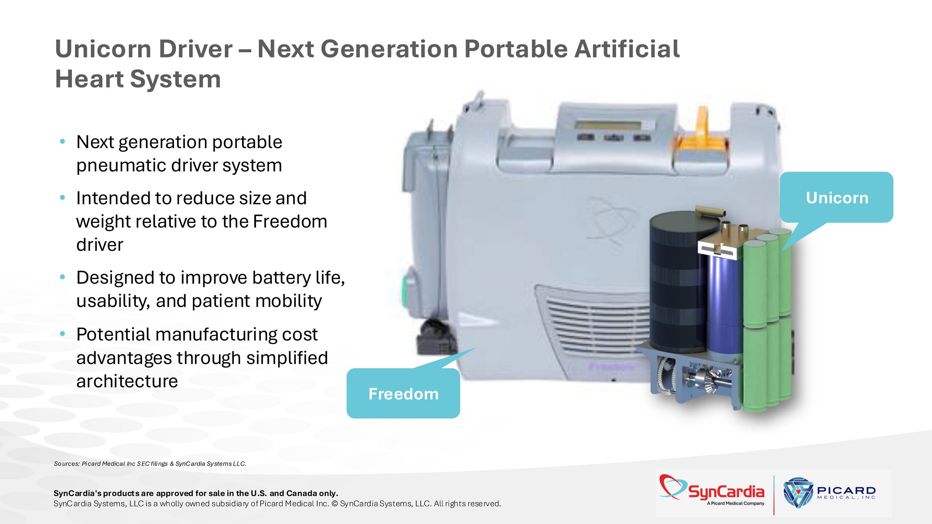 SynCardia's products are approved for sale in the U.S. and Canada only. SynCardia Systems, LLC is a wholly owned subsidiary of Picard Medical Inc. © SynCardia Systems, LLC. All rights reserved. Unicorn Driver – Next Generation Portable Artificial Heart System • Next generation portable pneumatic driver system • Intended to reduce size and weight relative to the Freedom driver • Designed to improve battery life, usability, and patient mobility • Potential manufacturing cost advantages through simplified architecture Unicorn Freedom Sources: Picard Medical Inc SEC filings & SynCardia Systems LLC.