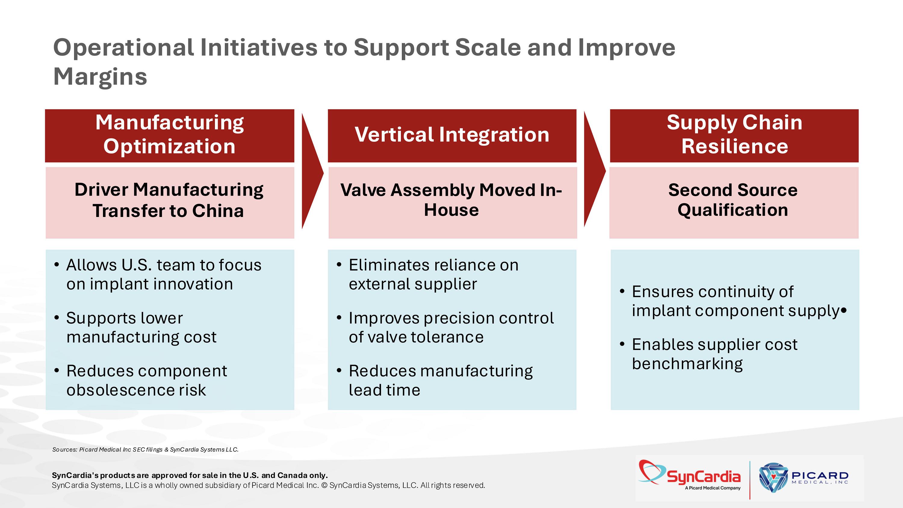 Manufacturing Optimization • Allows U.S. team to focus on implant innovation • Supports lower manufacturing cost • Reduces component obsolescence risk Vertical Integration • Eliminates reliance on external supplier • Improves precision control of valve tolerance • Reduces manufacturing lead time Supply Chain Resilience • Ensures continuity of implant component supply• • Enables supplier cost benchmarking SynCardia's products are approved for sale in the U.S. and Canada only. SynCardia Systems, LLC is a wholly owned subsidiary of Picard Medical Inc. © SynCardia Systems, LLC. All rights reserved. Operational Initiatives to Support Scale and Improve Margins Driver Manufacturing Transfer to China Valve Assembly Moved In - House Second Source Qualification Sources: Picard Medical Inc SEC filings & SynCardia Systems LLC.