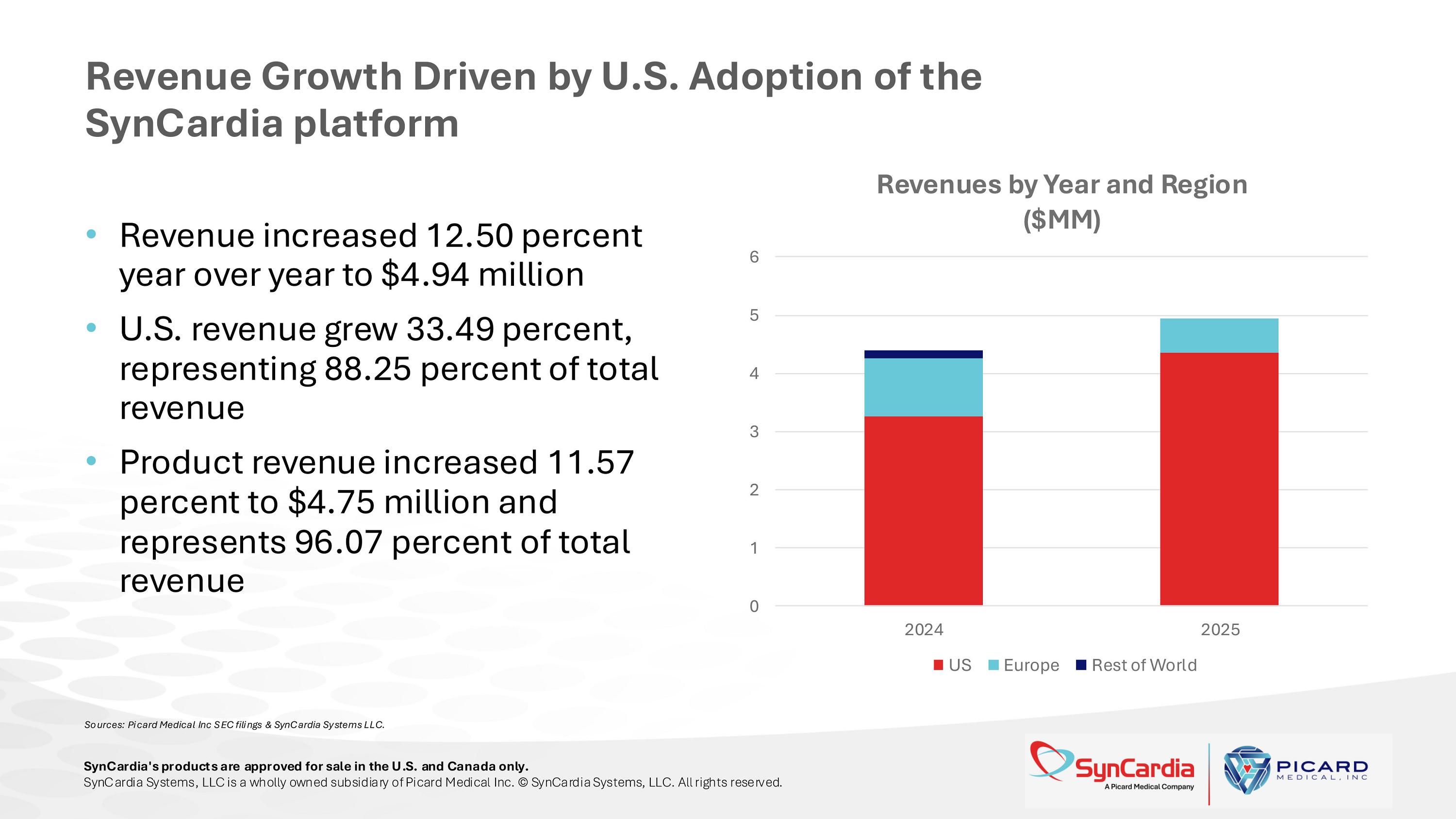 SynCardia's products are approved for sale in the U.S. and Canada only. SynCardia Systems, LLC is a wholly owned subsidiary of Picard Medical Inc. © SynCardia Systems, LLC. All rights reserved. Key Achievements in 2025 Corporate • Successfully completed initial public offering • $35.55 million total capital raised • Cash burn of $15.67 million (GAAP) Commercial Progress • Revenue increased 12.50% • U.S. represents the majority of Company revenue • Continued expansion of SynCardia adoption at transplant centers Technology Advancement • Continued development of the Emperor fully implantable artificial heart • Progress on next generation driver technologies including Freedom+ and Unicorn Manufacturing and Operations • Initiated transfer of key manufacturing steps including in house valve assembly • Continued technology transfer of external driver manufacturing Global Market Development • Continued progress on regulatory preparation for China NMPA submission • Progress toward expanding access to artificial heart therapy in international markets Sources: Picard Medical Inc SEC filings & SynCardia Systems LLC.