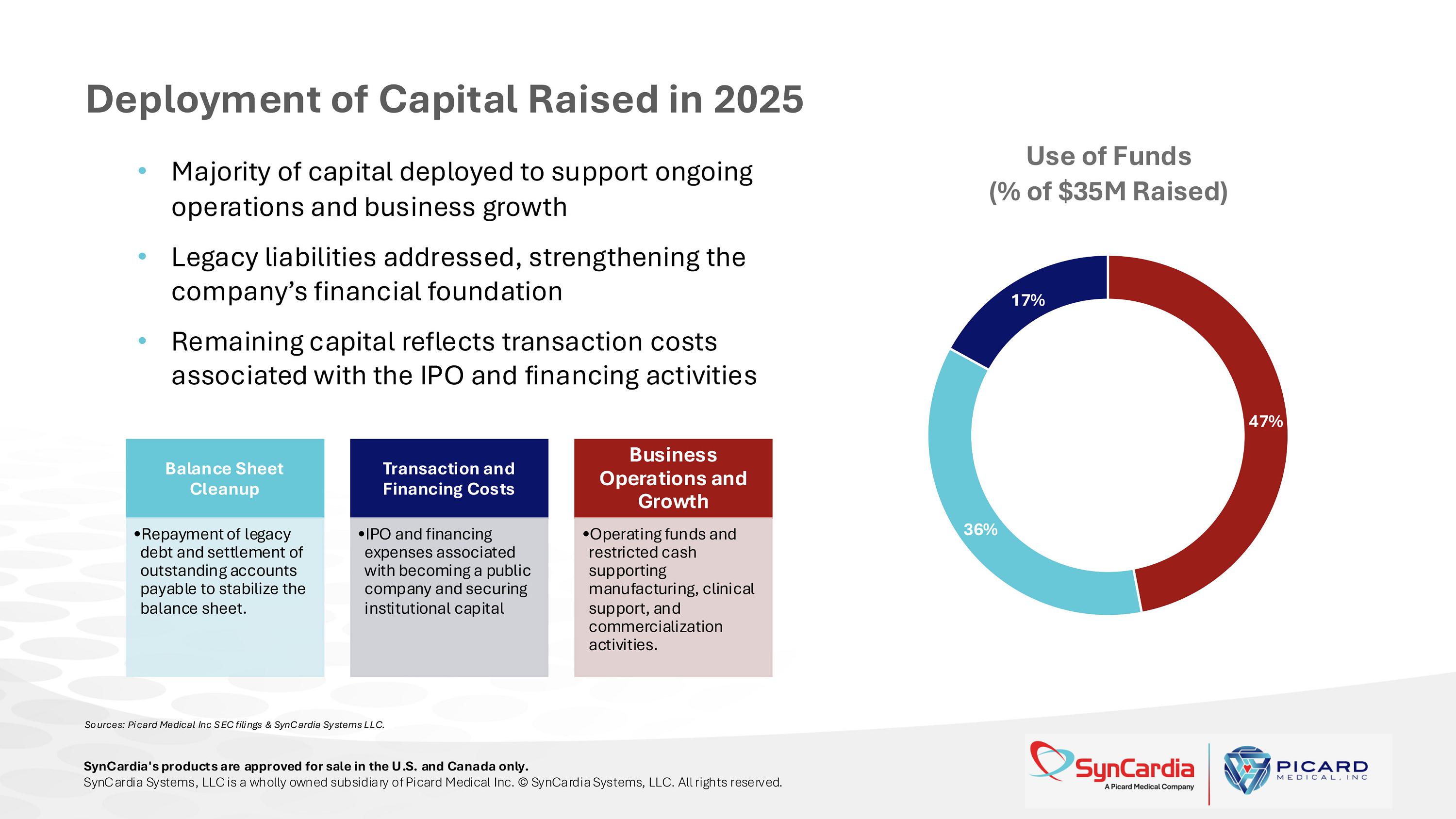 Balance Sheet Cleanup • Repayment of legacy debt and settlement of outstanding accounts payable to stabilize the balance sheet. Transaction and Financing Costs • IPO and financing expenses associated with becoming a public company and securing institutional capital Business Operations and Growth • Operating funds and restricted cash supporting manufacturing, clinical support, and commercialization activities. Deployment of Capital Raised in 2025 SynCardia's products are approved for sale in the U.S. and Canada only. SynCardia Systems, LLC is a wholly owned subsidiary of Picard Medical Inc. © SynCardia Systems, LLC. All rights reserved. • Majority of capital deployed to support ongoing operations and business growth • Legacy liabilities addressed, strengthening the company’s financial foundation • Remaining capital reflects transaction costs associated with the IPO and financing activities 47% 36% 17% Use of Funds (% of $35M Raised) Sources: Picard Medical Inc SEC filings & SynCardia Systems LLC.
