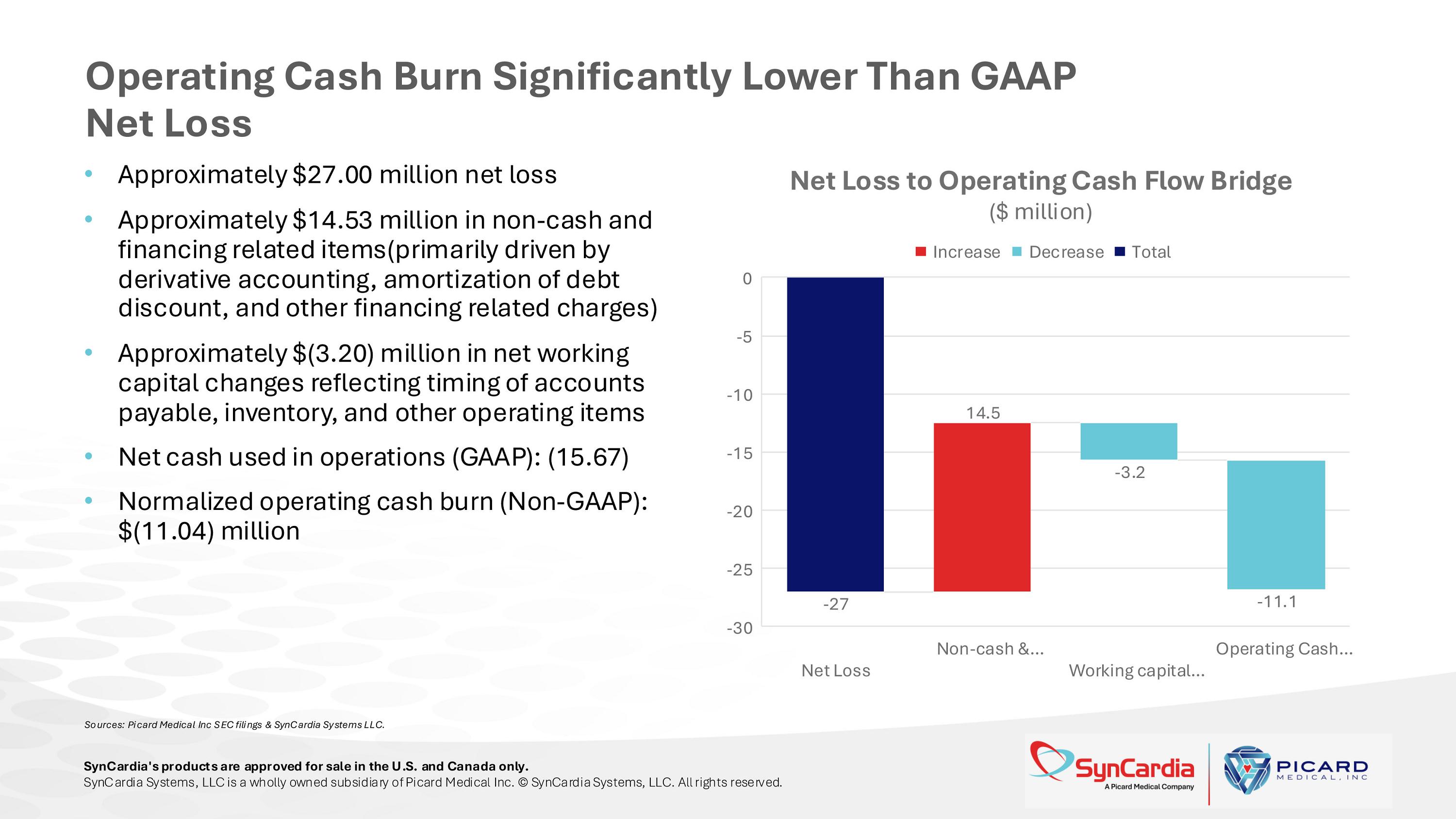 • Approximately $27.00 million net loss • Approximately $14.53 million in non - cash and financing related items(primarily driven by derivative accounting, amortization of debt discount, and other financing related charges) • Approximately $(3.20) million in net working capital changes reflecting timing of accounts payable, inventory, and other operating items • Net cash used in operations (GAAP): (15.67) • Normalized operating cash burn (Non - GAAP): $(11.04) million - 27 14.5 - 3.2 - 11.1 Net Loss Non - cash & … Working capital … Operating Cash … 0 - 5 - 10 - 15 - 20 - 25 - 30 Net Loss to Operating Cash Flow Bridge ($ million) Increase Decrease Total Operating Cash Burn Significantly Lower Than GAAP Net Loss SynCardia's products are approved for sale in the U.S. and Canada only. SynCardia Systems, LLC is a wholly owned subsidiary of Picard Medical Inc. © SynCardia Systems, LLC. All rights reserved. Sources: Picard Medical Inc SEC filings & SynCardia Systems LLC.