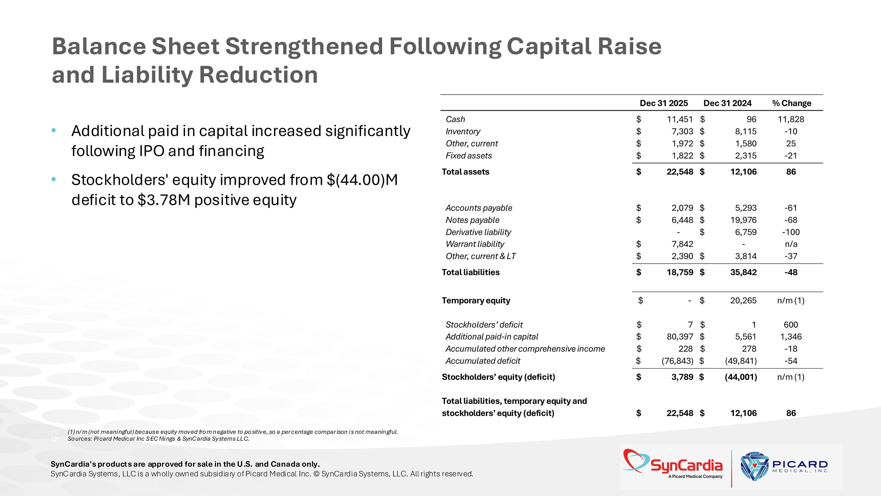 Balance Sheet Strengthened Following Capital Raise and Liability Reduction SynCardia's products are approved for sale in the U.S. and Canada only. SynCardia Systems, LLC is a wholly owned subsidiary of Picard Medical Inc. © SynCardia Systems, LLC. All rights reserved. (1) (1) n/m (not meaningful) because equity moved from negative to positive, so a percentage comparison is not meaningful. (2) Sources: Picard Medical Inc SEC filings & SynCardia Systems LLC. Dec 31 2025 Dec 31 2024 % Change Cash $ 11,451 $ 96 11,828 Inventory $ 7,303 $ 8,115 -10 Other, current $ 1,972 $ 1,580 25 Fixed assets $ 1,822 $ 2,315 -21 Total assets $ 22,548 $ 12,106 86 Accounts payable $ 2,079 $ 5,293 -61 Notes payable $ 6,448 $ 19,976 -68 Derivative liability - $ 6,759 -100 Warrant liability $ 7,842 - n/a Other, current & LT $ 2,390 $ 3,814 -37 Total liabilities $ 18,759 $ 35,842 -48 Temporary equity $ - $ 20,265 n/m (1) Stockholders’ deficit $ 7 $ 1 600 Additional paid-in capital $ 80,397 $ 5,561 1,346 Accumulated other comprehensive income $ 228 $ 278 -18 Accumulated deficit $ (76,843) $ (49,841) -54 Stockholders’ equity (deficit) $ 3,789 $ (44,001) n/m (1) Total liabilities, temporary equity and stockholders’ equity (deficit) $ 22,548 $ 12,106 86 • Additional paid in capital increased significantly following IPO and financing • Stockholders' equity improved from $(44.00)M deficit to $3.78M positive equity