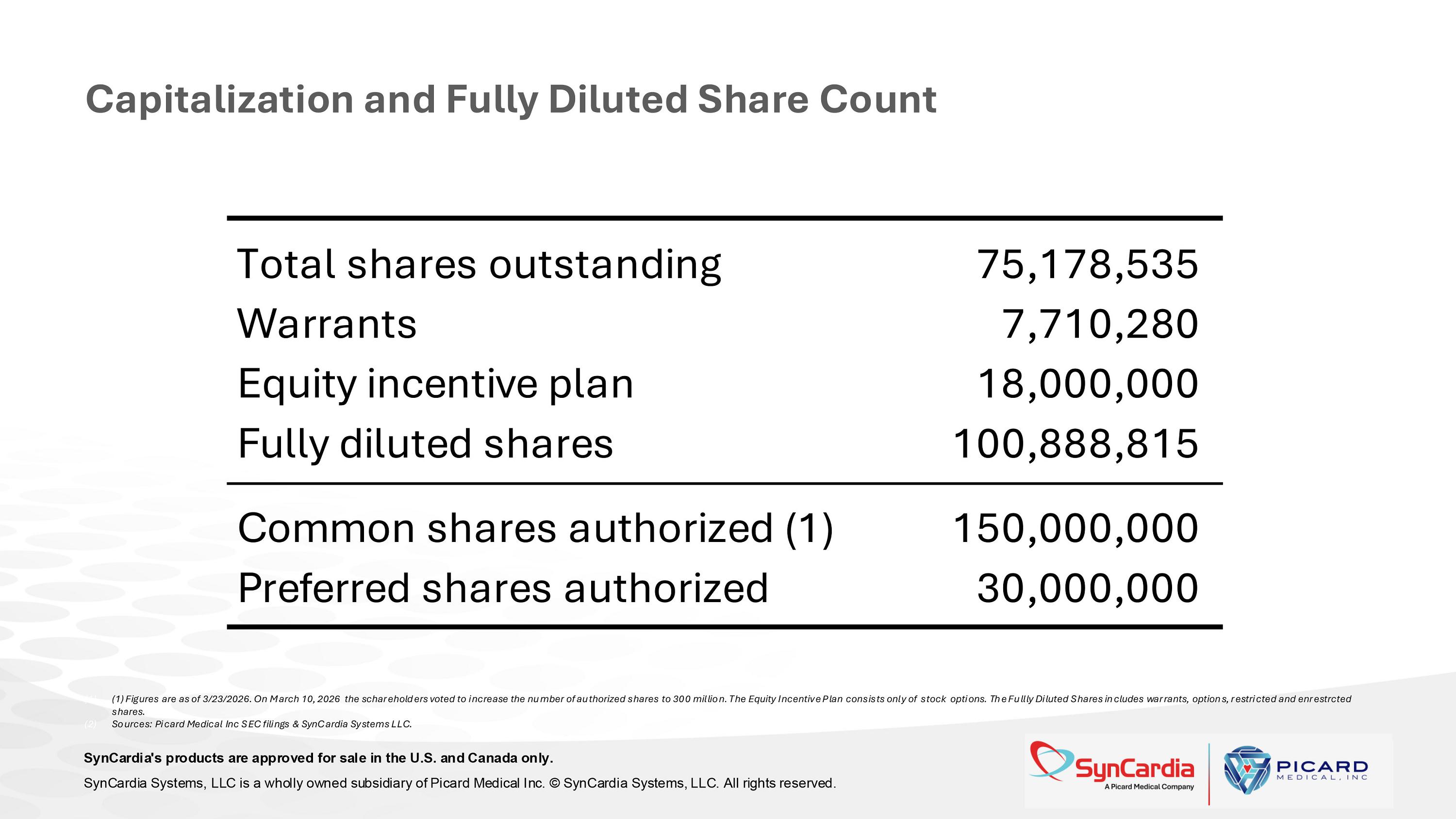 Total shares outstanding 75,178,535 Warrants 7,710,280 Equity incentive plan 18,000,000 Fully diluted shares 100,888,815 Common shares authorized (1) 150,000,000 Preferred shares authorized 30,000,000 SynCardia's products are approved for sale in the U.S. and Canada only. SynCardia Systems, LLC is a wholly owned subsidiary of Picard Medical Inc. © SynCardia Systems, LLC. All rights reserved. Capitalization and Fully Diluted Share Count (1) (1) Figures are as of 3/23/2026. On March 10, 2026 the schareholders voted to increase the number of authorized shares to 30 0 m illion. The Equity Incentive Plan consists only of stock options. The Fullly Diluted Shares includes warrants, options, restri cted and enrestrcted shares. (2) Sources: Picard Medical Inc SEC filings & SynCardia Systems LLC.