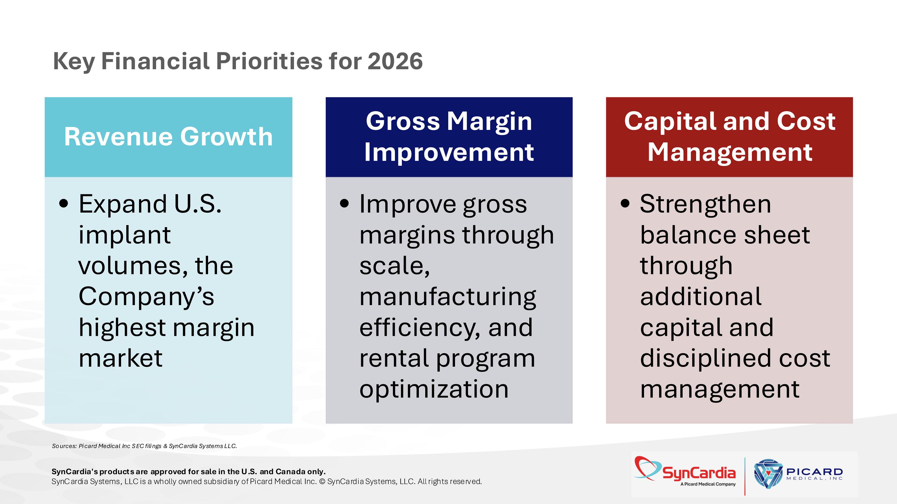 SynCardia's products are approved for sale in the U.S. and Canada only. SynCardia Systems, LLC is a wholly owned subsidiary of Picard Medical Inc. © SynCardia Systems, LLC. All rights reserved. Key Financial Priorities for 2026 Sources: Picard Medical Inc SEC filings & SynCardia Systems LLC. Revenue Growth • Expand U.S. implant volumes, the Company’s highest margin market Gross Margin Improvement • Improve gross margins through scale, manufacturing efficiency, and rental program optimization Capital and Cost Management • Strengthen balance sheet through additional capital and disciplined cost management