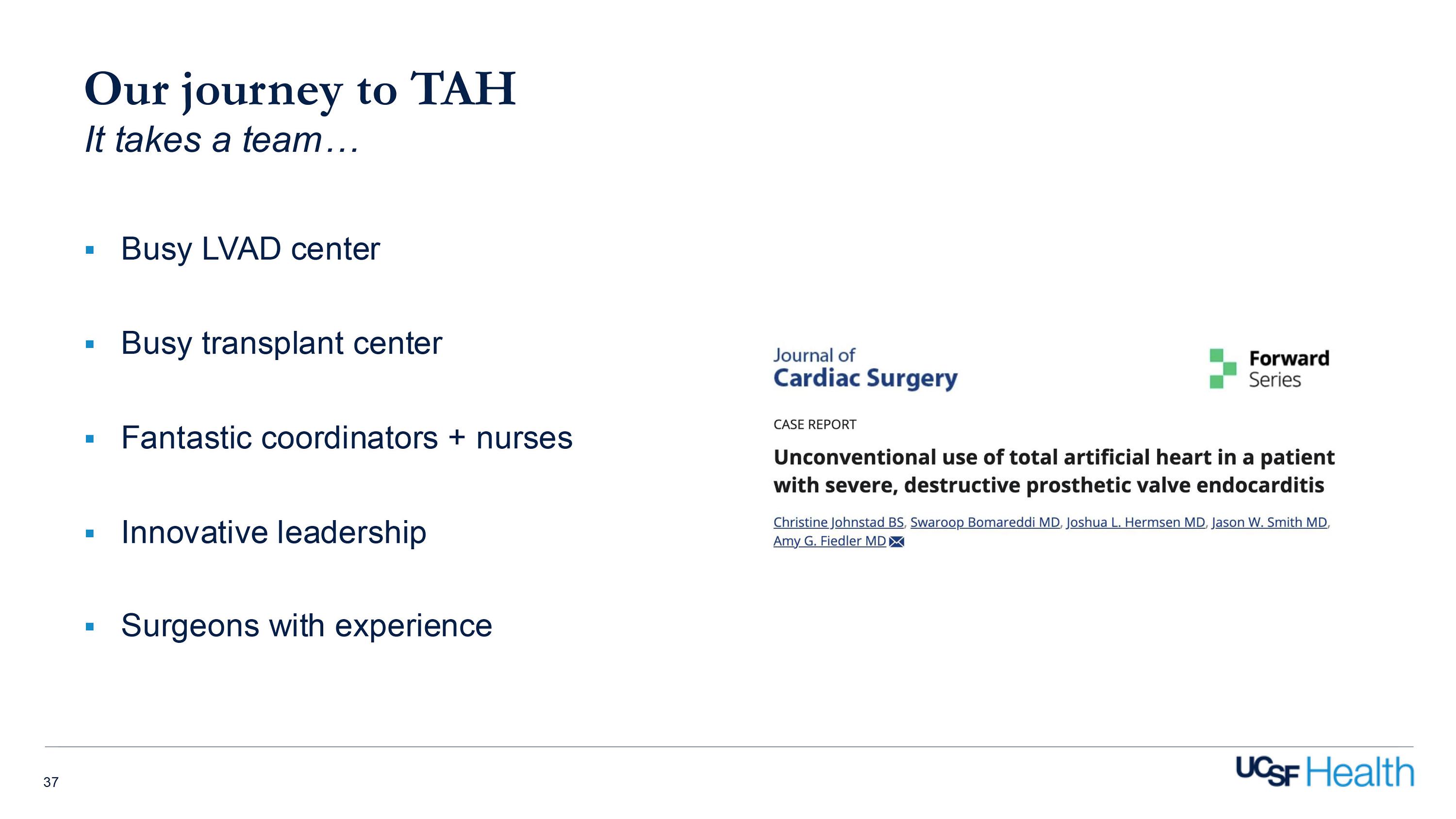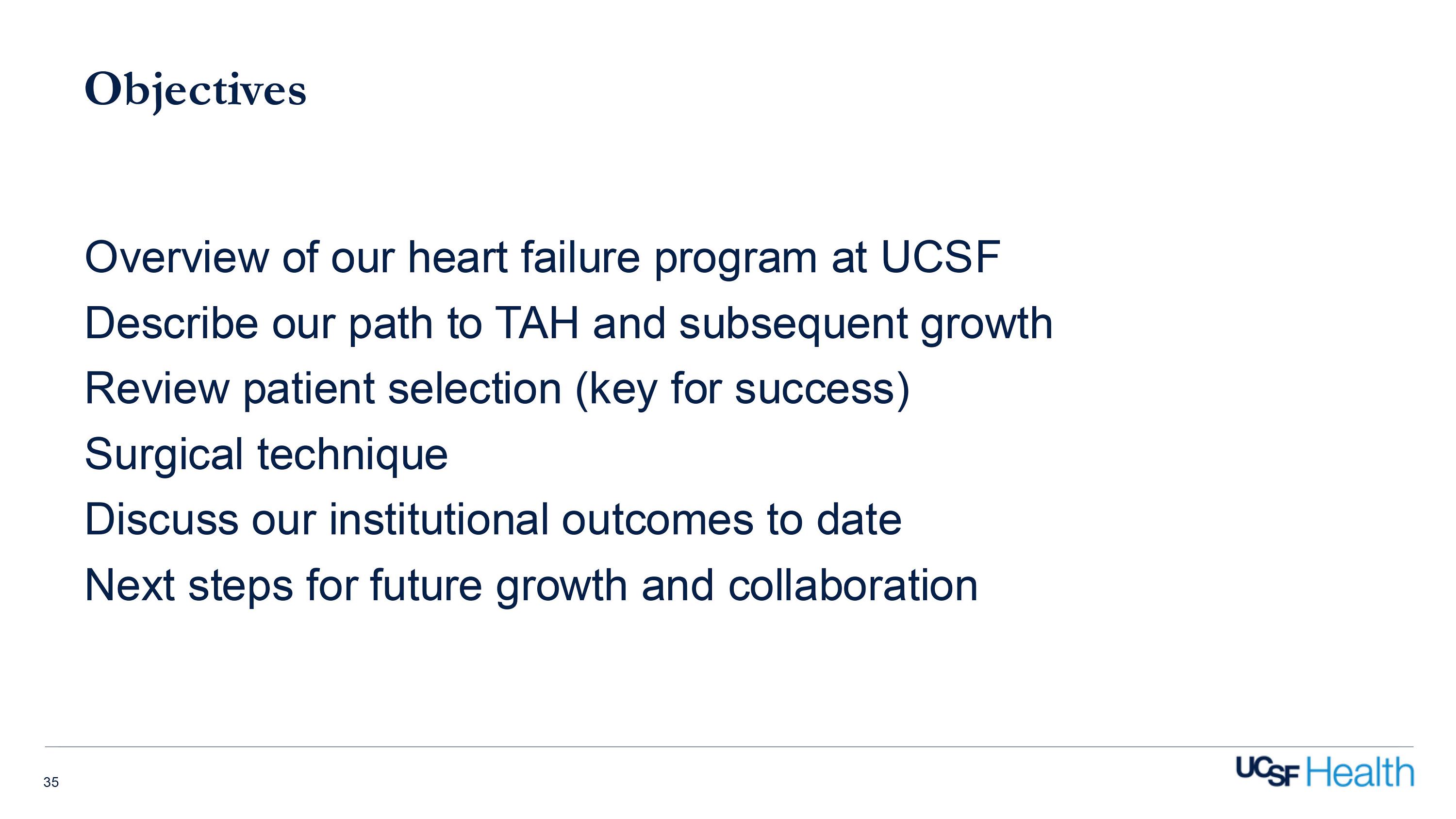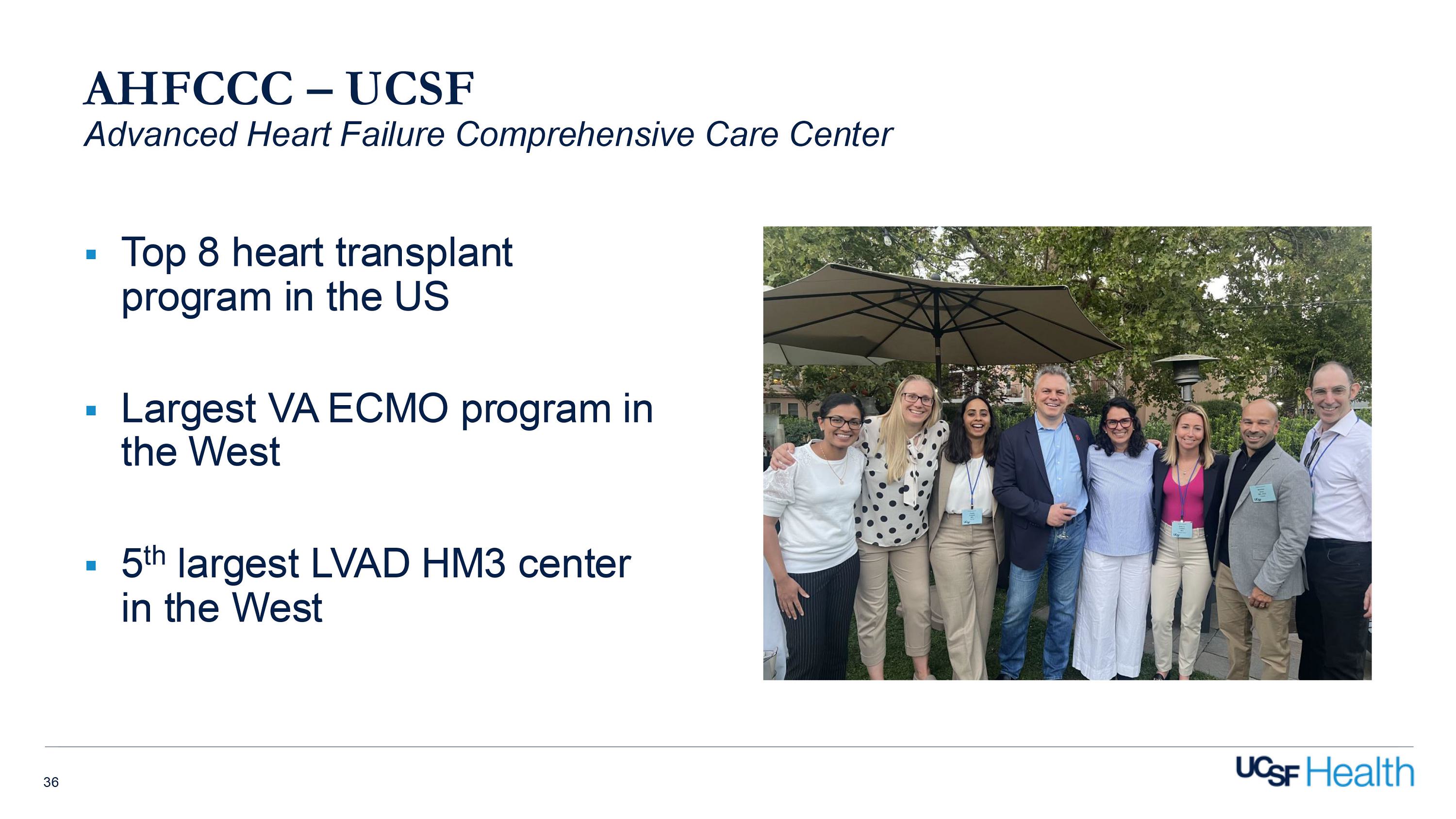 35 Objectives Overview of our heart failure program at UCSF Describe our path to TAH and subsequent growth Review patient selection (key for success) Surgical technique Discuss our institutional outcomes to date Next steps for future growth and collaboration