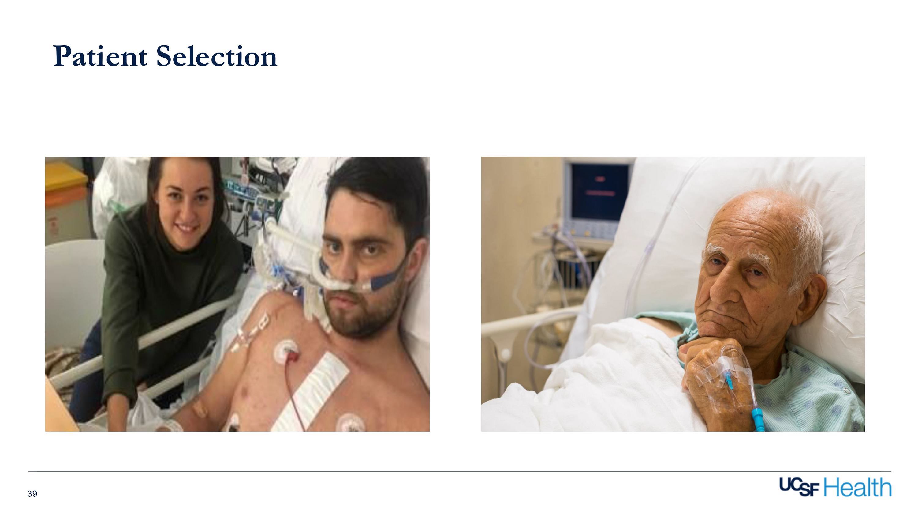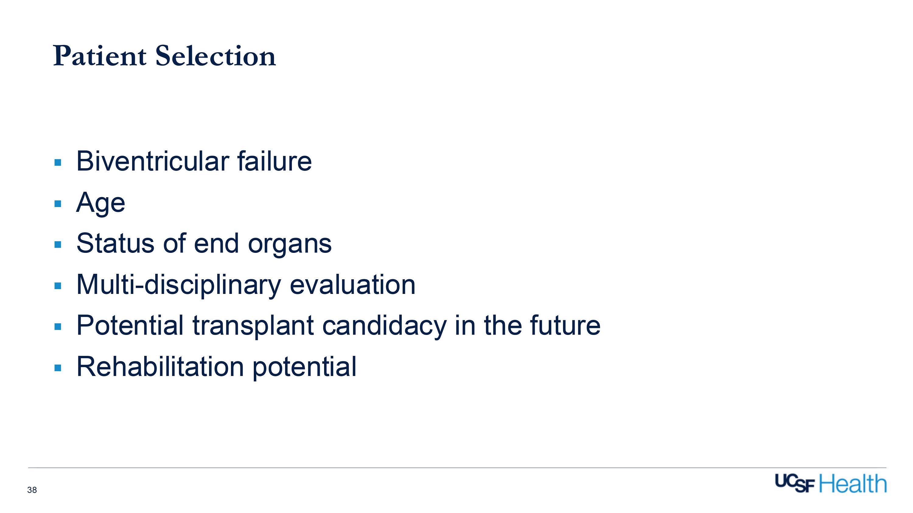 38 Patient Selection ▪ Biventricular failure ▪ Age ▪ Status of end organs ▪ Multi - disciplinary evaluation ▪ Potential transplant candidacy in the future ▪ Rehabilitation potential