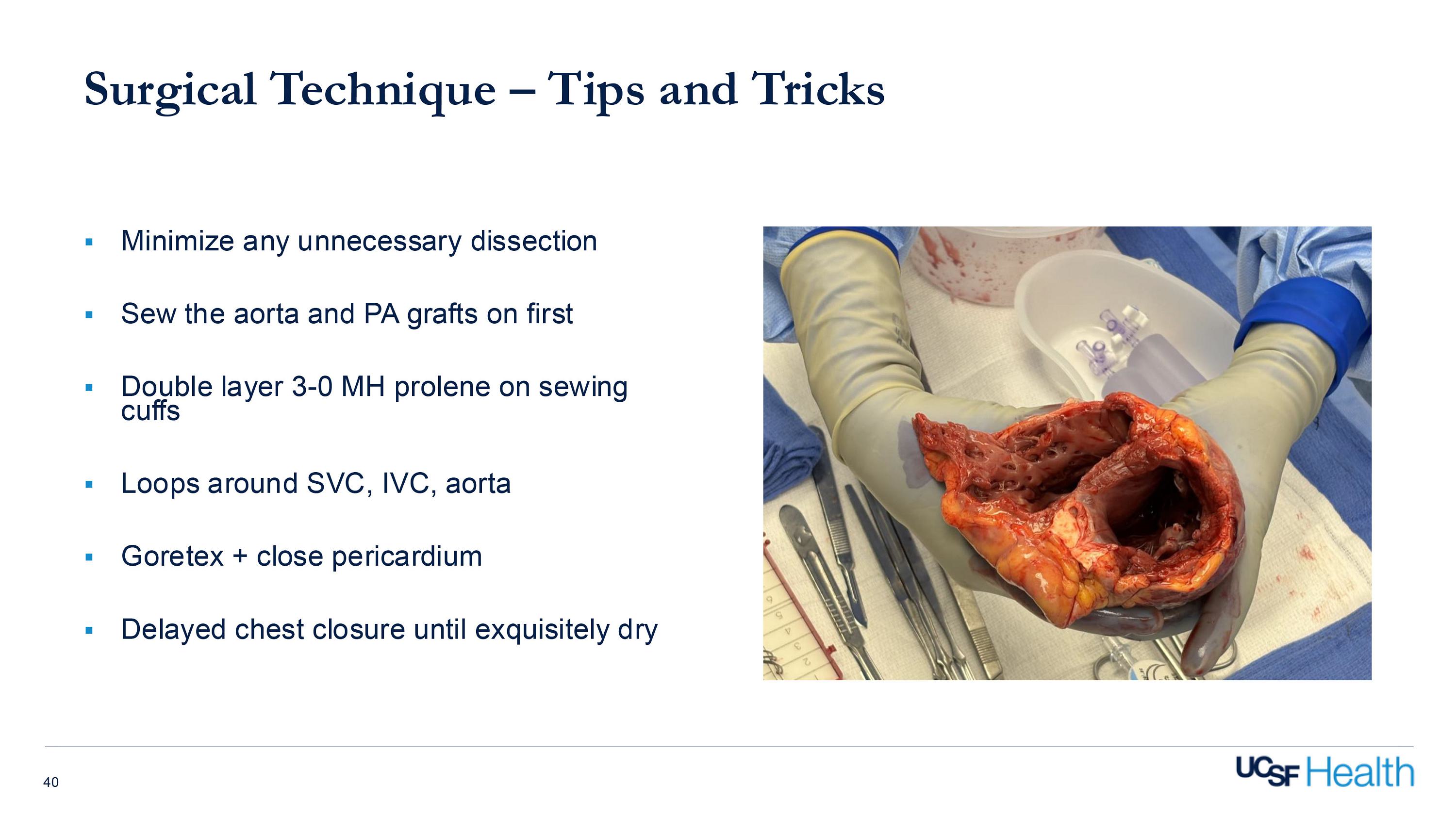 40 Surgical Technique – Tips and Tricks ▪ Minimize any unnecessary dissection ▪ Sew the aorta and PA grafts on first ▪ Double layer 3 - 0 MH prolene on sewing cuffs ▪ Loops around SVC, IVC, aorta ▪ Goretex + close pericardium ▪ Delayed chest closure until exquisitely dry