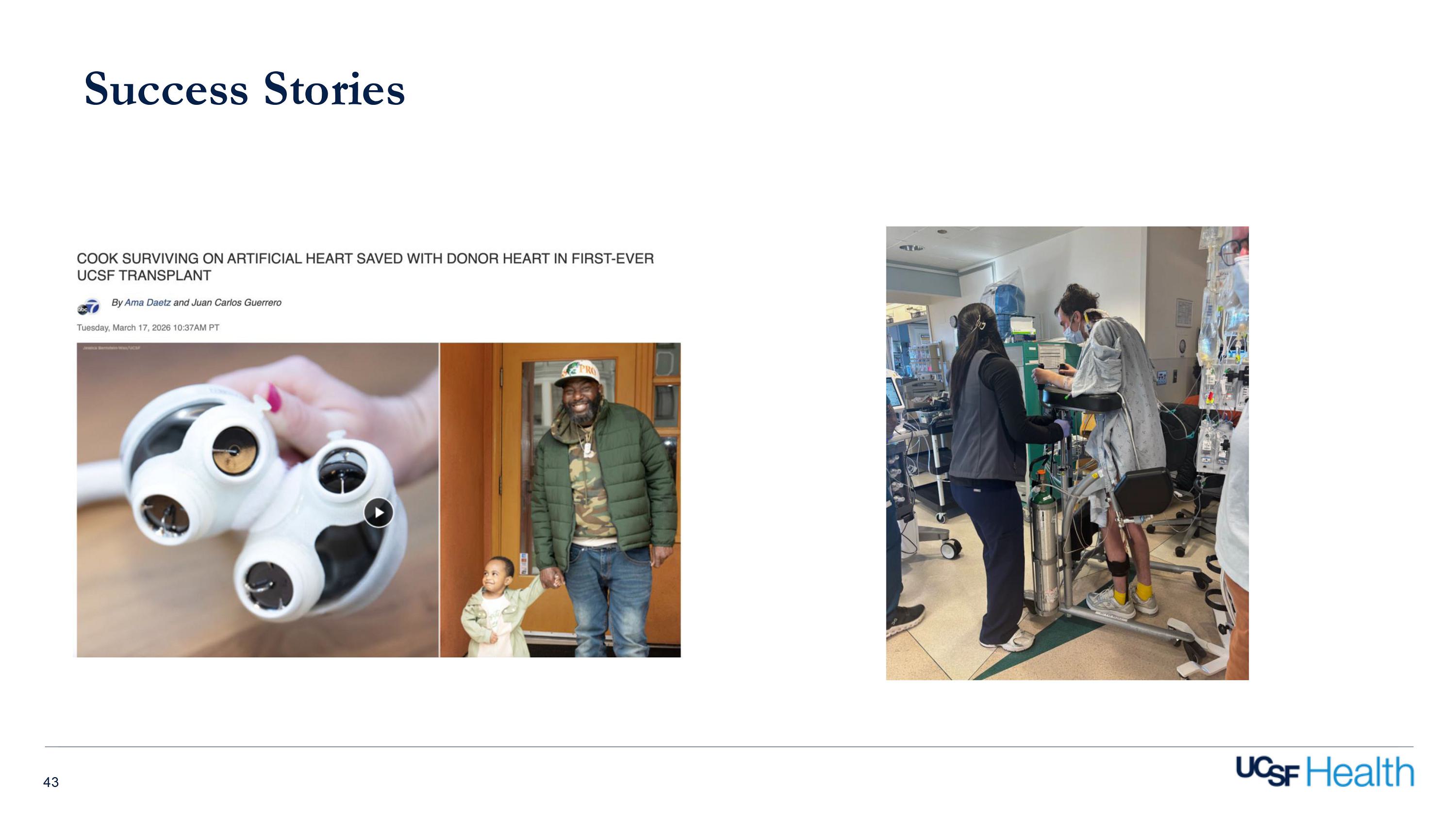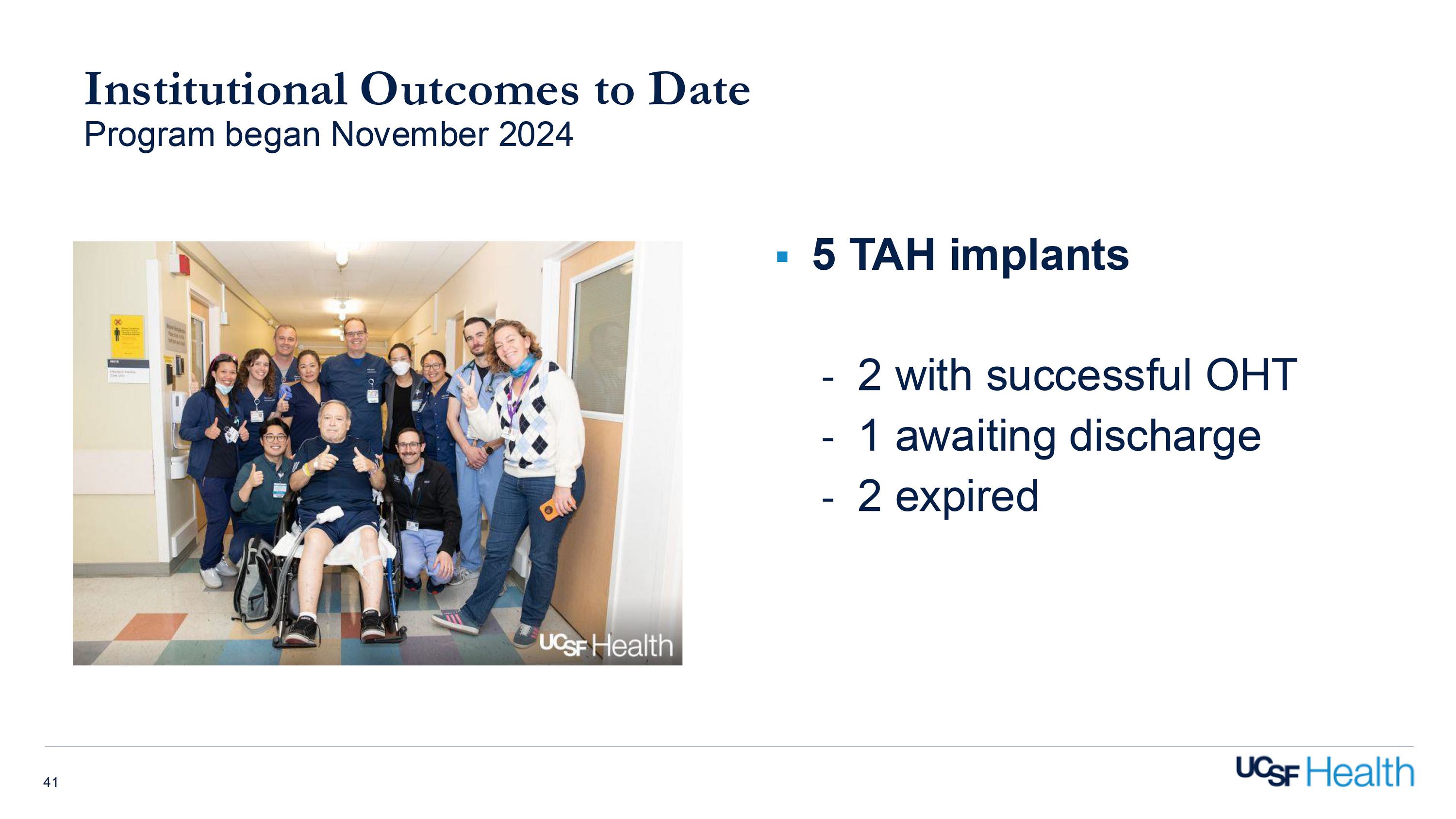 41 Institutional Outcomes to Date Program began November 2024 ▪ 5 TAH implants - 2 with successful OHT - 1 awaiting discharge - 2 expired