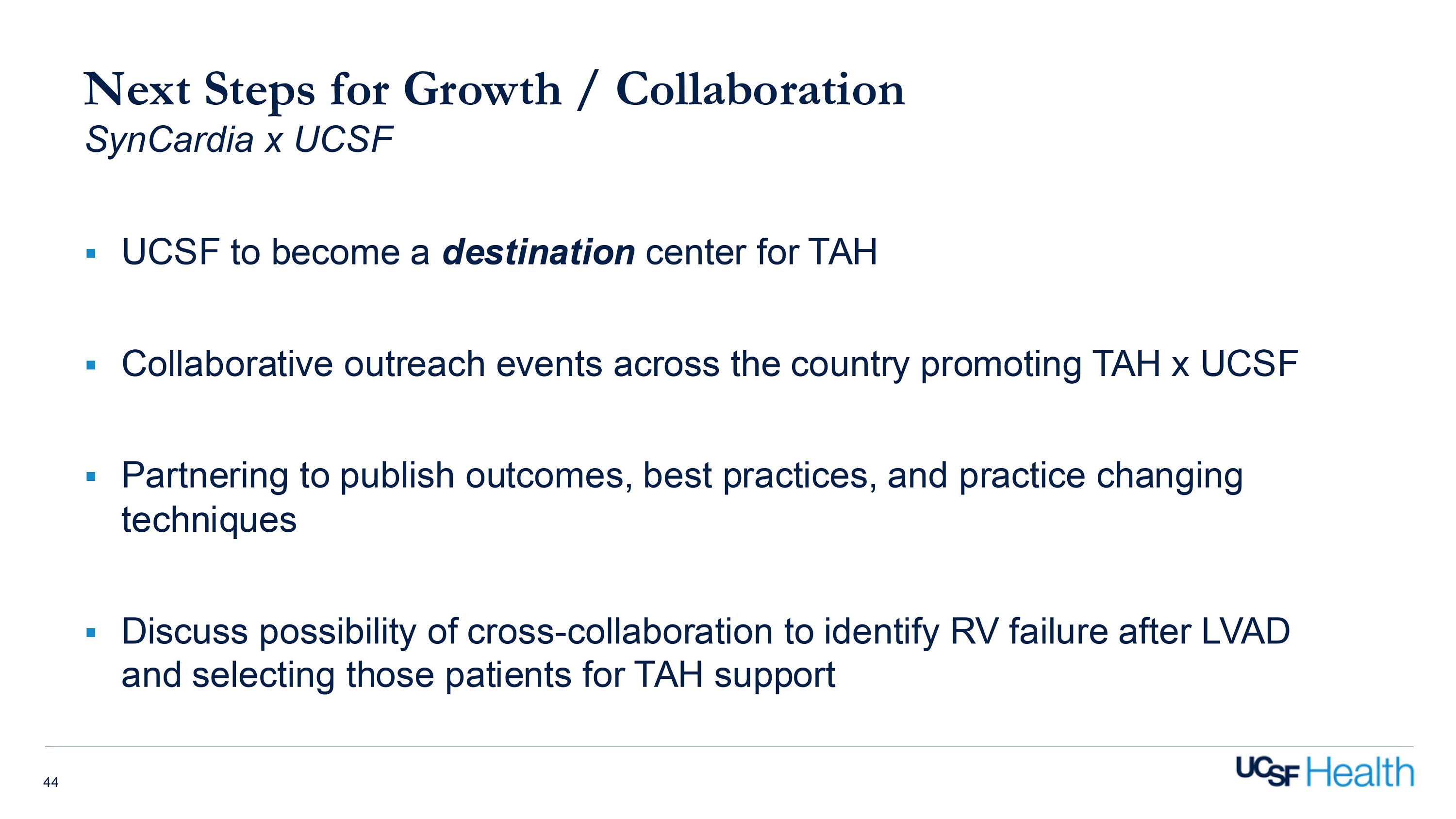 44 Next Steps for Growth / Collaboration SynCardia x UCSF ▪ UCSF to become a destination center for TAH ▪ Collaborative outreach events across the country promoting TAH x UCSF ▪ Partnering to publish outcomes, best practices, and practice changing techniques ▪ Discuss possibility of cross - collaboration to identify RV failure after LVAD and selecting those patients for TAH support