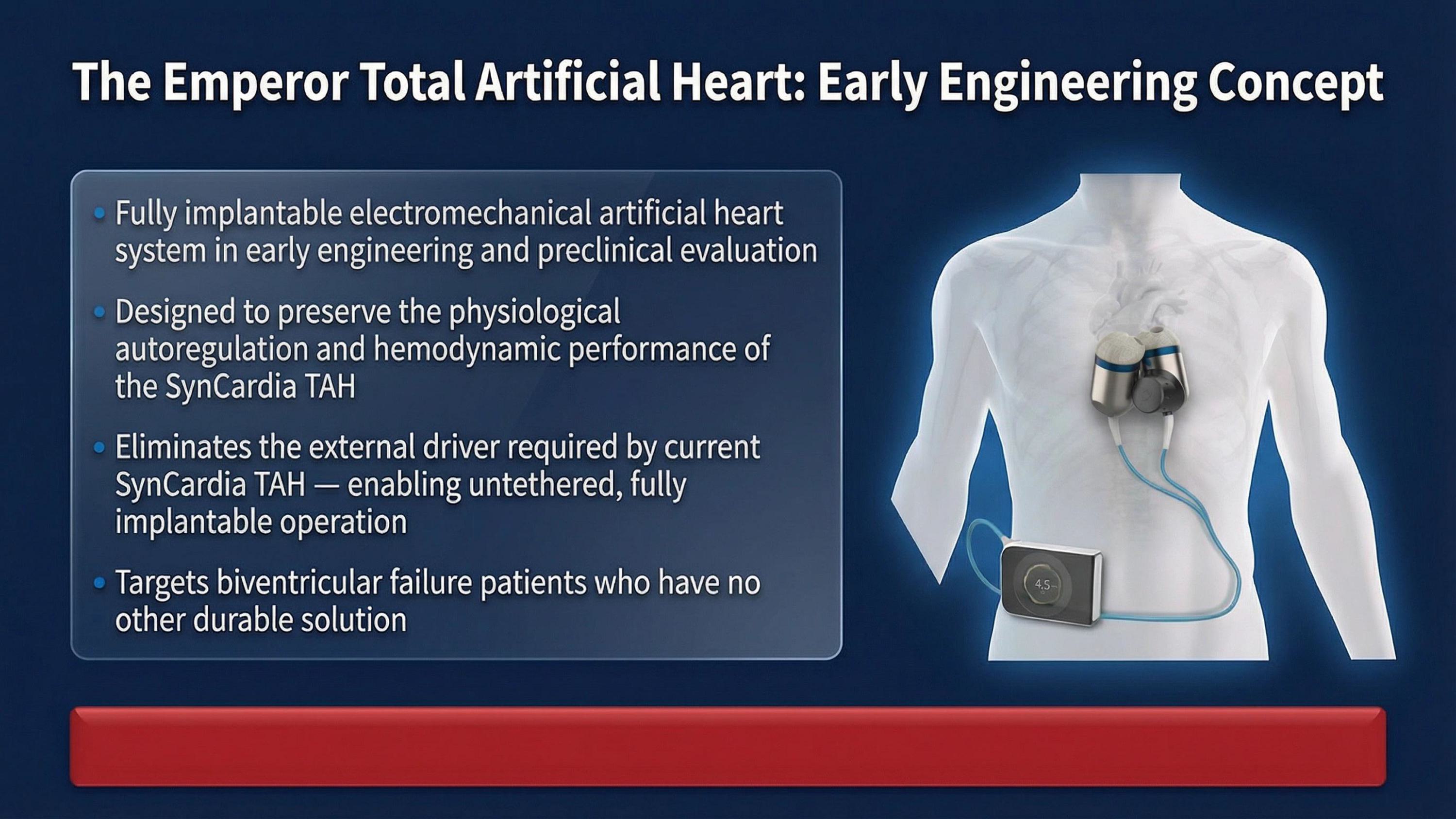 Emperor Total Artificial Heart SynCardia's products are approved for sale in the U.S. and Canada only. SynCardia Systems, LLC is a wholly owned subsidiary of Picard Medical Inc. © SynCardia Systems, LLC. All rights reserved. (1) US Patents: 11,918,798; 12,121,711 & China: CN 115279450 Sources: Picard Medical Inc SEC filings & SynCardia Systems LLC. • Development of a fully implantable artificial heart platform designed to eliminate external pneumatic drivers • Designed to preserve surgical placement and physiologic performance of the current SynCardia system • Incorporates internal power systems, wireless control, and transcutaneous energy transfer • Intended to improve long term patient mobility and quality of life • Three issued U.S. and one issued Chinese patent covering fully implantable artificial heart 1 Goal: Fully Implantable Power and Control Architecture