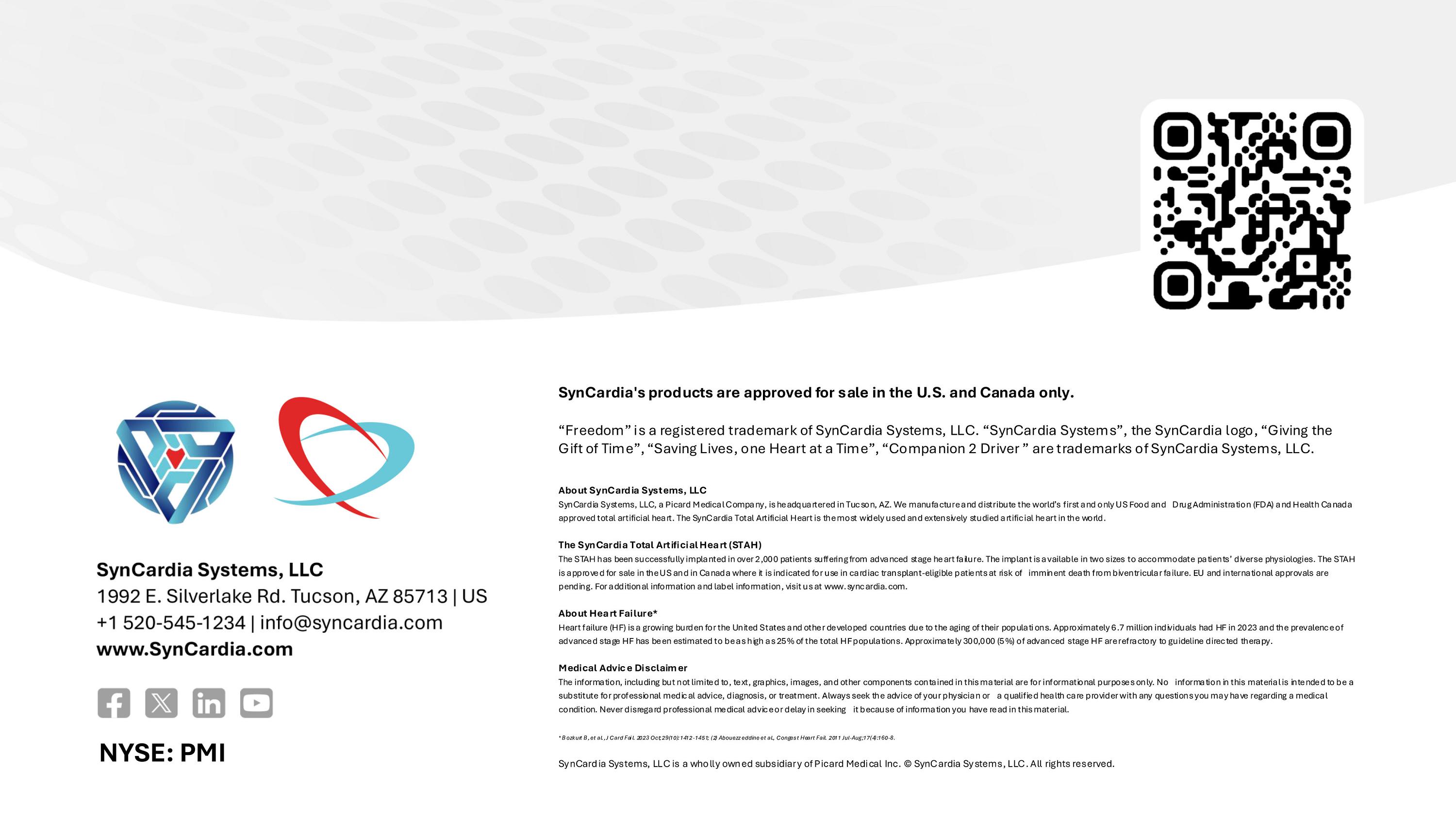 it because of information you have read in this material. * Bozkurt B, et al., J Card Fail. 2023 Oct;29(10):1412 - 1451; (2) Abouezzeddine et al., Congest Heart Fail. 2011 Jul - Aug;17(4):160 - 8. SynCardia Systems, LLC is a wholly owned subsidiary of Picard Medical Inc. © SynCardia Systems, LLC. All rights reserved. SynCardia's products are approved for sale in the U.S. and Canada only. “Freedom” is a registered trademark of SynCardia Systems, LLC. “ SynCardia Systems”, the SynCardia logo, “Giving the Gift of Time”, “Saving Lives, one Heart at a Time”, “Companion 2 Driver ” are trademarks of SynCardia Systems, LLC. NYSE: PMI