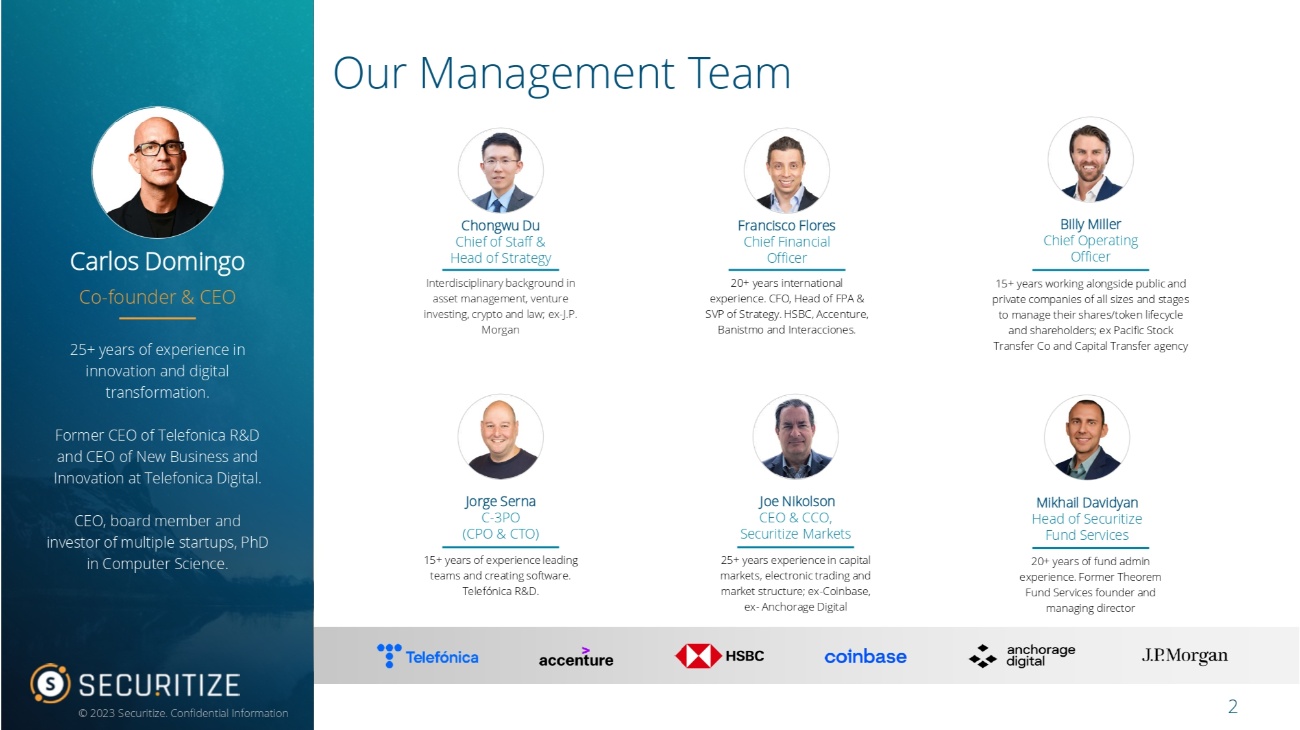Our Management Team 25+ years of experience in innovation and digital transformation. Former CEO of Telefonica R&D and CEO of New Business and Innovation at Telefonica Digital . CEO, board member and investor of multiple startups, PhD in Computer Science. Carlos Domingo Co - founder & CEO Joe Nikolson CEO & CCO, Securitize Markets 25+ years experience in capital markets, electronic trading and market structure; ex - Coinbase, ex - Anchorage Digital Jorge Serna C - 3PO (CPO & CTO) 15+ years of experience leading teams and creating software. Telefónica R&D. Chongwu Du Chief of Staff & Head of Strategy Interdisciplinary background in asset management, venture investing, crypto and law; ex - J.P. Morgan Francisco Flores Chief Financial Officer 20+ years international experience. CFO, Head of FPA & SVP of Strategy. HSBC, Accenture, Banistmo and Interacciones. Mikhail Davidyan Head of Securitize Fund Services 20+ years of fund admin experience. Former Theorem Fund Services founder and managing director Billy Miller Chief Operating Officer 15+ years working alongside public and private companies of all sizes and stages to manage their shares/token lifecycle and shareholders; ex Pacific Stock Transfer Co and Capital Transfer agency © 2025 Securitize. Confidential Information 2 © 2025 Securitize. Confidential Information