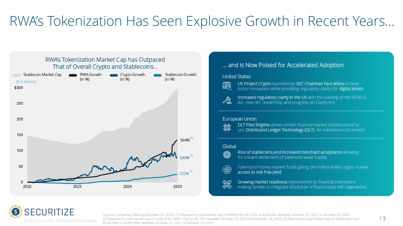 © 2025 Securitize. Confidential Information 12 Global Financial Markets are Ripe for Tokenization • Brings global finance onchain and enables digital representations of traditional investments • Embedded smart contracts with automated workflows to reduce costs, settlement risks and operational errors while enabling T+0 or instantaneous settlement • Unlocks features and utilities not possible on traditional rails • Allows for fractional ownership • Reduces friction in trading and regulatory processes with built - in programmable compliance Benefits of Tokenization Source: (1) ICMA, (March 2020). (2) Statistica, (May 2024). (3) SIFMA Research (August 2025). (4) BCG Global Asset Management Report (May 2023). (5) Allied Market Research, (October 2020). (6) IMF, (April 2024). Market Readiness for Tokenization $128tn Global Bond Market (1) $109tn Global Equity Market (2) $29tn U.S. Treasuries Market (3) $20tn Alternative Asset Market (4) $11tn Real Estate Investment (5) Market $2tn Global Private Credit (6)