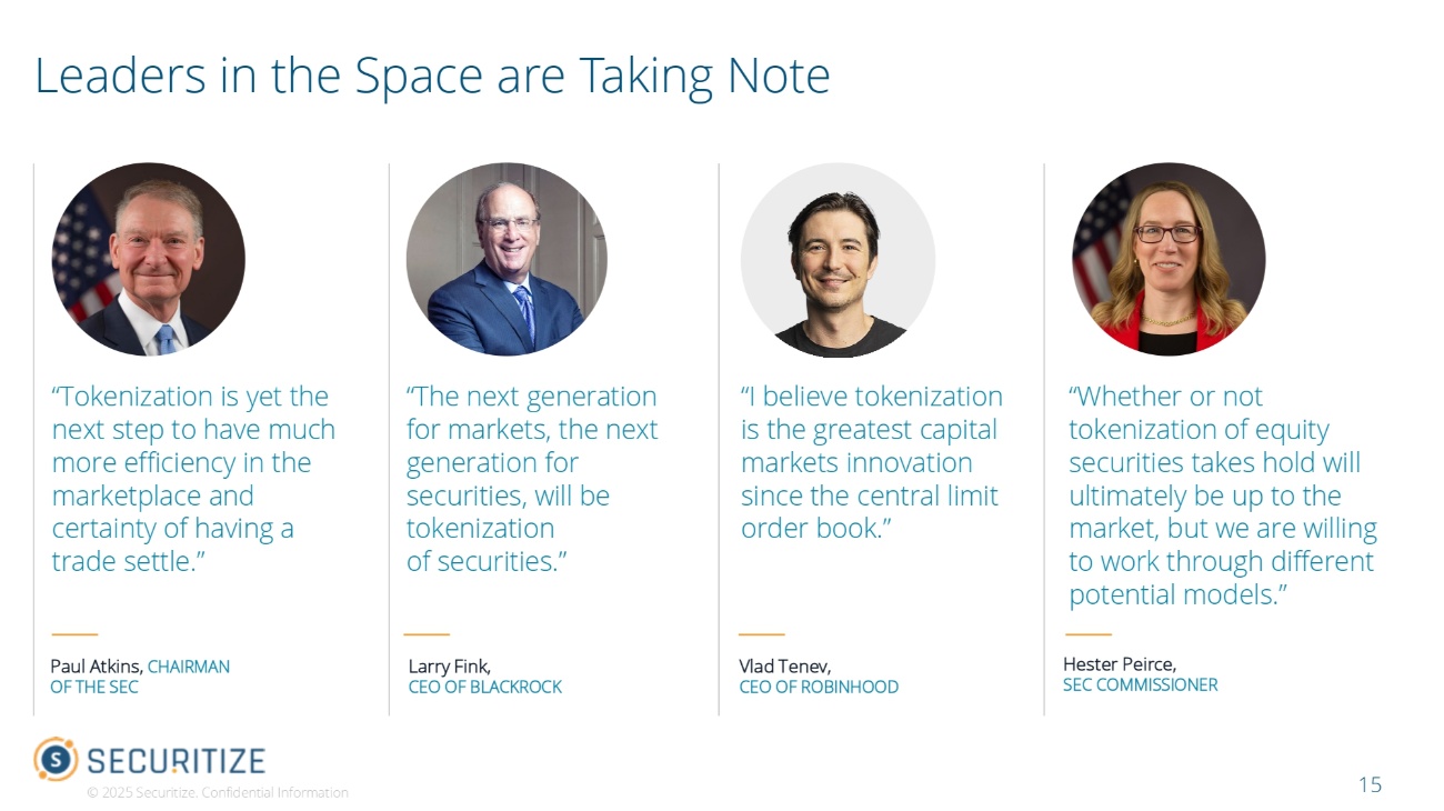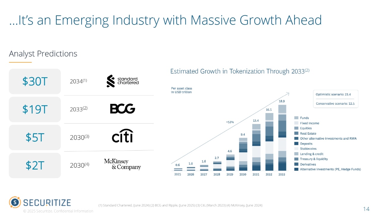 © 2025 Securitize. Confidential Information 14 …It’s an Emerging Industry with Massive Growth Ahead Analyst Predictions $30T $19T $5T $2T 2034 (1) 2033 (2) 2030 (3) 2030 (4) (1) Standard Chartered, (June 2024) (2) BCG and Ripple, (June 2025) (3) Citi, (March 2023) (4) McKinsey, (June 2024) (2)