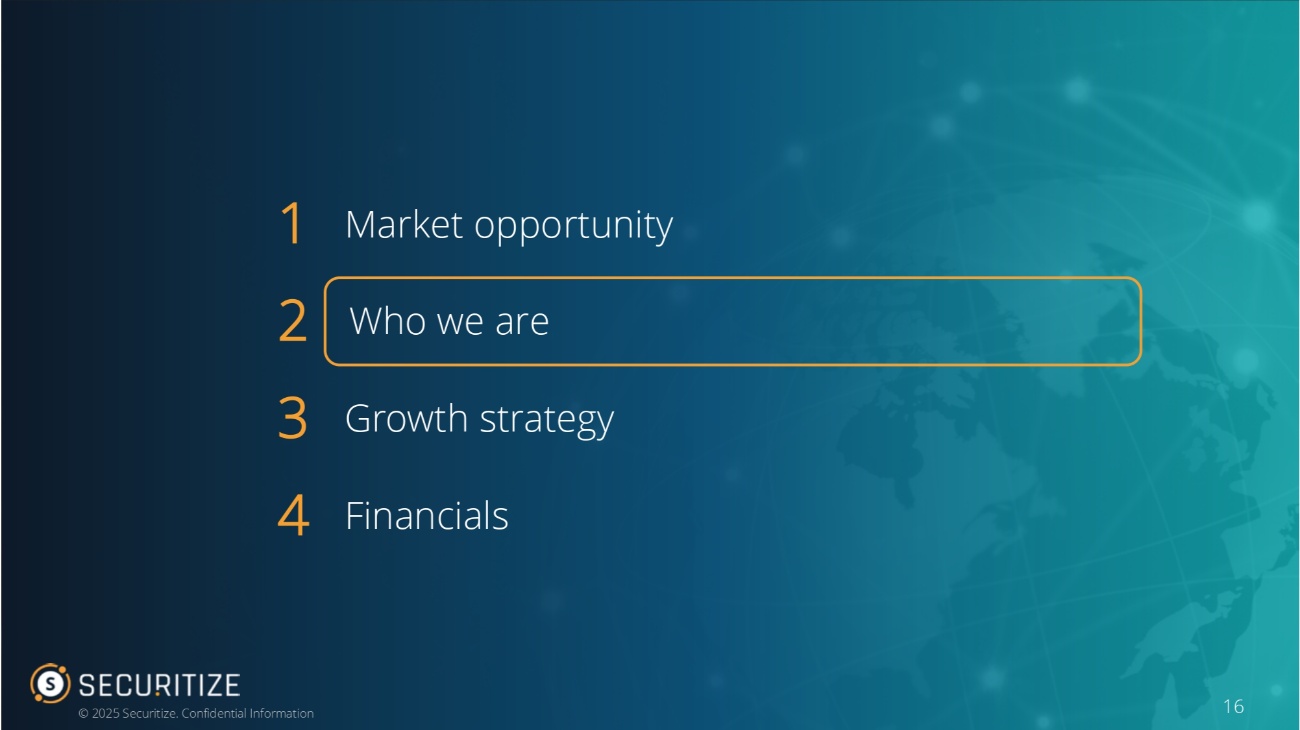 1 Market opportunity Who we are © 2025 Securitize. Confidential Information 16 © 2025 Securitize. Confidential Information Growth strategy 2 3 4 Financials