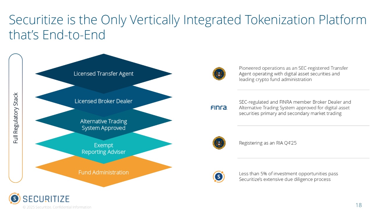 The Securitize Platform Powers the End - to - End Relationship Between Issuers and Investors Securitize offers a comprehensive and fully - regulated stack, including an SEC - registered transfer agent (permits the issuance and management of tokenized securities), an SEC - registered broker - dealer and an alternative trading system (permits asset raising and trading of tokenized securities), as well as a digital assets - focused fund administration business Issuers Investors Minting, Burning, Smart Contracts Tokenization Tokenization Engine DeFi Integrations Trading, Lending, Collateral Management & Borrowing Asset Servicing Distribution Broker Dealer Regulated ATS Transfer Agent Fund Admin 17 © 2025 Securitize. Confidential Information