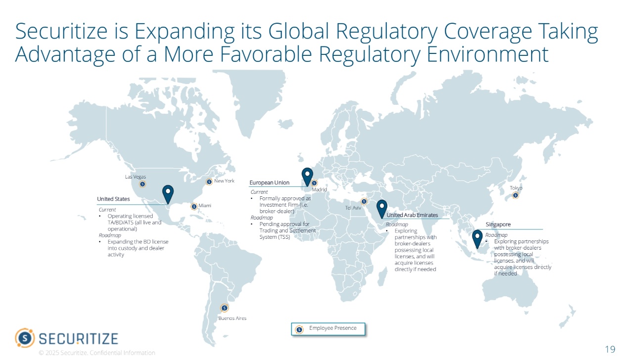 Securitize is the Only Vertically Integrated Tokenization Platform that’s End - to - End Pioneered operations as an SEC - registered Transfer Agent operating with digital asset securities and leading crypto fund administration SEC - regulated and FINRA member Broker Dealer and Alternative Trading System approved for digital asset securities primary and secondary market trading Registering as an RIA Q4’25 Less than 5% of investment opportunities pass Securitize’s extensive due diligence process Full Regulatory Stack Licensed Broker Dealer Alternative Trading System Approved Exempt Reporting Adviser Licensed Transfer Agent Fund Administration 18 © 2025 Securitize. Confidential Information