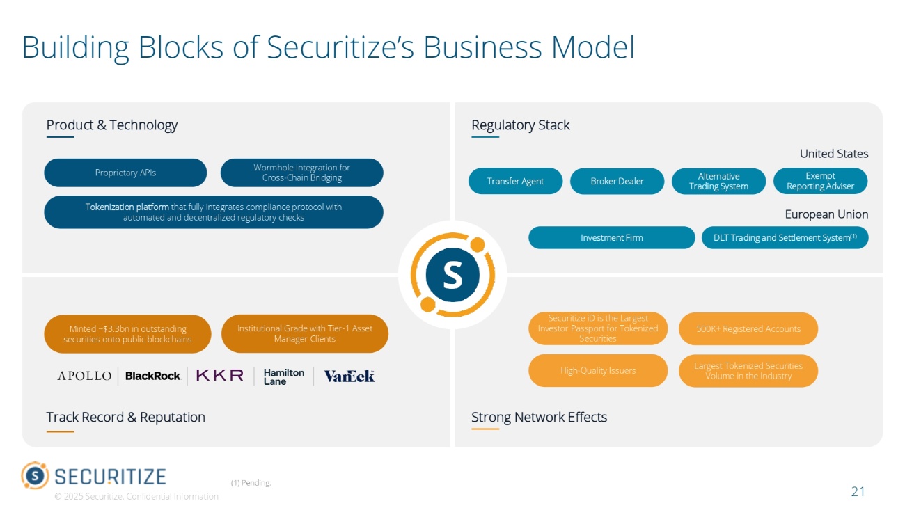 Securitize is Widely Integrated with the Digital Asset Ecosystem Natively integrated with leading and public blockchains, enabling seamless token issuance, transfer and settlement across networks Connected with top tier custodians and oracle providers to ensure institutional - grade asset safeguarding, data integrity and regulatory compliance Directly linked to major DeFi platforms and stablecoin infrastructure, expanding liquidity access and enabling tokenized assets to interact with onchain finance Actively supported by institutional brokers and liquidity providers, enhancing market depth, price discovery and secondary market efficiency for digital assets 20 © 2025 Securitize. Confidential Information