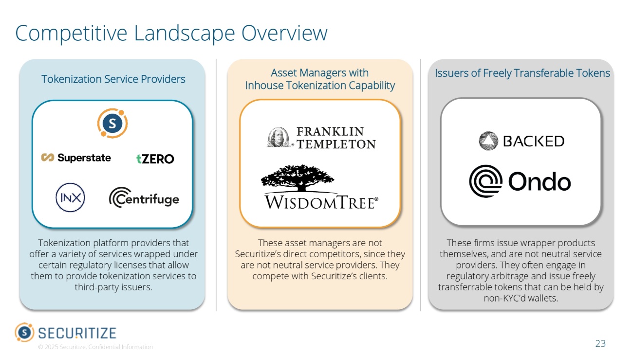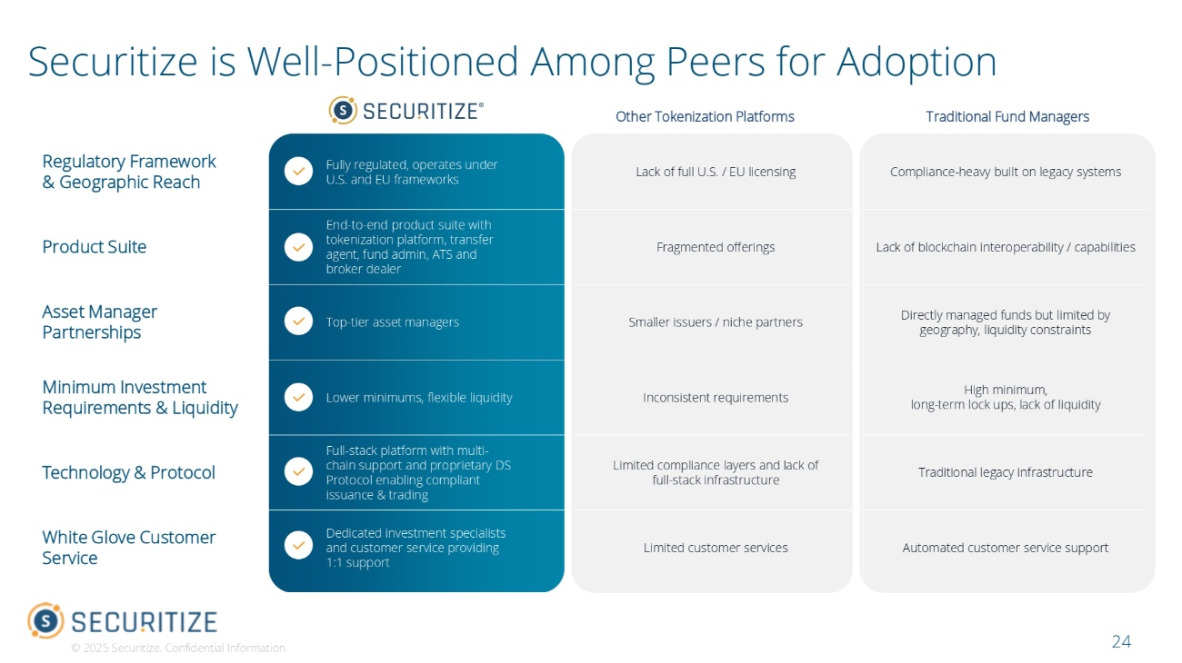 Competitive Landscape Overview Asset Managers with Inhouse Tokenization Capability These asset managers are not Securitize’s direct competitors, since they are not neutral service providers. They compete with Securitize’s clients. Issuers of Freely Transferable Tokens These firms issue wrapper products themselves, and are not neutral service providers. They often engage in regulatory arbitrage and issue freely transferrable tokens that can be held by non - KYC’d wallets. Tokenization Service Providers Tokenization platform providers that offer a variety of services wrapped under certain regulatory licenses that allow them to provide tokenization services to third - party issuers. 23 © 2025 Securitize. Confidential Information