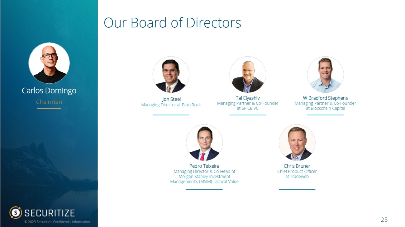 Our Board of Directors Carlos Domingo Chairman Jon Steel Managing Director at BlackRock W Bradford Stephens Managing Partner & Co - Founder at Blockchain Capital Chris Bruner Chief Product Officer at Tradeweb Tal Elyashiv Managing Partner & Co - Founder at SPiCE VC Pedro Teixeira Managing Director & Co - Head of Morgan Stanley Investment Management's (MSIM) Tactical Value © 2025 Securitize. Confidential Information 25 © 2023 Securitize. Confidential Information