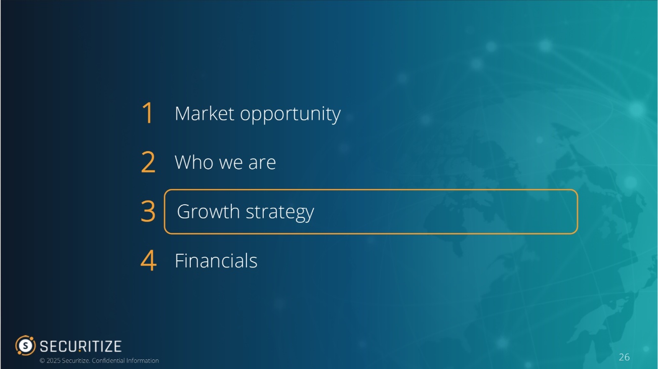 1 Market opportunity Who we are Growth strategy © 2025 Securitize. Confidential Information 26 © 2023 Securitize. Confidential Information 2 3 4 Financials