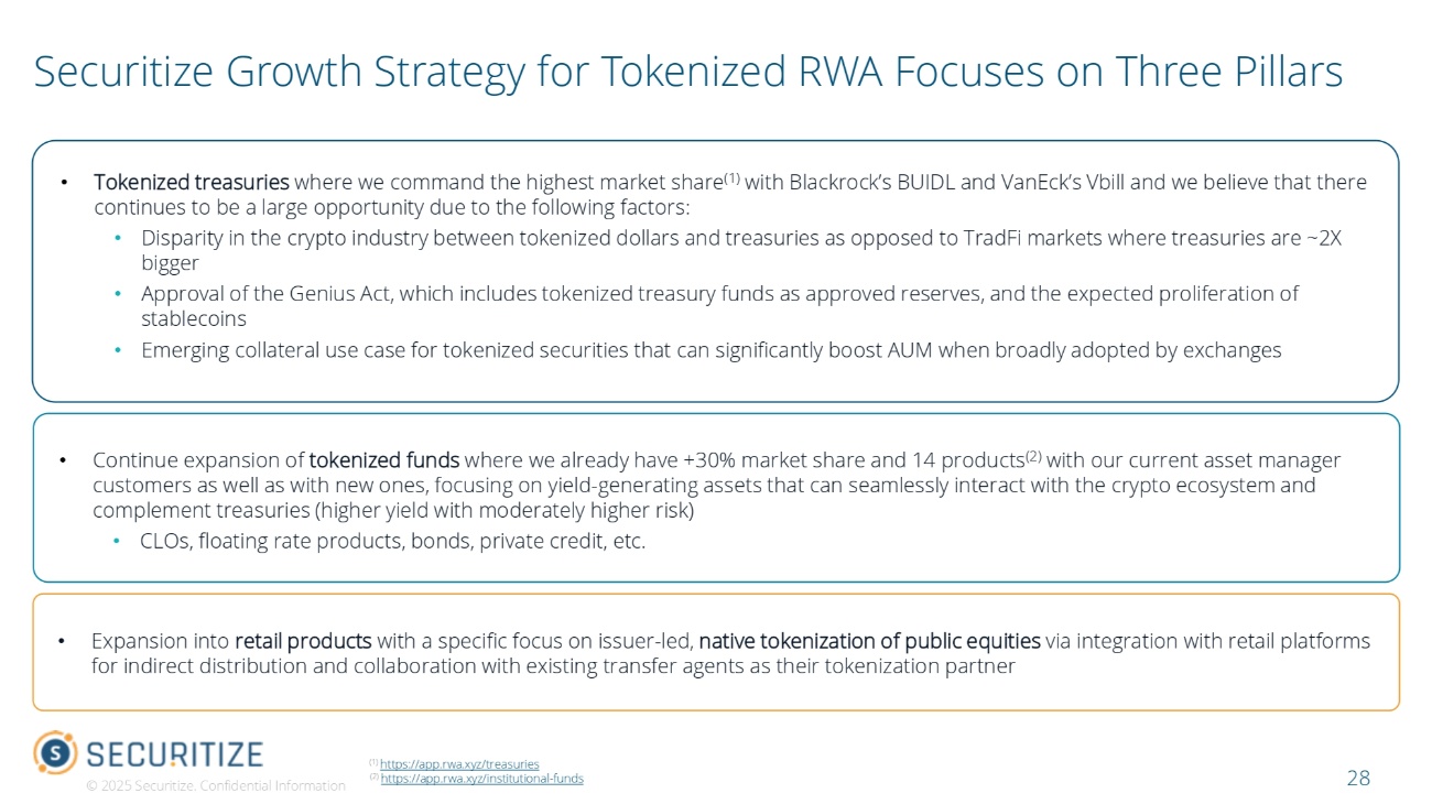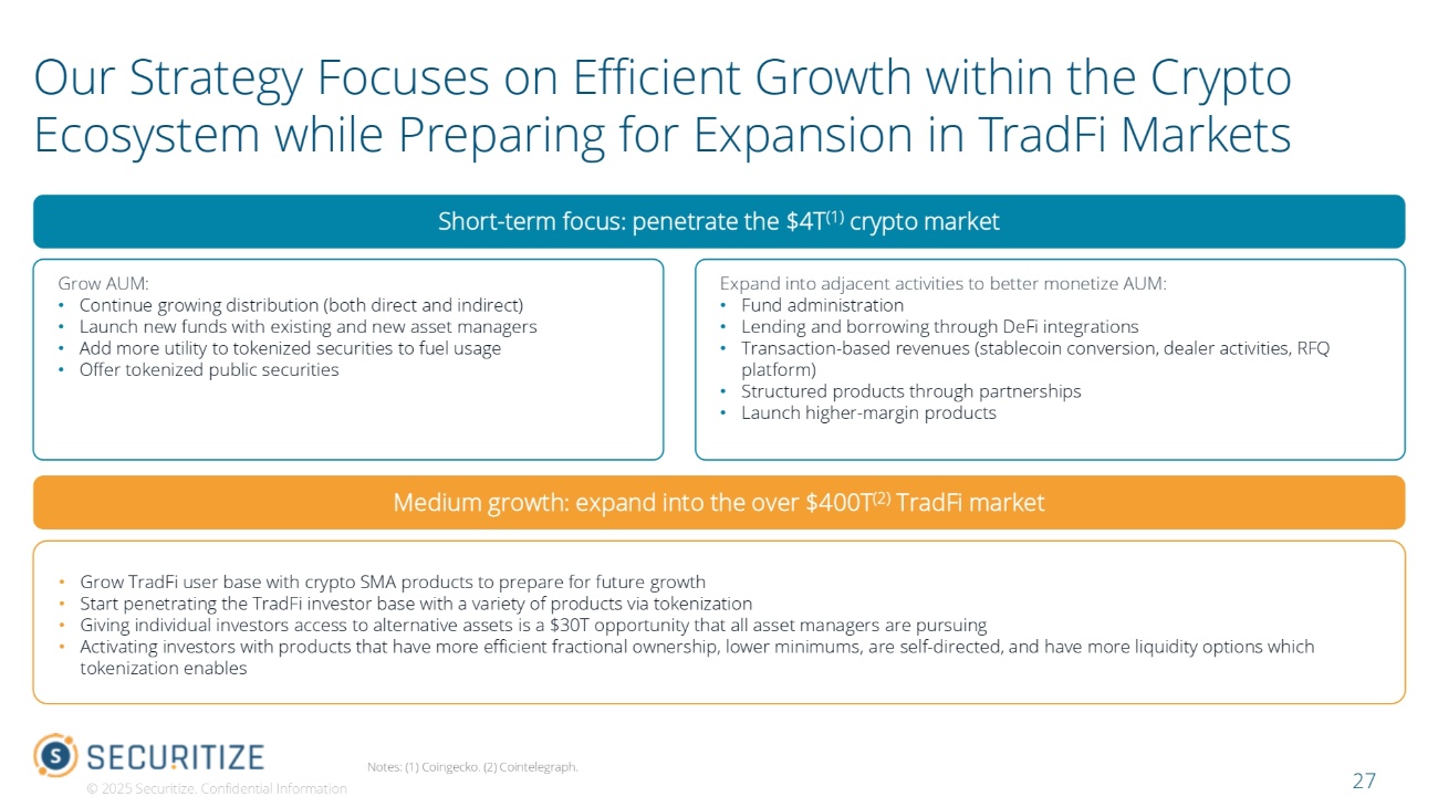 © 2025 Securitize. Confidential Information 27 Our Strategy Focuses on Efficient Growth within the Crypto Ecosystem while Preparing for Expansion in TradFi Markets Short - term focus: penetrate the $4T (1) crypto market Medium growth: expand into the over $400T (2) TradFi market Grow AUM: • Continue growing distribution (both direct and indirect) • Launch new funds with existing and new asset managers • Add more utility to tokenized securities to fuel usage • Offer tokenized public securities Expand into adjacent activities to better monetize AUM: • Fund administration • Lending and borrowing through DeFi integrations • Transaction - based revenues (stablecoin conversion, dealer activities, RFQ platform) • Structured products through partnerships • Launch higher - margin products • Grow TradFi user base with crypto SMA products to prepare for future growth • Start penetrating the TradFi investor base with a variety of products via tokenization • Giving individual investors access to alternative assets is a $30T opportunity that all asset managers are pursuing • Activating investors with products that have more efficient fractional ownership, lower minimums, are self - directed, and have more liquidity options which tokenization enables Notes: (1) Coingecko. (2) Cointelegraph.