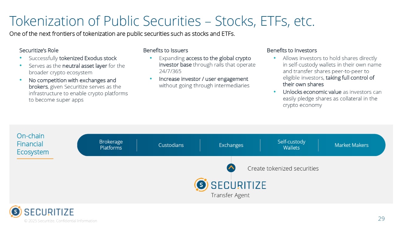 © 2025 Securitize. Confidential Information 28 • Expansion into retail products with a specific focus on issuer - led, native tokenization of public equities via integration with retail platforms for indirect distribution and collaboration with existing transfer agents as their tokenization partner • Continue expansion of tokenized funds where we already have +30% market share and 14 products (2) with our current asset manager customers as well as with new ones, focusing on yield - generating assets that can seamlessly interact with the crypto ecosystem and complement treasuries (higher yield with moderately higher risk) • CLOs, floating rate products, bonds, private credit, etc. • Tokenized treasuries where we command the highest market share (1) with Blackrock’s BUIDL and VanEck’s Vbill and we believe that there continues to be a large opportunity due to the following factors: • Disparity in the crypto industry between tokenized dollars and treasuries as opposed to TradFi markets where treasuries are ~2X bigger • Approval of the Genius Act, which includes tokenized treasury funds as approved reserves, and the expected proliferation of stablecoins • Emerging collateral use case for tokenized securities that can significantly boost AUM when broadly adopted by exchanges Securitize Growth Strategy for Tokenized RWA Focuses on Three Pillars (1) https://app.rwa.xyz/treasuries (2) https://app.rwa.xyz/institutional - funds