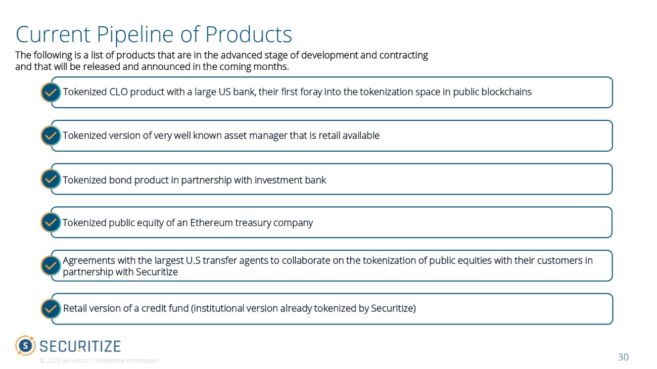 Current Pipeline of Products The following is a list of products that are in the advanced stage of development and contracting and that will be released and announced in the coming months. Tokenized CLO product with a large US bank, their first foray into the tokenization space in public blockchains Tokenized bond product in partnership with investment bank Tokenized version of very well known asset manager that is retail available Tokenized public equity of an Ethereum treasury company Agreements with the largest U.S transfer agents to collaborate on the tokenization of public equities with their customers in partnership with Securitize Retail version of a credit fund (institutional version already tokenized by Securitize) 30 © 2025 Securitize. Confidential Information