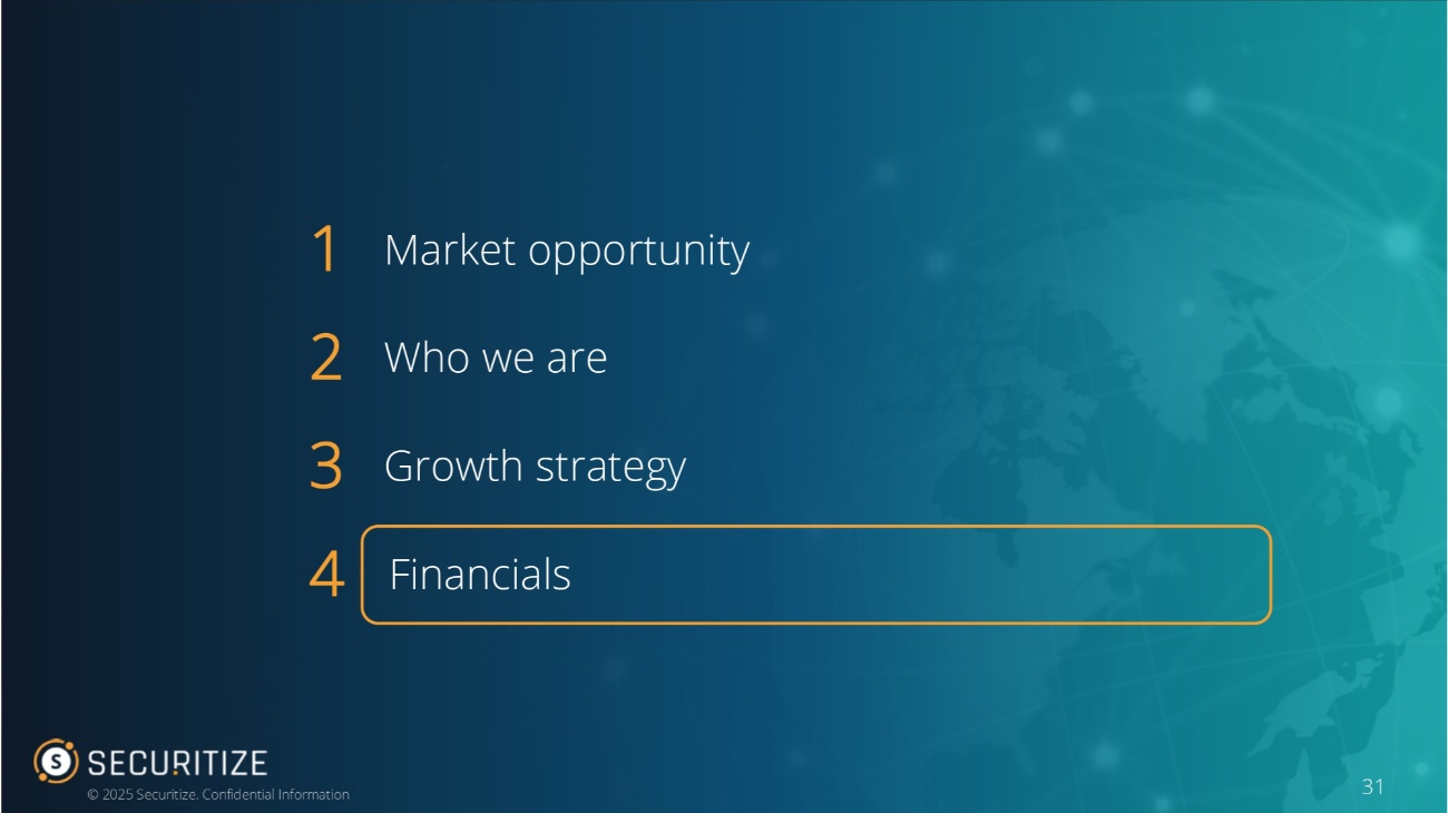 1 Market opportunity Who we are Growth strategy 2 3 4 Financials © 2025 Securitize. Confidential Information 31 © 2025 Securitize. Confidential Information