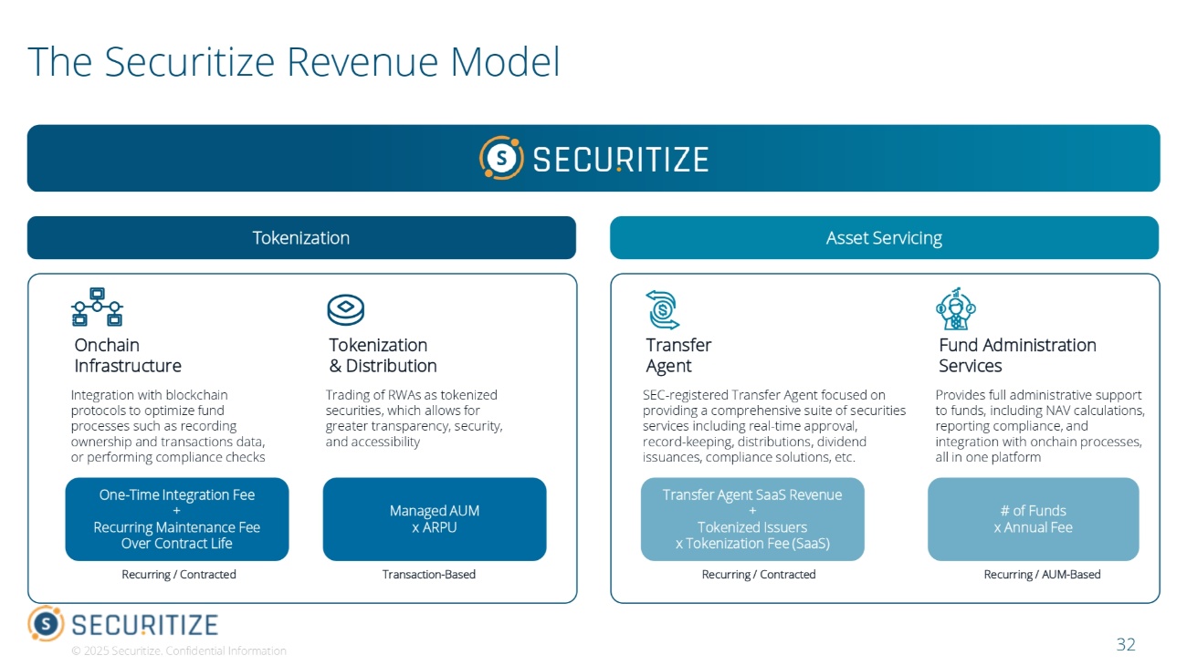 The Securitize Revenue Model Tokenization Asset Servicing Onchain Infrastructure Integration with blockchain protocols to optimize fund processes such as recording ownership and transactions data, or performing compliance checks Tokenization & Distribution Trading of RWAs as tokenized securities, which allows for greater transparency, security, and accessibility Fund Administration Services Provides full administrative support to funds, including NAV calculations, reporting compliance, and integration with onchain processes, all in one platform Transfer Agent SEC - registered Transfer Agent focused on providing a comprehensive suite of securities services including real - time approval, record - keeping, distributions, dividend issuances, compliance solutions, etc. Managed AUM x ARPU # of Funds x Annual Fee Transaction - Based One - Time Integration Fee + Recurring Maintenance Fee Over Contract Life Recurring / Contracted Recurring / AUM - Based Transfer Agent SaaS Revenue + Tokenized Issuers x Tokenization Fee (SaaS) Recurring / Contracted 32 © 2025 Securitize. Confidential Information