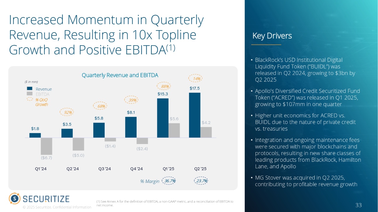 © 2025 Securitize. Confidential Information 33 Increased Momentum in Quarterly Revenue, Resulting in 10x Topline Growth and Positive EBITDA (1) • BlackRock’s USD Institutional Digital Liquidity Fund Token (“BUIDL”) was released in Q2 2024, growing to $3bn by Q2 2025 • Apollo’s Diversified Credit Securitized Fund Token (“ACRED”) was released in Q1 2025, growing to $107mm in one quarter • Higher unit economics for ACRED vs. BUIDL due to the nature of private credit vs. treasuries • Integration and ongoing maintenance fees were secured with major blockchains and protocols, resulting in new share classes of leading products from BlackRock, Hamilton Lane, and Apollo • MG Stover was acquired in Q2 2025, contributing to profitable revenue growth $1.8 $3.5 $5.8 $8.1 ($6.7) ($5.0) ($1.4) ($2.4) $5.6 $4.2 Q1 '24 Q2 '24 Q3 '24 Q4 '24 Q1 '25 Q2 '25 Quarterly Revenue and EBITDA % Margin ($ in mm) Revenue EBITDA % QoQ Growth 92% 68% 39% 88% $15.3 14% $17.5 36.7% 23.7% Key Drivers (1) See Annex A for the definition of EBITDA, a non - GAAP metric, and a reconciliation of EBITDA to net income.