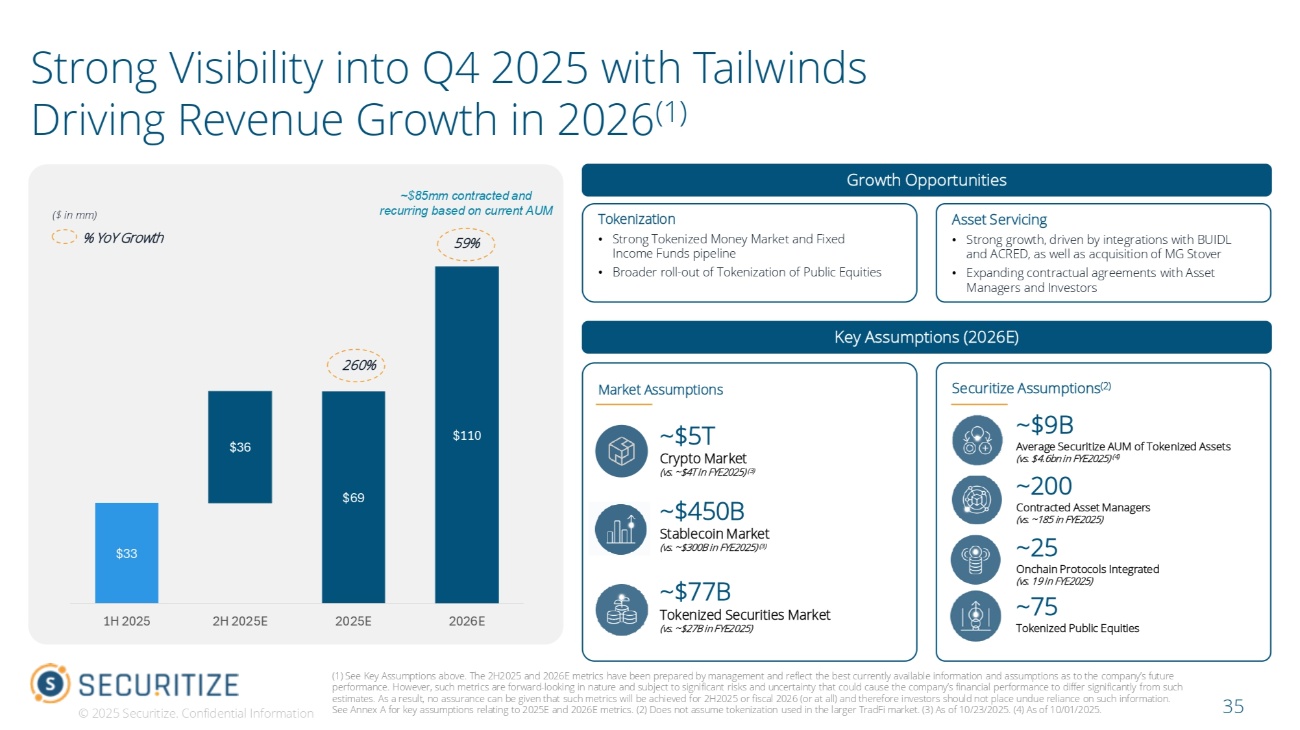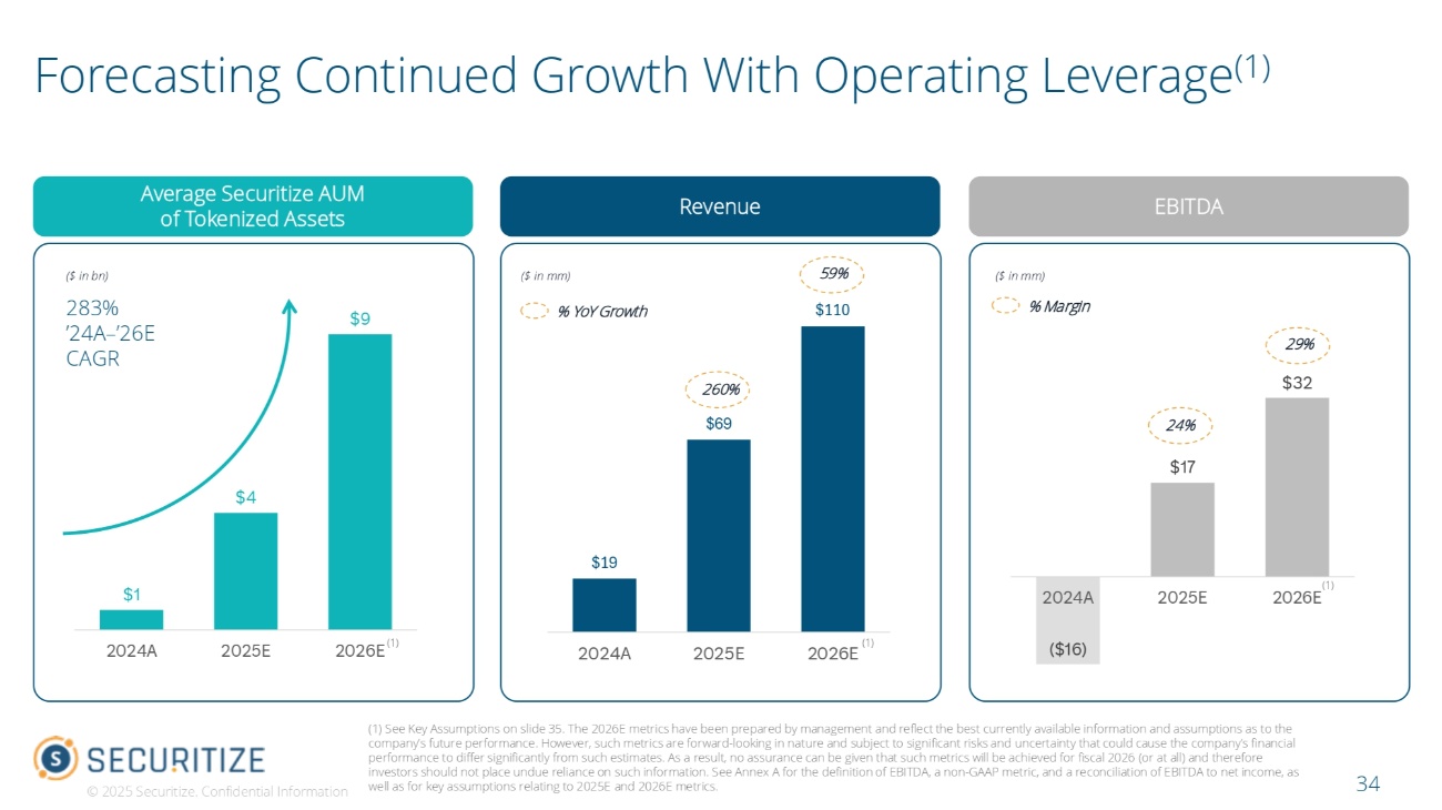 © 2025 Securitize. Confidential Information 34 Forecasting Continued Growth With Operating Leverage (1) ($ in bn) Average Securitize AUM of Tokenized Assets Revenue EBITDA $19 2024A 2025E ($16) $17 2024A 2025E $1 $4 $9 2024A 2025E 283% ’24A – ’26E CAGR 2026E (1) ($ in mm) 59% $110 260% $69 % YoY Growth (1) 2026E 24% 29% $32 ($ in mm) % Margin (1) 2026E (1) See Key Assumptions on slide 35. The 2026E metrics have been prepared by management and reflect the best currently available information and assumptions as to the company’s future performance. However, such metrics are forward - looking in nature and subject to significant risks and uncertainty that could cause the company’s financial performance to differ significantly from such estimates. As a result, no assurance can be given that such metrics will be achieved for fiscal 2026 (or at all) and therefore investors should not place undue reliance on such information. See Annex A for the definition of EBITDA, a non - GAAP metric, and a reconciliation of EBITDA to net income, as well as for key assumptions relating to 2025E and 2026E metrics.