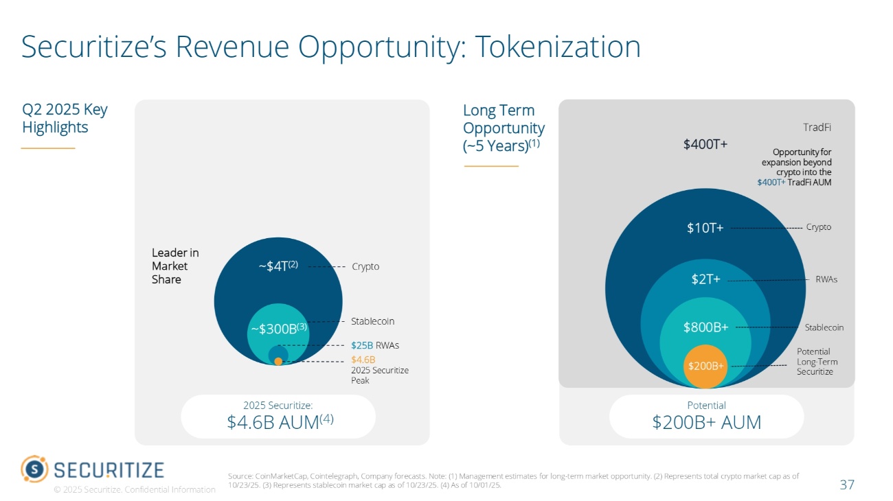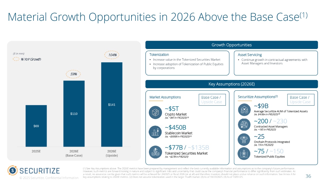 © 2025 Securitize. Confidential Information 36 Material Growth Opportunities in 2026 Above the Base Case (1) 104% ($ in mm) % YoY Growth Growth Opportunities Key Assumptions (2026E) Market Assumptions Securitize Assumptions (2) ~$450B Stablecoin Market (vs. ~$300B in FYE2025) (3) ~$77B / ~$135B Tokenized Securities Market (vs. ~$27B in FYE2025) ~$9B Average Securitize AUM of Tokenized Assets (vs. $4.6bn in FYE2025) (4) ~200 / ~230 Contracted Asset Managers (vs. ~185 in FYE2025) ~25 Onchain Protocols Integrated (vs. 19 in FYE2025) ~75 / ~150 Tokenized Public Equities ~$5T Crypto Market (vs. ~$4T in FYE2025) (3) Tokenization • Increase value in the Tokenized Securities Market • Increase adoption of Tokenization of Public Equities by corporations Asset Servicing • Continue growth in contractual agreements with Asset Managers and Investors $69 $110 $141 2025E 2026E (Base Case) 2026E (Upside) ( 1 ) See Key Assumptions above . The 2026 E metrics have been prepared by management and reflect the best currently available information and assumptions as to the company’s future performance . However, such metrics are forward - looking in nature and subject to significant risks and uncertainty that could cause the company’s financial performance to differ significantly from such estimates . As a result, no assurance can be given that such metrics will be achieved for 2 H 2025 or fiscal 2026 (or at all) and therefore investors should not place undue reliance on such information . See Annex A for key assumptions relating to 2026 E metrics . ( 2 ) Does not assume tokenization used in the larger TradFi market . ( 3 ) As of 10 / 23 / 2025 . ( 4 ) As of 10 / 01 / 25 . 59% Base Case / Upside Case Base Case / Upside Case